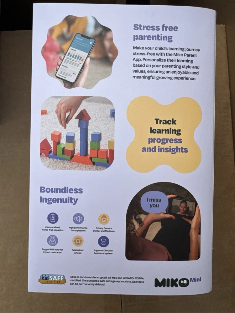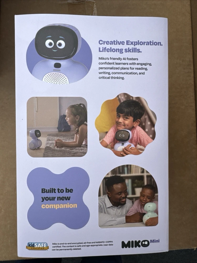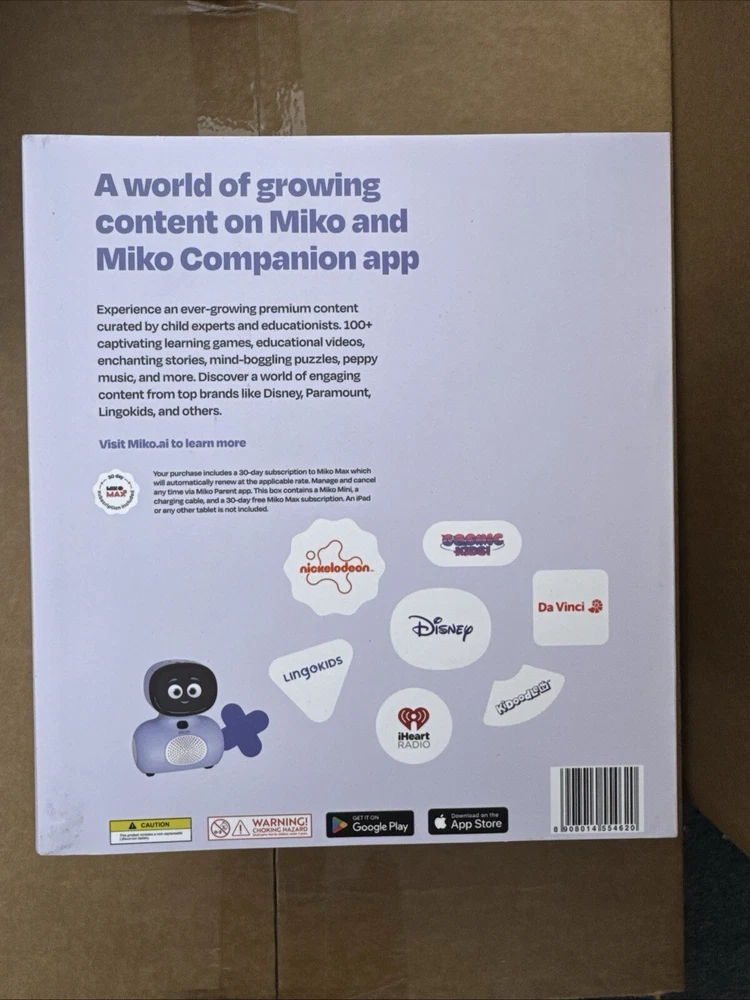 Miko Mini: The Voice First AI Learning Coach - Purple- SEALED FREE SHIPPING Introducing Miko Mini, the voice-first AI learning coach designed to help children explore and learn about science and nature. With a vibrant purple color and brand new sealed packaging, this educational toy is the perfect addition to any young learner's collection. Featuring the latest technology in voice recognition and natural language processing, Miko Mini is able to answer questions, provide educational content, and even sing songs to entertain your child. Whether your child is just starting to learn about science or is already a budding expert, Miko Mini is the perfect learning coach to help them explore and discover new things. Get yours today with free shipping included! Product Details Ignite your kid's curiosity and STEAM skills with this absolutely fun Miko Robot Mini AI Adaptive Learning Robot For Kids. FEATURES Offers meaningful interactions, realistic reactions, impressive dance moves, and engaging educational STEAM content Powered by deep-learning AI, Miko continuously learns more about your child every daye into the wonders of the world ADAPTIVE LEARNING: Miko's advanced AI nurtures children's confidence in learning. It crafts personalized plans that encompass reading, writing, math, and communication, enhancing their critical thinking skills. With Miko, every child embarks on a tailored educational adventure, ensuring a holistic development. EXPLORE WITH MIKO: Miko Mini transports the world straight into your home, offering content handpicked by international experts. It introduces young minds to varied cultures, ideas, and breakthroughs, setting them up for a world without borders. Enjoy exclusive content from renowned brands like Paramount Consumer Products, and Disney, easily accessible on tablets, iPads, and more. SOCIAL & EMOTIONAL DEVELOPMENT: Miko Mini, the cool robot buddy that makes learning super fun! It's not just about books and numbers—Mini also helps kids become social superstars. Imagine boosting positivity, self-esteem, developing empathy and understanding emotions—Mini got it covered! A personalized wholesome experience for kids development. SAFE FOR KIDS: A closed system with enhanced encryption ensures that every byte of your family's data is protected. ENDLESS FUN: There's never a dull moment with Miko Mini! It's constantly exploring for fun, prompting you to play and encouraging you to think critically. From fun facts and stories to fresh daily activities, Miko Mini keeps you on your toes as you dance, joke and learn hours away. A best friend you’ll love. STRESS FREE PARENTING: The Miko Parent App streamlines your parenting journey. Set goals for your kids that align with your unique parenting style and values. With the App, you can track progress through analytics, customize settings, and ensure security. MOVE WITH MIKO: Equipped with a wide-angle HD camera and high-tech sensors, this robot’s ready to roll. Filled with AI-infused twists on classic games like Freeze Dance and Hide and Seek, Miko keeps kids moving and turns playtime into a full-on dance party. PLAYFUL SIDEKICK: Beyond the books, Miko Mini encourages dance, play, and interactive adventures, ensuring a balanced blend of mental and physical growth. TRUSTED BEST FRIEND: Sharing captivating tales and unraveling mysteries, it ensures every day is an adventure, keeping your child engaged and entertained. Miko Max Subscription: Start with a 30-day free trial to explore our exclusive features. After the trial, continue with a 1-year paid subscription designed for kids aged 5-10. Enjoy engaging, kid-friendly content, interactive games, and educational materials through the Miko Max Companion App. WHAT'S INCLUDED Robot USB Type C charging cable and manual DETAILS 6.7"H x 5.3"W x 4.6"L Weight: 1.32 lbs. Cord length: 39.37-in. Electrical power: 5 volts Uses one lithium ion rechargeable battery (included) Rechargeable battery battery life: 3 hours Rechargeable battery charge time: 1.5 hours WIFI and Bluetooth wireless WIFI frequency band: 2.4GHz - 5GHz / BLE frequency band: 2.4 GHz - 2483 GHz Video resolution: 2 megapixels Operating system: LINUX USB Type C charging port Audio output: 15 watts ABS, rubber Temperature user guidelines: 32 degrees F - 104 degrees F · · · SHIPPING · · · Get free shipping on your order! We ship via reliable carriers like UPS, FedEx, and USPS We ship to the continental US (excluding PO boxes and APO/FPO addresses) Orders are usually shipped within 3 days or less. Items valued at $50 or more are subject to signature request. High value/special items are recorded with images by their unique serial number. Tracking number is sent personally to each customer. · · · RETURNS · · · Returns are accepted within 7 days of purchase Items must be in original condition and packaging- NO EXCEPTIONS · · · PAYMENTS · · · We accept all payment methods through eBay's payment system Please pay promptly after winning an auction so we can ship your item faster · · · FEEDBACK · · · Customer satisfaction is a top priority for us. If you have any issues with your order, please let us know. We will make every effort to resolve any problems and ensure you are satisfied. · · · Contact US · · · We appreciate your business. If you have any questions, please message us through eBay and we will respond within 24 hours on weekdays. Feel free to browse our eBay store for other available items. Thank you again for choosing to shop with us! · · · Suggested Products · · · Miko Mini: The Voice First AI Learning Coach - Blue- SEALED FREE SHIPPING $50.00 Razer Kaira Wireless Gaming Headset for Xbox Series X/S Black/Green NEW Sealed $69.00 Hasbro Star Wars The Black Series Darth Revan Force FX Elite Lightsaber $100.00 Banpresto Dragon Ball Super Super Hero Dxf Son Gohan Beast - Damage Box $28.00 NECA Teenage Mutant Ninja Turtles 1/4 Scale Figure Giant SIZELeonard- INCOMPLETE $75.00 NECA Fredd