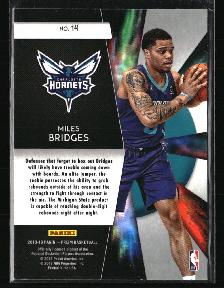 League: NBA Manufacturer: Panini Prizm Season: 2018 Team: Charlotte Hornets Card Number: 14 Sport: Basketball Set: Panini Prizm Autographed: No Graded: No Parallel/Variety: Freshman Phenoms Year Manufactured: 2018 Player/Athlete: Miles Bridges Type: Sports Trading Card