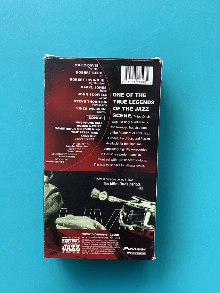 Experience the magic of Miles Davis Live In Montreal 1985, a full-screen edition VHS tape that captures the essence of the iconic jazz musician's electrifying performance. The tape features a rating of NR and showcases Davis in his prime, delivering an unforgettable musical experience. This VHS tape is perfect for fans of Music & Concerts and is a must-have addition to any collection. The studio behind the tape is Pioneer, ensuring top-quality sound and visuals. Don't miss out on this rare opportunity to own a piece of music history.