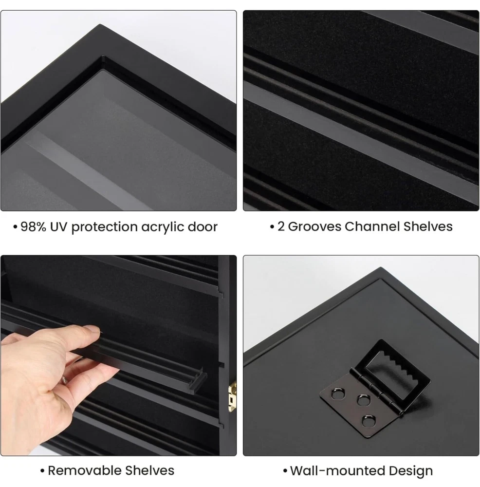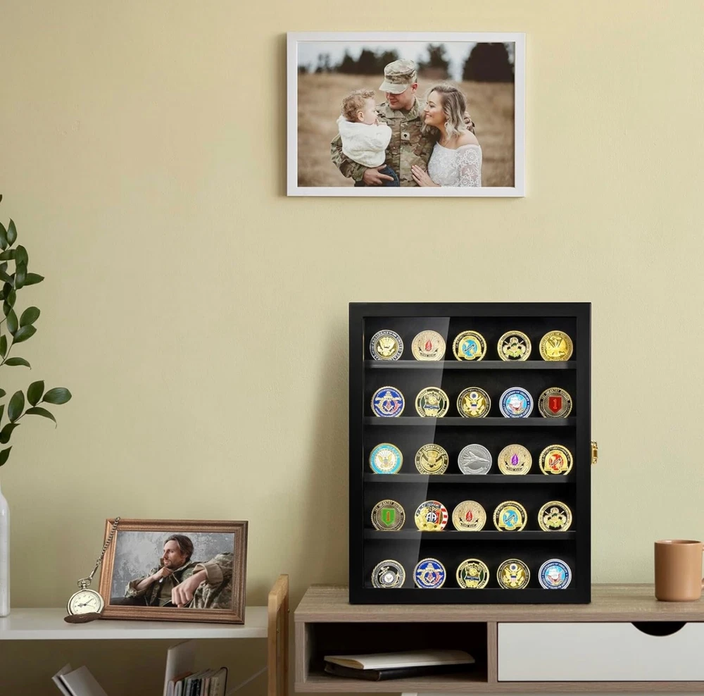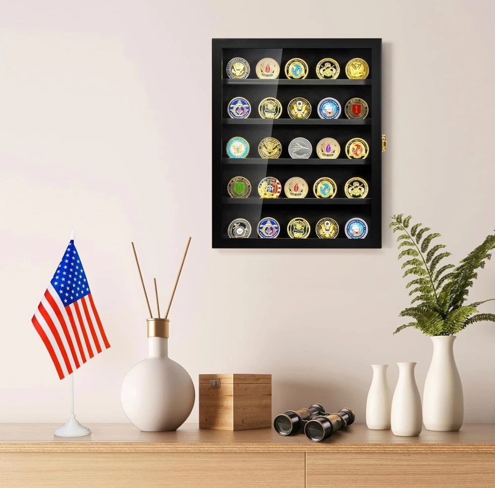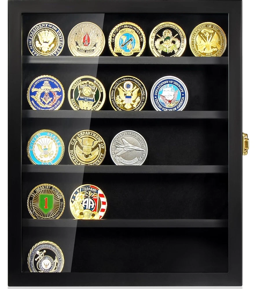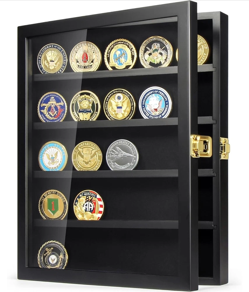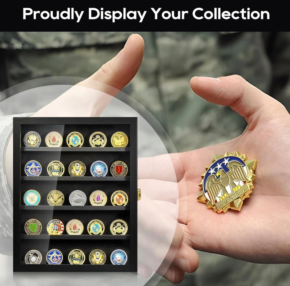 Military Challenge Coin Display Case - Wall Mount Shadow Box with Shelves Showcase your collection with this elegant Military Challenge Coin Display Case, designed to highlight coins, medals, pins, badges, and more. Perfect for military enthusiasts, collectors, or as a thoughtful gift for veterans. Features: • Premium Design: Crafted from durable materials with a sleek finish to enhance your display. • Removable Shelves: Customize the layout to fit coins, medals, buttons, or other memorabilia. • Wall Mountable: Easily hangs on the wall for a space-saving, eye-catching presentation. • Secure Closure: Front door with a transparent cover keeps your collection dust-free and visible. • Versatile Use: Ideal for displaying military challenge coins, pins, badges, or small keepsakes.