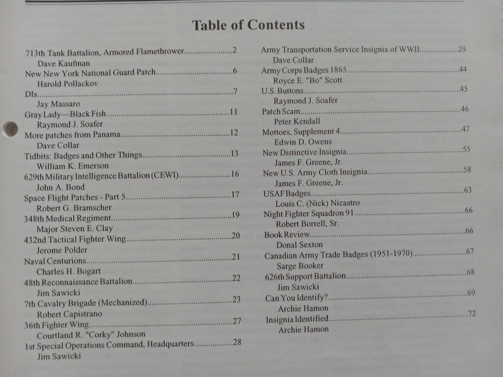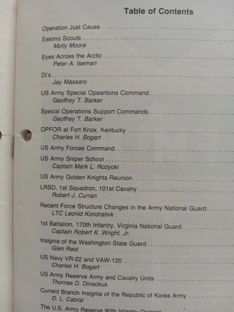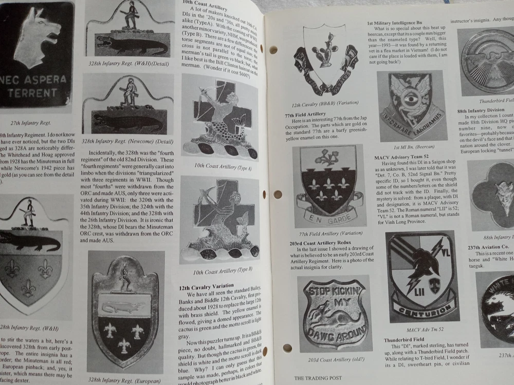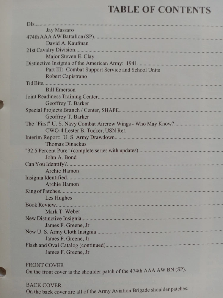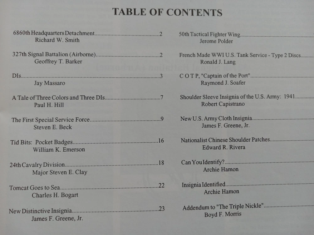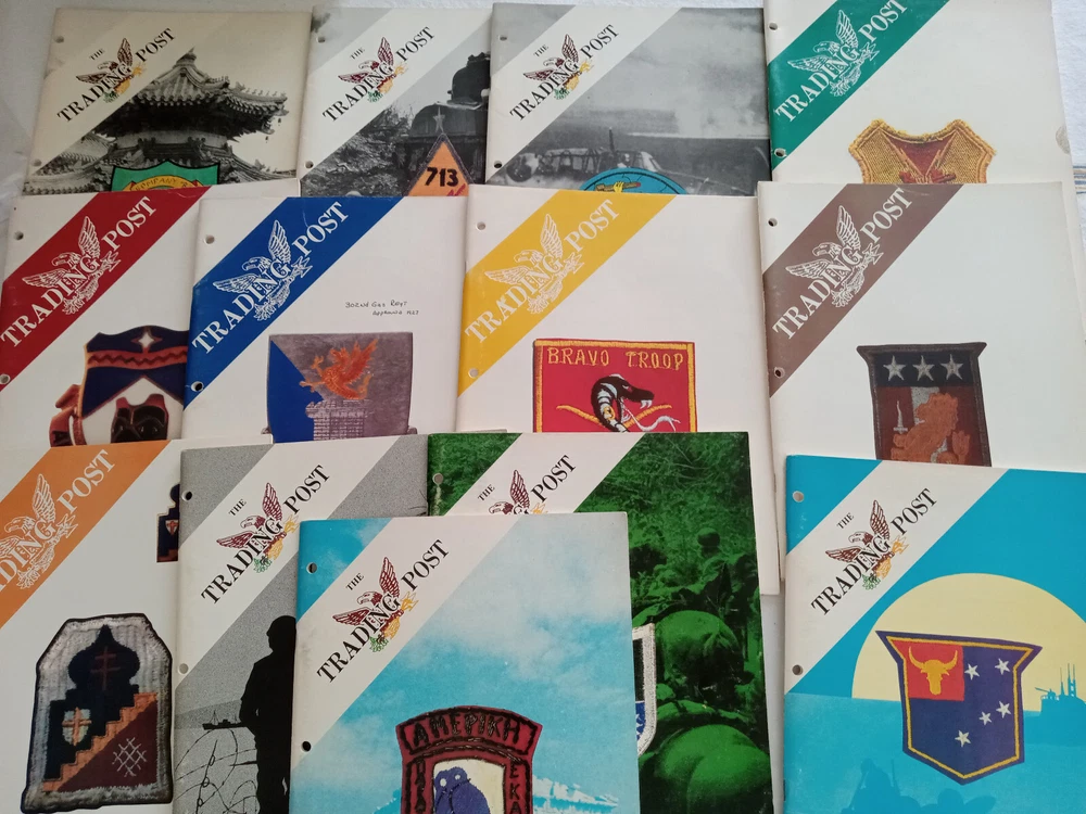 Big lot of 13 issues of The Trading Post from the American Society of Military Insignia Collectors. PACKED with information and images of all kinds of, primarily US, insignia and military history. These date from 1990 to 1995. There are 3 from 1990; 2 from 1992; 3 from 1993; 3 from 1994; 2 from 1995. Table of Contents pictures listed to show the wide variety of information in each issue! As shown. Good general condition with minor to moderate wear, minor blemishes. Some extra wear and blemishes to cover edges and along the spine.