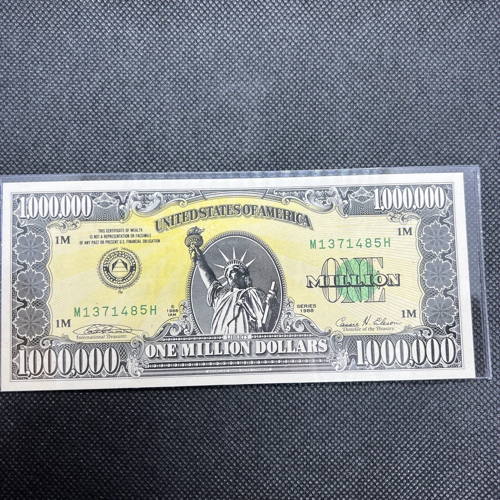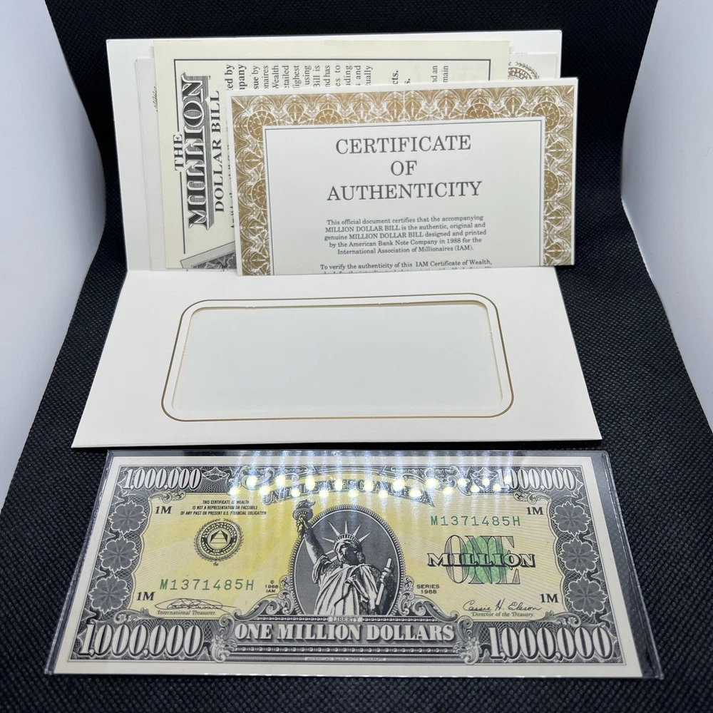 Million Dollar Bill - IAM Collector Series 1988 With Cert of Auth & Paperwork "The Million Dollar Bill" was designed and Printed by the American Bank Note Company for the International Association or Millionaires (IAM). This unique Million Dollar Bill is from a Limited Edition of Bills that were printed in serial number sequence and officially issued by the IAM as a collectors series (1988 A). The Bill comes in a display folder and the story behind this extremely interesting symbol of the American dream! This bill's serial number is M1371485H. What a gift for the holiday!