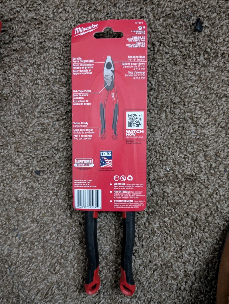 The MILWAUKEE® 9” Lineman’s Pliers (USA) deliver the easiest cuts and a lasting edge for the professional user. These pliers are designed with an optimized pivot point to provide the best leverage for tough cuts through materials like ACSR, hard wire, and soft wire. The cutting pliers feature laser-hardened edges and teeth for a long cut life and maximum grip. The Lineman’s Pliers are engineered to deliver the smoothest open and close experience from the start with no break-in period required. For additional versatility, these Lineman’s Pliers include a reaming head for ½-inch to 1-inch conduit and a fish tape puller. These pliers are tether ready and offered in both dipped grip with a split-ring hole and comfort grip with a lanyard hole. The Milwaukee® Lineman’s Pliers are made in USA with best-in-class manufacturing technology and USA-sourced materials, including durable, press-forged steel, and are backed by a complete Lifetime Guarantee. Best leverage for tough cuts Long life laser hardened edge and teeth Smoothest open and close Durable, press-forged steel Reaming head for ½-inch to 1-inch conduit Fish tape puller Tether ready Available in comfort and dipped grip handles Lifetime guarantee Made in USA with USA sourced materials