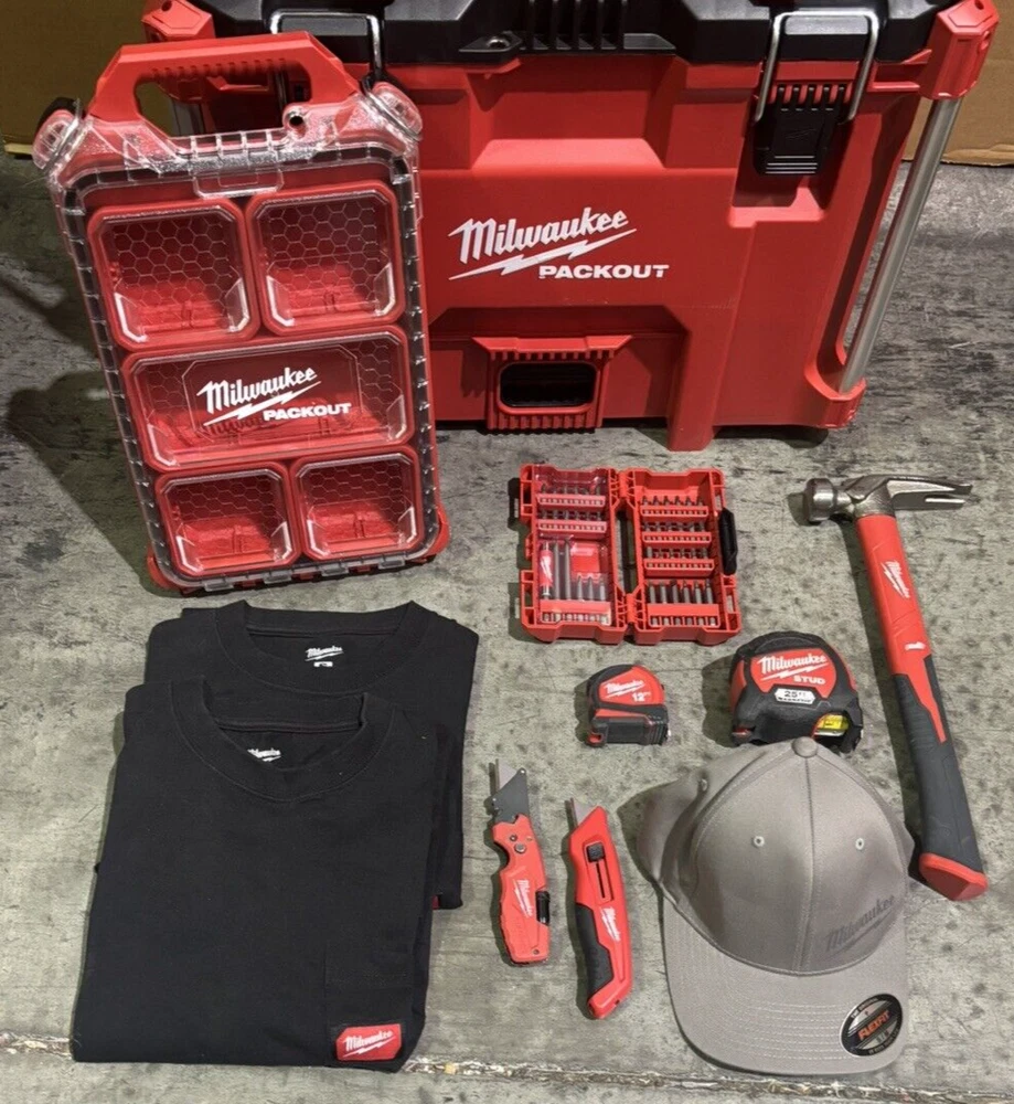 No Returns allowed due to shipping costs. Shipping Charges: $50 shipping cost will be added to your purchase. 3x 22 in. XL Tool Box and 19 in. Tool Tray The Milwaukee PACKOUT XL Tool Box is constructed with impact-resistant polymers and metal reinforced corners to withstand harsh jobsite conditions. the tool storage solution connects with all other PACKOUT system components via integrated locking cleats and has a 100 lbs. weight capacity. This extra-large tool box has an IP65 rated weather seal that protects tools and accessories from rain and other jobsite debris. the interior organization tray keeps users' equipment organized to fit their needs. the PACKOUT modular storage system allows users to customize and build their storage system to easily transport and organize tools and accessories. Milwaukee PACKOUT is the industry's most durable and versatile storage 2x Knives 2x Milwaukee Shirts Various Color/Sleeve/ Small 2x Milwaukee Tape Measure 3x White Helmets 48-73-1201 Bits Hammer Hat S/M Compact low-profile organizers