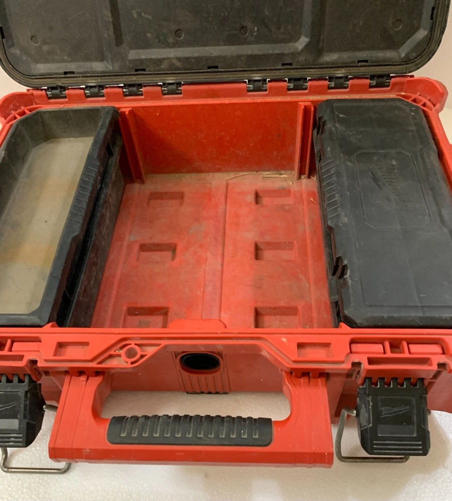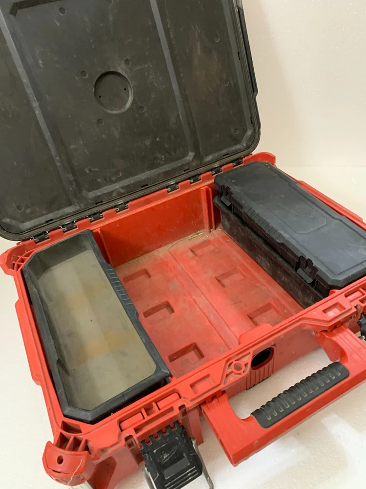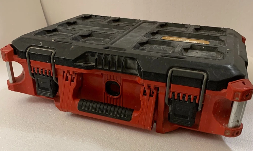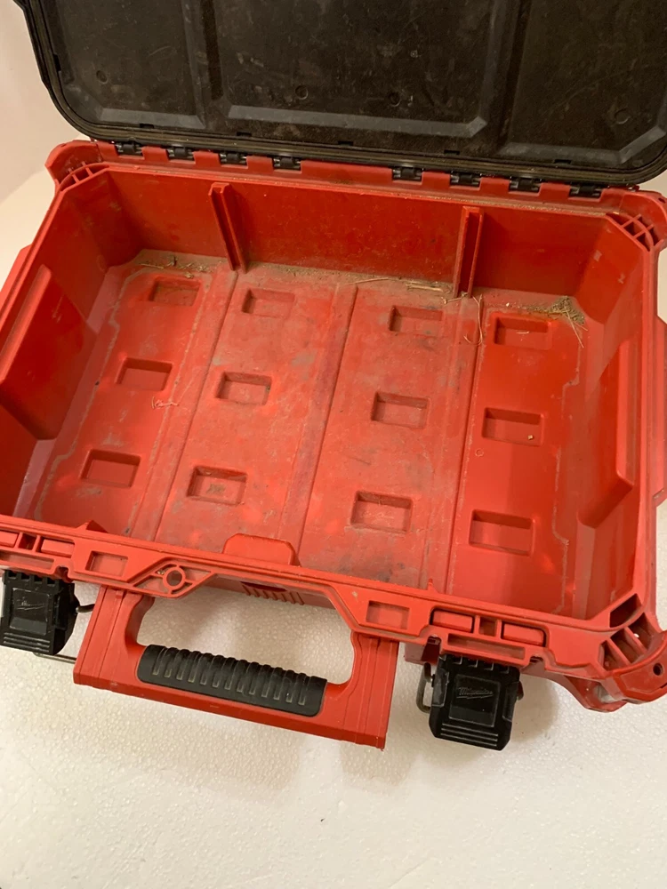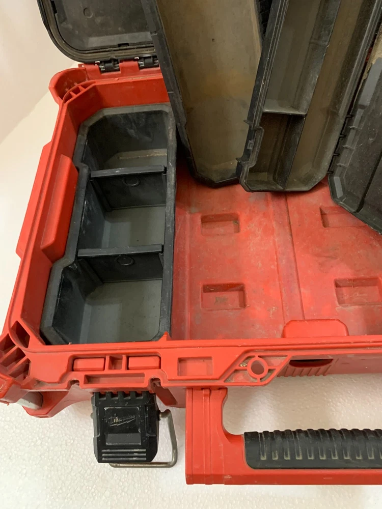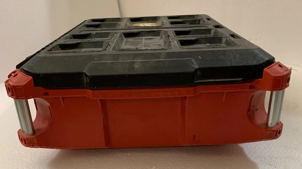 Item Weight: 11# Number of Drawers: 1 Brand: Milwaukee Type: Tool Box Item Height: 6.5" Number of Items: 5 Item Length: 22" Color: Red Features: Adjustable Item Width: 16" Model: GRAPHITE 58G015 Size: Medium Capacity: 50 lb Seller Notes: “bumps and bruises, but solid” Country/Region of Manufacture: United States Finish: Matte