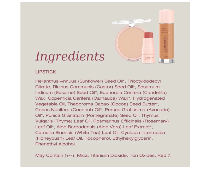 Color Charming Item Form Crayon Finish Type Glossy Product Benefits Hydrating,Softening,Long Lasting,Freshening,Brightening,Long-lasting,Hypoallergenic Coverage Medium or Full Vitamins C and E protect delicate lips against free radical damage. Resists smudging and feathering. Long lasting luxurious color. PURE INGREDIENTS – Mineral Fusion only uses pure ingredients from refreshing botanicals and minerals. It is 100% vegan and free from Gluten, Talc, Paraben, and Phthalates. Additionally, this product is cruelty free and hypo-allergenic. From the manufacturer We Leave Your Skin And Hair In Better Condition Than We Found It. Mineral Fusion products are a fusion of rich pigments and natural high performing ingredients, that focus on correcting flaws, not just covering them up. Luminous Color for your Lips Lip Pencil, Lipstick Butter, Lipstick, Lip Gloss & Liquid Lip Gloss Lip Pencil: Adds more definition, more color, and more lip fullness. Lipstick Butter: The do-everything balm + gloss. Lipstick: Vivid, smudge-free color, without all the toxic ingredients. Lip Gloss: All the shine and none of the stick. Liquid Lip Gloss: Lush, sheer color glides on lips with a smooth, ultra-glossy finish. Everything to Feel Good About: Hypoallergenic, Cruelty Free, Vegetarian, Gluten Free, No Harsh Ingredients, Fragrance Free, Paraben Free, and Phthalate Free