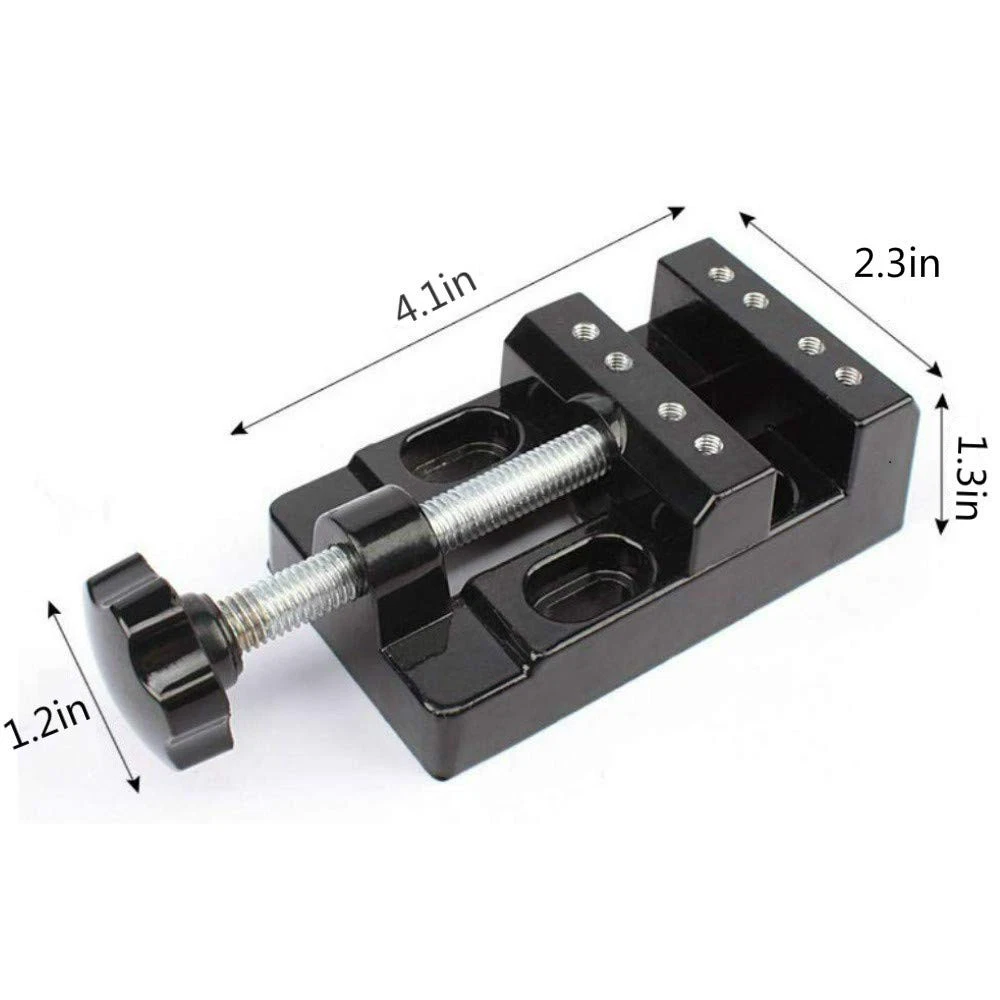 Mini Drill Press Hand Tool, Table Vice Clamp Material: Aluminum alloy Dimensions(L*W*H): 4.1 x 2.3 x 1.3inch Clamping Range: 0-2inch Function: The Mini Drill is useful for watch repairing, Sculpture, Craft, Jewelry and DIY Carving, and also suitable for fine carving, openwork carving, large chisel cutting, polishing machine and auxiliary fixing Package Includes: 1x Mini Bench Clamp with 4 x support columns, 2 x 2.3inch multi-purpose clamping block, and 4x fixed screws MULTI-FUNCTION: Ideal for holding small parts, Watch repairing, Sculpture, Craft, Jewelry and DIY Carving WIDE APPLICATION: The small drill press clamp supports 0-2.1 inch (0-55 mm), supports round, square and irregular objects PREMIUM QUALITY: Mini vise body is made of aluminum alloy, durable, light-weight and portable EASY TO USE: Handheld use, compact and handy, hold the item in position and prevent fingers from being hurt PACKAGE INCLUDED: 1x Mini Bench Clamp, 4 x support columns, 2 x 2.3 inch multi-purpose clamping block, 4 x fixed screws