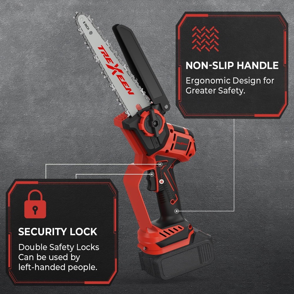 Mini Chainsaw for Milwaukee M18 Battery,8-Inch and 6-Inch 2-IN-1 Cordless Mini Chainsaw,Brushless for Electric Chain saw for Wood Cutting, Tree Trimming (Battery Not Included) Item Description About this item Compatible with Milwaukee M18 Batteries: Specifically designed for Milwaukee compatibility, making it easy to carry for outdoor tasks and home projects.This product does not include batteries. Safety Lock Feature: Equipped with a safety lock to prevent accidental starts, ensuring secure and safe operation for all users, especially beginners. 8-inch & 6-inch Dual-Length: Enjoy versatile cutting options with dual-length capabilities, allowing you to tackle various jobs efficiently. Powerful Performance: This mini chainsaw delivers robust cutting power, effortlessly handling gardening tasks, wood cutting, and more. User-Friendly Operation: Designed for easy use, the TREXEEN cordless mini chainsaw allows anyone, from DIY enthusiasts to professionals, to operate it with confidence.Perfect for gardening, home repairs, and DIY projects, this mini chainsaw is an essential tool for any toolkit. › See more product details *One Pair of Non-Slip Gloves and One Pair of Safety Glasses *One 8-Inch Blade and Chain, and One 6-Inch Blade and Chain The effective ventilation design automatically shuts off power when temperatures are too high, preventing motor burnout. The rechargeable chainsaw features a safety guard that protects you while cutting, logging, and pruning branches. It can rotate from 0° to 90°. The safety lock must be pressed before starting the chainsaw switch, eliminating concerns about accidental injuries. The widened hand guard provides greater coverage to better protect your hand from splashing debris or high-temperature sawdust Payment We accept payment only through PAYPAL Shipping We ship products worldwide through standard express courier service, it will reach within 7 to 10 days to abroad buyers, we ship the product after recieved clear payment and give full information about shipment to the buyer Return We accept product return within 7 to 21 days from delivery date but product should be in original position and not in damaged condition,the return shipping charges will be buyer responsibility