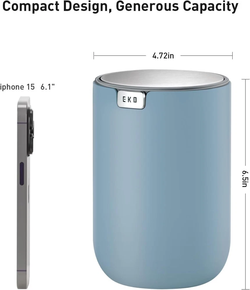 Finish types: Brushed Product Dimensions: 4.72"L x 4.72"W x 6.5"H Batteries required: No Finish Type: Brushed Country of Origin: China Item Length: Does not apply Brand: Does not apply Material: Acrylonitrile Butadiene Styrene Size: 0.4 Gal Recommended Uses For Product: Tabletop, Countertop, Vanitytop Item Width: Does not apply Room Type: Dormitory,Office,Room, Bathroom, Bedroom, Home Office, Study Room UPC: 313098892847 Unit Count: 1.0 Count Capacity: 1.5 Liters Special Feature: Portable, Removable Lid, Rustproof, Stain Resistant, Odor Seal Included Components: Instruction Manual Item model number: EK9206 Type: Does not apply Item Height: Does not apply gtin13: 313098892847 Color: Blue Opening Mechanism: Swing-Lid Shape: Cylindrical Item Weight: 11.2 ounces