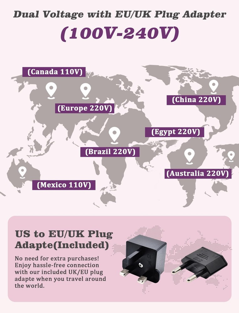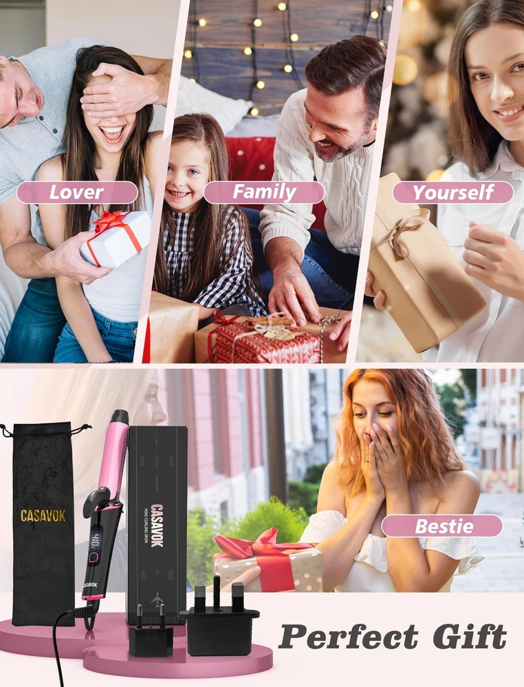 Transform your hairstyle with our Mini Curling Iron, designed for effortless curls on the go! This compact curling wand features advanced dual voltage technology, making it perfect for international travel. Whether you're in the UK or Europe, simply plug in and get ready to create stunning waves effortlessly. Key Features: Dual Voltage Compatibility:Automatically adjusts to 100-240V, allowing you to use it anywhere in the world without worrying about voltage issues. UK & EU Plug Included: Comes with interchangeable plugs, ensuring compatibility with both UK and EU outlets, making it your ideal travel companion. Compact Design:Lightweight and portable, this mini curling iron easily fits into your luggage or handbag, letting you style your hair anytime, anywhere. Fast Heating Technology: Heats up quickly to save you time, so you can achieve beautiful curls in minutes. Versatile Styling Options:Create a variety of curl styles, from tight ringlets to loose waves, suitable for any occasion. Safety Features:Includes an automatic shut-off function after 60 minutes of inactivity for peace of mind during use. Elevate your styling routine with our Mini Curling Iron—your ultimate solution for gorgeous curls at home or on your travels. Don't miss out on the perfect addition to your beauty toolkit!" 【30S Fast Heating Mini Curling Iron】Unleash Your Style with our rapid dual voltage curling iron! With lightning-fast heat-up technology, you can create stunning curls or waves in just 5 seconds!Our mini curling iron heats up rapidly, ensuring you can achieve salon-quality results without the wait. Enjoy instant heat-up—ready to use in just 30 seconds,perfect for those busy mornings. Adjust the temperature to fit your hair,you can experience curls that last all day and into the night. 【Dual Voltage&Auto-Off】Designed for worldwide use, this mini curling iron automatically adjusts to 100-240V, making it ideal for international travel.Just plug it in anywhere and get beautiful curls effortlessly!This small curling iron size 9.84*0.98inch means it fits perfectly in your suitcase or handbag.Say goodbye to bulky styling tools and hello to easy packing!Equipped with an automatic 60 mins shut-off feature for peace of mind, so you can use this mini curling iron without worrying about overheating. 【UK and EU Plug Adapters Included】Suitable for both UK and European outlets, you can seamlessly switch between UK and European outlets using our included adapter plugs. You don't have to worry about bringing a curling iron that won't work,effortless styling your hair! Whether you are traveling to London, exploring Paris, or enjoying a weekend getaway in Rome, this mini curling iron ensures salon-worthy curls wherever you are. 【5 Customizable Temperature Settings】With temperatures ranging from 250°F to 410°F, you can effortlessly tailor your styling experience to suit your hair's unique needs with this mini curling iron for short hair.Whether you're aiming for loose beachy waves, tight ringlets, or sleek curls, this curling irons for women has you covered!The intuitive digital screen lets you easily monitor and adjust the temperature, providing a seamless styling experience. 【Advanced Protective Coating】Say goodbye to bad hair days and hello to gorgeous, bouncy curls!Our mini hair curler is designed for effortless styling while prioritizing your safety.Our travel curling iron is equipped with a unique protective coating that minimizes heat damage and locks in moisture, ensuring your hair remains healthy and vibrant.Say goodbye to dull, damaged hair.Our portable curling iron combines style and care, giving you the confidence to flaunt beautiful curls without compromise. 【User-Friendly Design&Ideal Gift】Lightweight and ergonomically designed, our small curling iron provides a comfortable grip for easy styling.Plus, the swivel cord allows for tangle-free movement!Equipped with advanced heat protection features, our mini curling iron for short hair minimizes the risk of burns.Feel confident styling your hair without the worry of accidental injuries.Gift wrapping available! Whether for loved ones, friends or family members,ideal gift for birthdays, anniversaries.