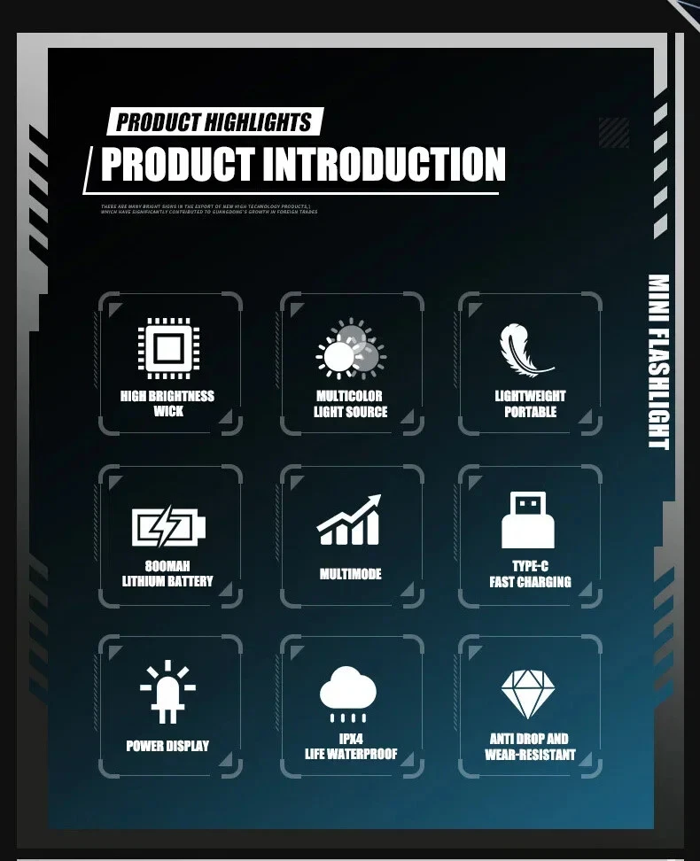 Product Description 【Super Bright Keychain Flashlight】 This clip flashlight has dual LED main lights that can produce up to 500 lumens. Lighting distance exceeds 98 feet/30 meters. IP65 waterproof, you can use it even when it rains (Please note: it cannot be immersed in water). Press and hold the switch for 2 seconds to turn it on, then press the button to switch the lighting mode. Press and hold for 2 seconds to turn it off. 【8 Modes Light Sources】 This keychain flashlight has 8 light modes. 4 Types of main lights: single source/strong light, single source/low light, dual source/strong light, dual source/low light. 4 Types of COB side lights: white /strong light, white/low light, red light, red and blue flashing light. Besides, the main light and COB light can work at the same time. Multiple light modes to meet your various needs. 【Lightweight & Compact Flashlight】 This clip on EDC flashlight has a mini body and a 2.4oz/43.5g weight. It can be hung on your keychain, very convenient for daily carry. The shell of the light is fixed with an aluminum alloy, which is very sturdy and shock-resistant. It is the perfect flashlight for daily use or emergency use. 【Extremely Long Working Hours】 This mini flashlight is powered by a rechargeable 750mAh lithium battery, which can provide ultra-long working time. Besides, this keychain light uses USB C fast charging (charging cable included) and can be fully charged in as soon as 2 hours. Moreover, the pocket light has battery indicator lights, which allow you to quickly know the remaining power. No longer worry about battery when you are outdoors. 【Magnetic & Clip on Flashlight】 This flashlight has a powerful clip on the back, which can be clipped on hats, clothes, and bag straps. Great for night running, hiking, exploring, fishing, camping, and more. It can also be used as a warning light for dog walking at night. There is a strong magnet at the tail, which can be used as vehicle repair lighting or as a warning light in emergencies. This flashlight also has a keychain hole, so you can hang it on your keys and take it with you every day. package include: 2 X Mini keychain flashlight 2 X Charging cable Payment Returns Contact Us Shipping Feedback 1. We only accept eBay payments. 2. All payments must be made within 3 days after auction won. Item may be returned for refund or replacement within 30 days of the purchase date. Returned merchandise must be unused, in original packaging and include all accessories. Shipping costs are non-refundable. Please do not hesitate to leave us your 5 Star ★★★★★ of DSR positive feedback if you are satisfaction with our products ,delivery or services . If you have Any Questions Or Unsatisfied with your purchase, please Email us firstly to get a better solution before you leave a neutral or negative feedback, we work hard to make sure every customer 100% satisfied and resolve anyproblem for you. Please email us first in the following situations: 1.The item can't work properly. 2.The item broken on the post. 3.You bought or received the wrong items. 4.You have not received your shipment within the period. 5.Before you give us Negative feedback. 6.Before you open a case/return on eBay. All questions will be replied within 24 hours (Except Saturday and Sunday or holidays). Thank you for your kindness! 1. eBay Payments Confirmed Addresses Only. 2. No Delivery to Alaska and Hawaii or PR. 3. No P.O. Box and APO/FPO Delivery. 4. Tracking Number will be provided. 5. Domestic shipping is within the 48 Contiguous States of United States, the delivery time is between 2 and 8 days. Items will be shipped by UPS, USPS or Fedex within 3 business day after receiving full payment. 6. International shipping is from China, the delivery time is between 10 and 30 working days. As a seller , Positive Feedback is very important to us. We try our best to let our customers to be happy. If you have any question about your order, please contact us ,please let us know before you Leave the Negative feedback ,We are willing to do our best to make up for it, Thank you very much ! Payment 1. We only accept eBay payments. 2. All payments must be made within 3 days after auction won. Returns Item may be returned for refund or replacement within 30 days of the purchase date. Returned merchandise must be unused, in original packaging and include all accessories. Shipping costs are non-refundable. Please do not hesitate to leave us your 5 Star ★★★★★ of DSR positive feedback if you are satisfaction with our products ,delivery or services . Contact Us If you have Any Questions Or Unsatisfied with your purchase, please Email us firstly to get a better solution before you leave a neutral or negative feedback, we work hard to make sure every customer 100% satisfied and resolve anyproblem for you. Please email us first in the following situations: 1.The item can't work properly. 2.The item broken on the post. 3.You bought or received the wrong items. 4.You have not received your shipment within the period. 5.Before you give us Negative feedback. 6.Before you open a case/return on eBay. All questions will be replied within 24 hours (Except Saturday and Sunday or holidays). Thank you for your kindness! Shipping 1. eBay Payments Confirmed Addresses Only. 2. No Delivery to Alaska and Hawaii or PR. 3. No P.O. Box and APO/FPO Delivery. 4. Tracking Number will be provided. 5. Domestic shipping is within the 48 Contiguous States of United States, the delivery time is between 2 and 8 days. Items will be shipped by UPS, USPS or Fedex within 3 business day after receiving full payment. 6. International shipping is from China, the delivery time is between 10 and 30 working days. Feedback As a seller , Positive Feedback is very important to us. We try our best to let our customers to be happy. If you have any question about your order, please contact us ,please let us know before you Leave the Negative feedback ,We are willing to do ou
