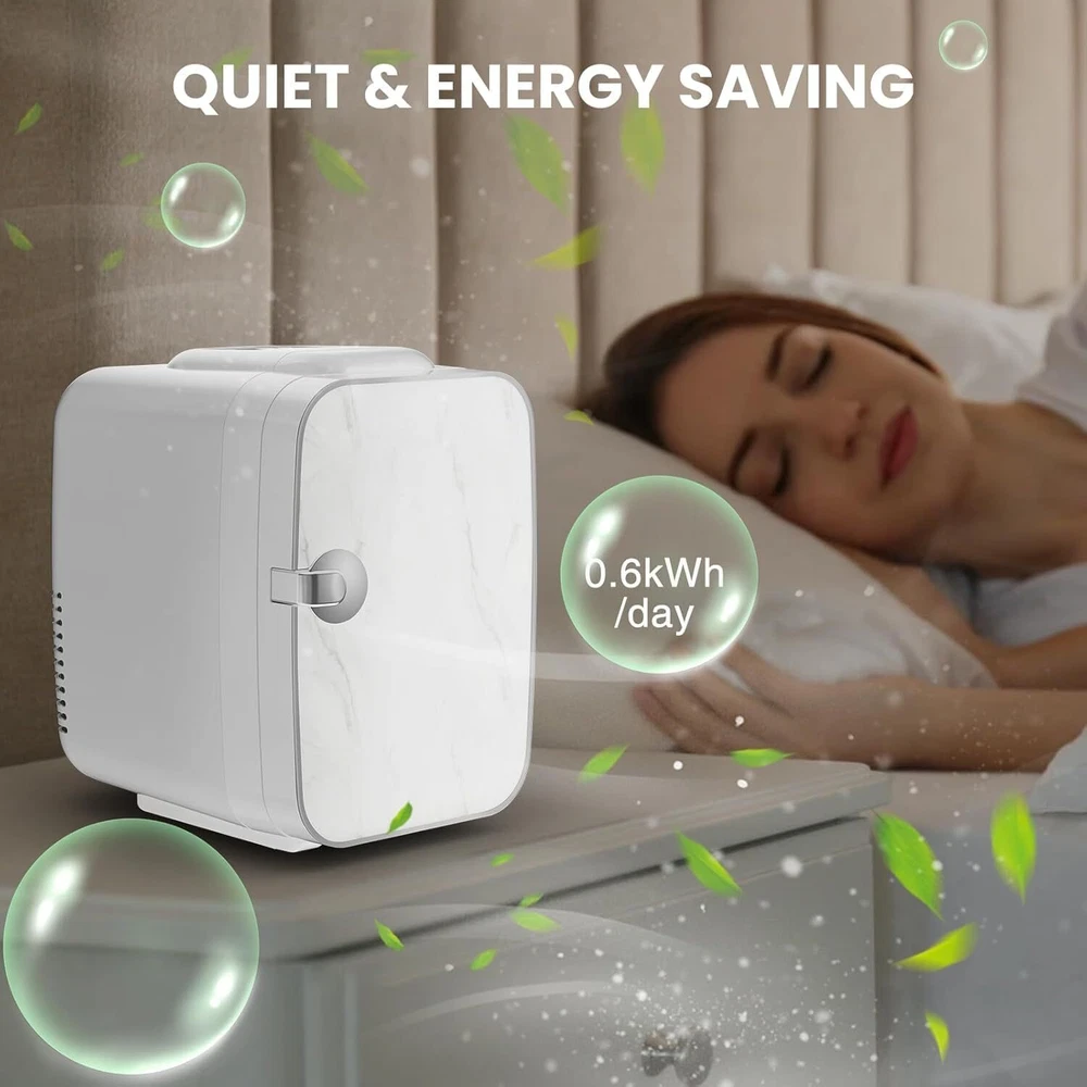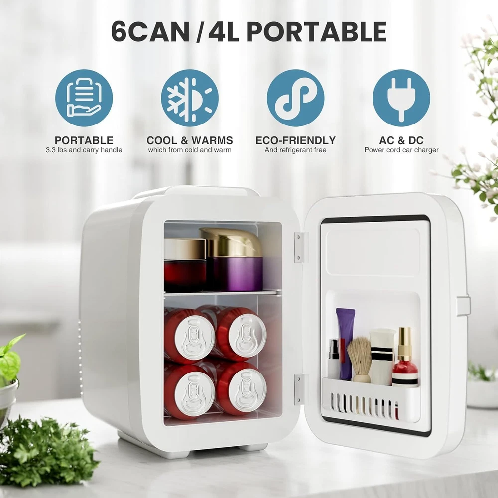 Whether you're looking for a mini fridge for your bedroom, office, or dormitory, our versatile mini refrigerator offers unmatched convenience and style.This mini fridge is perfect for keeping your beverages, snacks, skincare products, and more cool and fresh.Constructed with a sleek, modern design, this mini fridge seamlessly fits into any decor, making it an ideal addition to your living space. The spacious interior ensures ample storage capacity, with adjustable shelving to accommodate a variety of items.Our mini fridge is perfect for skincare enthusiasts, offering the optimal temperature for preserving your beauty products. Its compact size makes it an ideal skincare fridge, ensuring your cosmetics are always fresh and ready to use. The mini fridge also features a quiet operation, minimizing noise disturbance in your bedroom or office. This mini fridge is not only functional but also stylish. Designed for versatility, this mini fridge can also be used in a variety of settings. Its compact and portable design makes it perfect for outdoor activities such as camping, picnics, and road trips. The mini fridge is equipped with both AC and DC power cords, allowing you to use it in your car or RV. Furthermore, the mini fridge is energy efficient, helping you save on electricity bills while minimizing its environmental impact. Cold and Warm Dual Use:Switch between hot and cold modes by adjusting the buttons on the mini fridge with precise temperature control, cooling at 32° F and heating at 131° F. This mini refrigerator is ideal for storing lunch, drinks, breast milk, cosmetics, and skincare products. Compact and Portable: With a 4-liter capacity that holds up to six 12-ounce cans of soda, this compact refrigerator is everything you need for convenient storage, and it comes with a removable shelf and convenient carrying handle for added convenience. Home and Car Use: fridge is equipped with a household power cord (AC-110V) and a car power cord(DC-12V)-- simply plug the unit into the 12V DC adapter of your car's cigarette lighter. Low Noise&Low Power:New noise reduction technology reduces the noise level of the skin care refrigerator to 25 decibels and is less powerful than most laptops, making it ideal for bedrooms/offices/nursery rooms. Environmentally Friendly: Skin Care Refrigerators use advanced semiconductors that are CFC and refrigerant free, making them better for the environment.