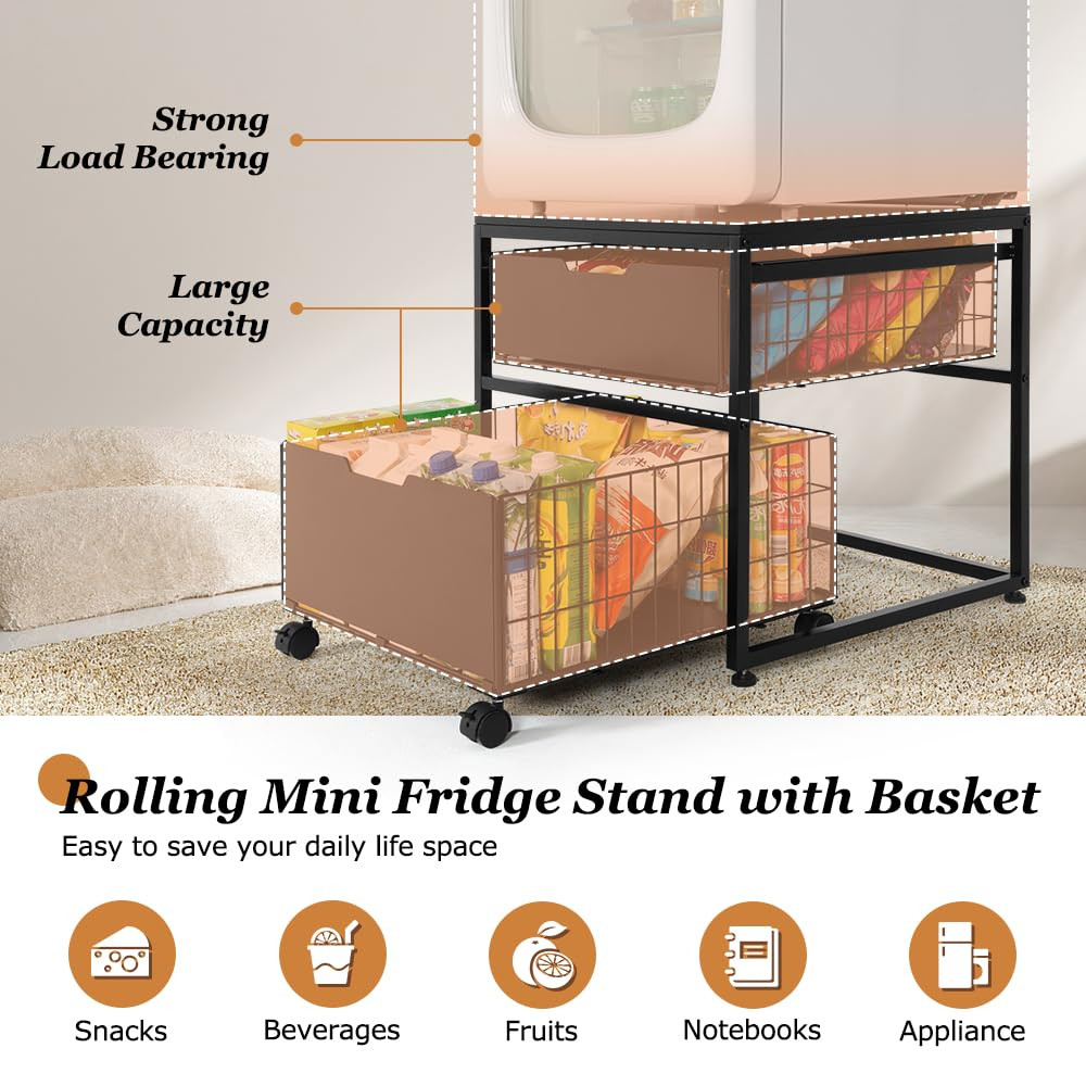 STURDY AND HEAVY DUTY: This mini fridge table is made of high-density thick wood and highly resistant metal, the sturdy frame construction ensures the sturdiness. And the tabletop of the mini refrigerator cart can hold up to 100lbs. INTIMATE DETAIL DESIGN: The mini fridge cabinet's just-right height design and the curved design of the drawer not only make it easy to access the items, but also do not pinch the hands, providing a safety protection for your family. ROLLING MINI FRIDGE STAND: Come with 4 adjustable feet that won't scratch your floors as well as the freedom to adjust the height. And the metal basket of fridge table comes with 4 wheels that allow you to easily move anywhere in your room. LARGE CAPACITY: Mini refrigerator rack has large capacity metal baskets holds up to 66 pounds that can provide additional storage space for beverages, snacks, and other small items. The drawers create extra storage for your daily life and help you make the most of your vertical space. AFTER SERVICE: 21.7” L x 21.7" W x 22" H. This fridge storage organizer is suitable for office, kitchen, bedroom, dorm and living room etc. Feel free to ask any questions to ensure the refrigerator stand comes exactly as you expect it.