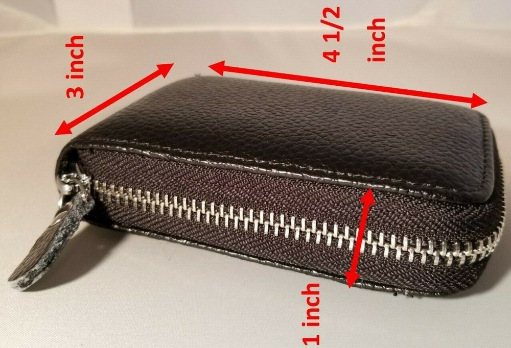 Perfect mini genuine leather wallet that will fit almost anywhere! Genuine leather/ coffee Minimal/efficient design Individual Space/slots for 10 credit cards, plus 2 slots for cash, business cards, checks..... 2 outside slots for Id/Drivers License.... measures: 4 1/2 x 3 x 1 inch seals inside with zip around construction/feature See pics for details!!! This is truly a perfectly constructed mini wallet that will hold all you need to take with you without bulk.