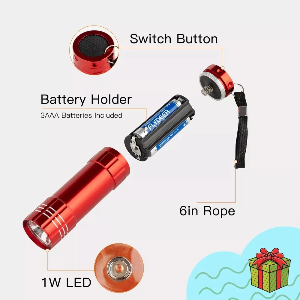 This is a new type mini flashlight, COB LED, softer and higher color rendering.As an upgraded version, it has a greater value.New version features- Small but bright (Max 100 Lumen)- Wider lighting of 30 ft- 3×AAA Batteries will give you up to 2.5 hrs bright lighting. Or Last a couple of weeks with normal daily use.- Compact Design – Small and Light weight.(3.4in length,1in wide,1.6 oz)-With lanyard, easy to carry.PACKAGE CONTENTS- 6x Mini LED Flashlight-18x AAA batteriesRETURN POLICY- One year warranty and replace for free New COB LED, softer and higher color rendering,brightness 100 lumen. Light distance is 10 Meter(30ft ) Small and Lightweight- It is compact enough to fit in your pocket,car glove box,toolbox,nightstand or purse,ideal for home use,dog walking,camping and party decoration. Easy To Use And Long-Lasting: Simple on/off push button operation and 3x AAA Batteries up to 2.5 hours of lighting, or normal use for several weeks.(Batteries included) Assorted Colors: Red,Green,Pink,Blue,Orange,Purple. Aluminum Shell. Includes 6 Flashlights and 18 Batteries- Keep one in your car, one in your home, or gift one to a friend or family member. LED number:9 Size:87 X 26mm(L*D) Money device Super bright and high quality Power by:3 x AAA batteries included Light source: Hydraulic leak measurements and biometric testing 8 x 9 LED Flashlight Detect metal cracks Ink curing Material:Aluminum alloy Size:87 X 26mm(L*D) Measurements And Biometric Testing LED Number:9 Hydraulic Leak 8 X 9 LED Flashlight