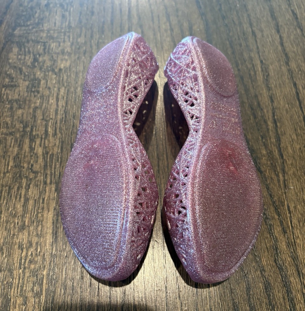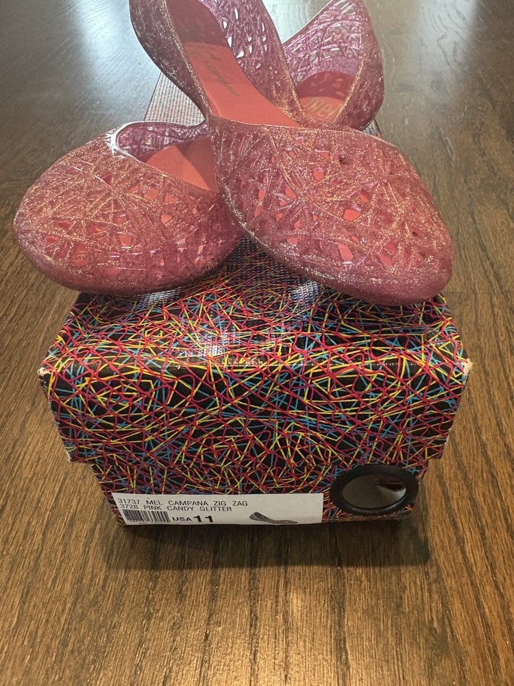 Mini Melissa CAMPANA ZIG ZAG PINK CANDY GLITTER Size 11 (girls/kids) BB2 The Mini Melissa CAMPANA ZIG ZAG PINK Girls Jelly shoes in size 11 are a stylish and comfortable choice for young girls. These low-top flat shoes feature a solid pink color with a glitter accent, perfect for casual occasions during the summer and spring seasons. The rubber outsole provides durability, while the flat heel ensures all-day comfort. With the signature Melissa Campana model and the UltraGirl product line, these shoes combine fashion with functionality for a great addition to any little girl's wardrobe.
