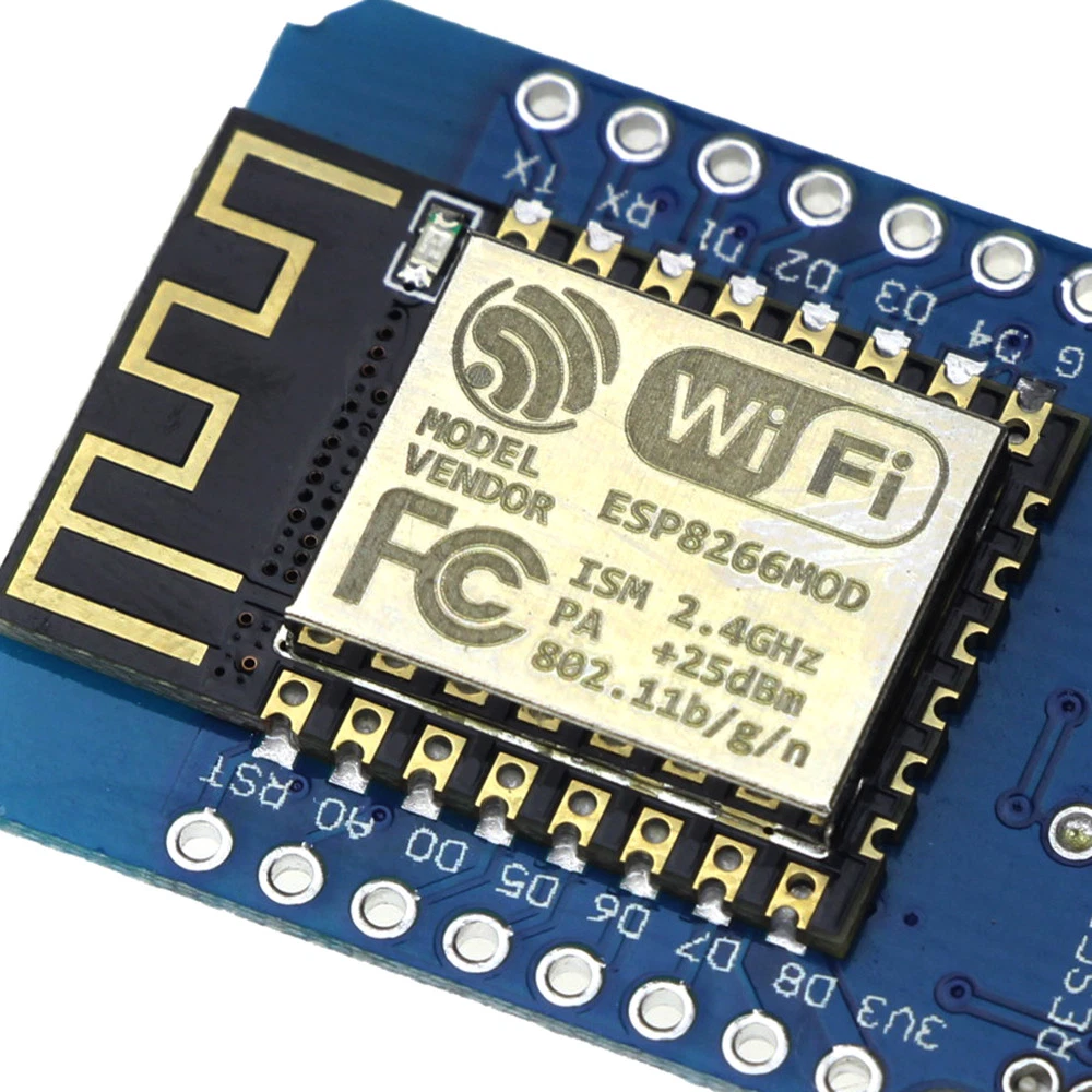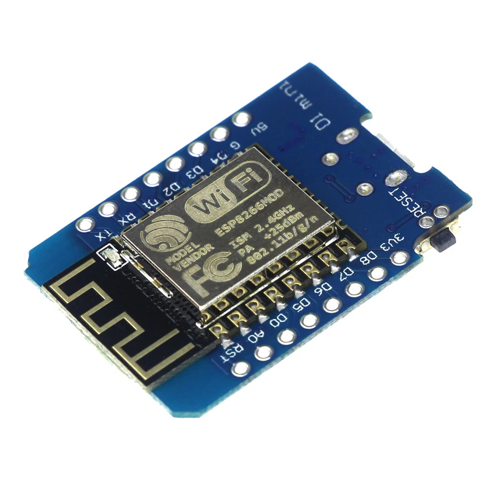 Mini NodeMcu 4M Lua WIFI IoT development board based ESP8266 for D1 mini The D1 mini NodeMCU is a mini wifi board based on ESP-8266EX. 11 digital input/output pins, all pins have interrupt/pwm/I2C/one-wire supported(except D0 ) 1 analog input(3.2V max input) A Micro USB connection Compatible with Arduino Compatible with N odemcu lots of Shields Technical specs Microcontroller ESP-8266EX Operating Voltage 3.3V Digital I/O Pins 11 Analog Input Pins 1(Max input: 3.2V) Clock Speed 80MHz/160MHz Flash 4M bytes Length 34.2mm Width 25.6mm Weight 10g Pin Pin Function ESP-8266 Pin TX TXD TXD RX RXD RXD A0 Analog input, max 3.3V input A0 D0 IO GPIO16 D1 IO, SCL GPIO5 D2 IO, SDA GPIO4 D3 IO, 10k Pull-up GPIO0 D4 IO, 10k Pull-up, BUILTIN_LED GPIO2 D5 IO, SCK GPIO14 D6 IO, MISO GPIO12 D7 IO, MOSI GPIO13 D8 IO, 10k Pull-down, SS GPIO15 G Ground GND 5V 5V - 3V3 3.3V 3.3V RST Reset RST All IO have interrupt/pwm/I2C/one-wire supported(except D0) Long female pins x 2pcs Short female pins x 2pcs Normal pins x 2pcs D1 mini NodeMCU x 1pcs