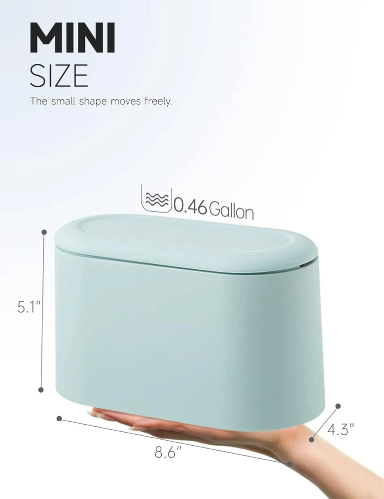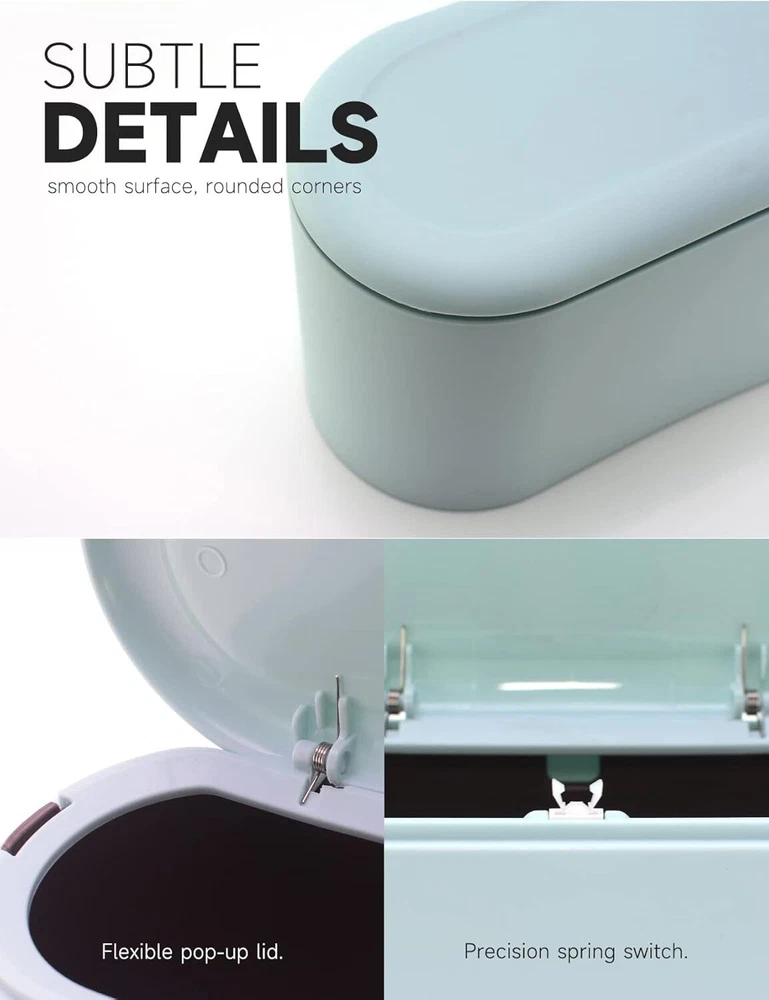 Product Description Mini Size The small shape moves freely. Liner Design Hide the garbage bag, Easy to replace. Pop-up design Simply tap the button to open or closed the lid. Wide Usage In The Dresser Table Store garbage after makeup. In The Kitchen Countertop Store kitchen waste. In The Office Desk Store desktop garbage, such as coffee capsules, waste paper, etc. In The Laundry Room Store lint (lint bin).