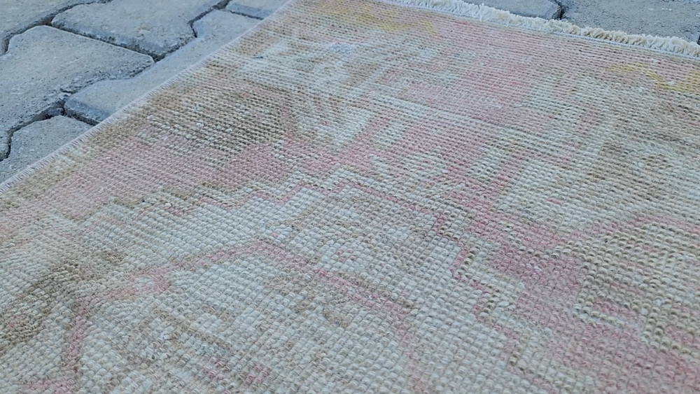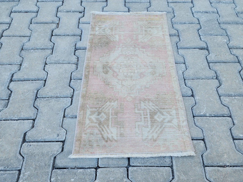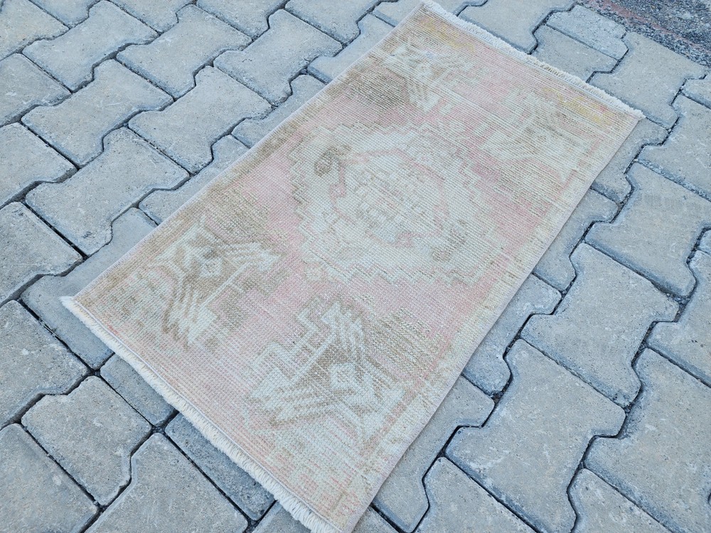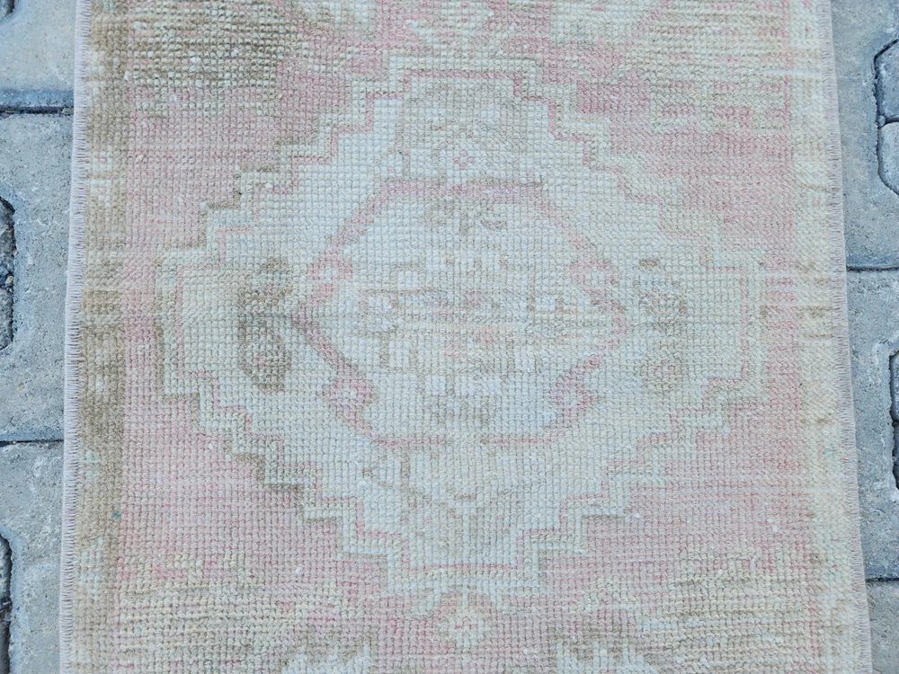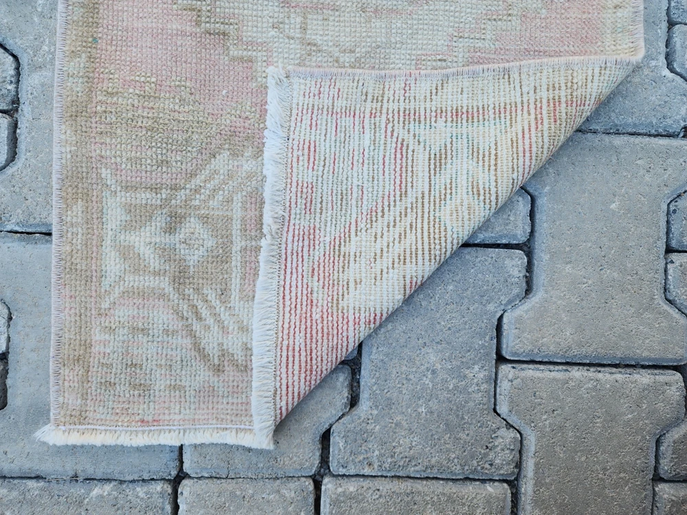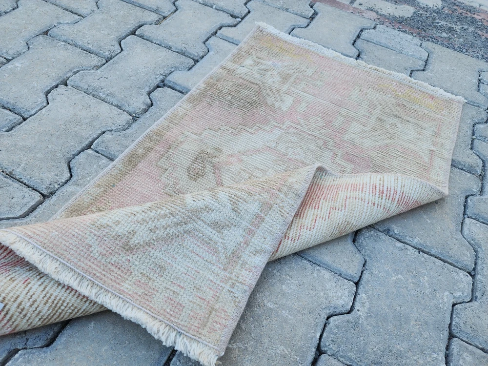 Mini Turkish Oushak Rug β 1.6x2.7 ft, Washed Beige & Blush, Faded Geometric Medallion Soft Vintage Handwoven Rug β Subtle Boho Accent for Entryway or Decor Corners This charming vintage Turkish rug showcases a gently faded beige base with soft blush and light green accents. A large central geometric medallion is framed by corner motifs in muted earthy tones, giving the rug a subtle and airy character. Perfectly distressed for a modern vintage look. Handwoven from wool and vegetable-dyed yarns, this piece is ideal for cozy entryways, bohemian decor corners, or as a delicate accent in bedrooms and hallways. Product Details: π Origin: Turkey π Material: 100% wool, vegetable dyes π Weaving: Hand-knotted vintage rug π Pattern: Geometric medallion with traditional corner motifs π Colors: Beige, blush, pale green, washed brown π Condition: Distressed / gently faded π Size: 48 x 84 cm (1.6 x 2.7 ft) π Shipping: Free worldwide shipping in 1β3 business days π Returns: 30-day return policy π¬ Feel free to message us with any questions!