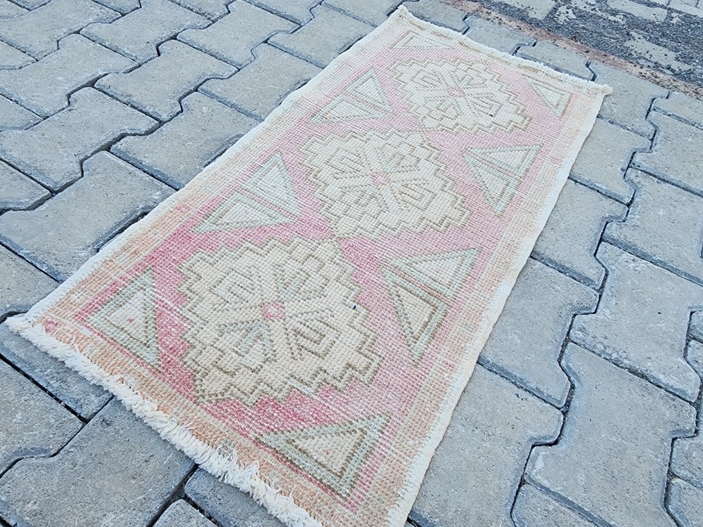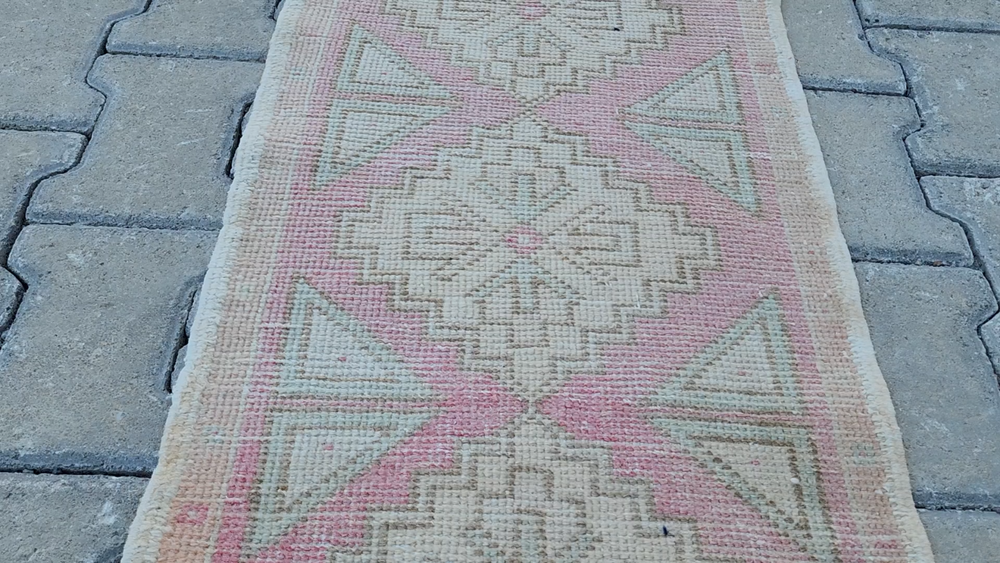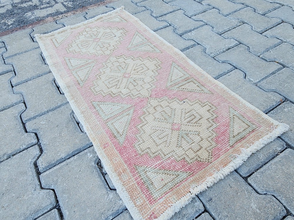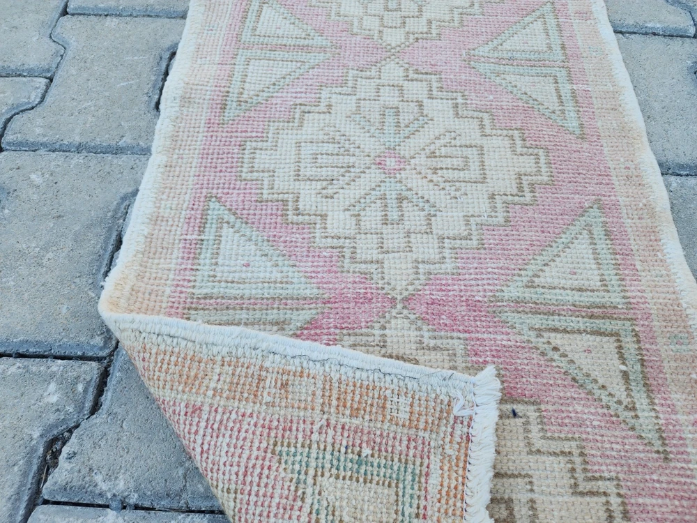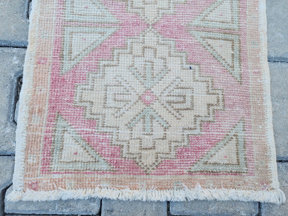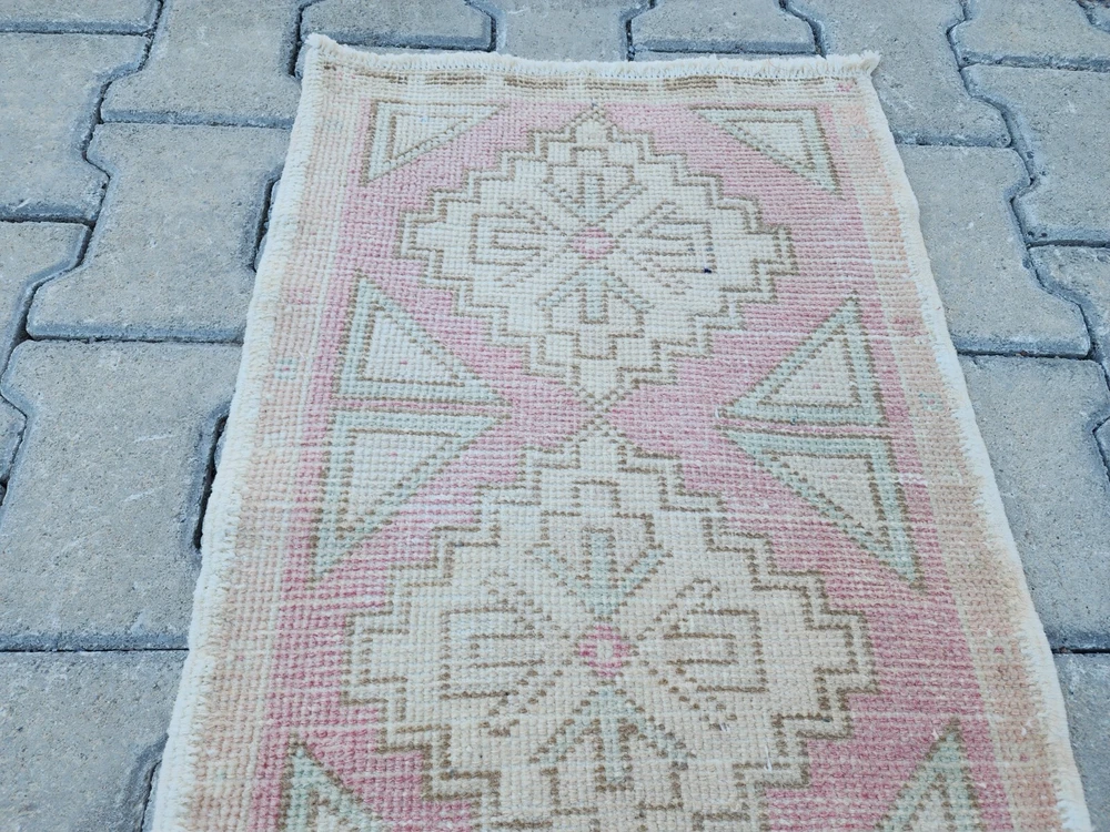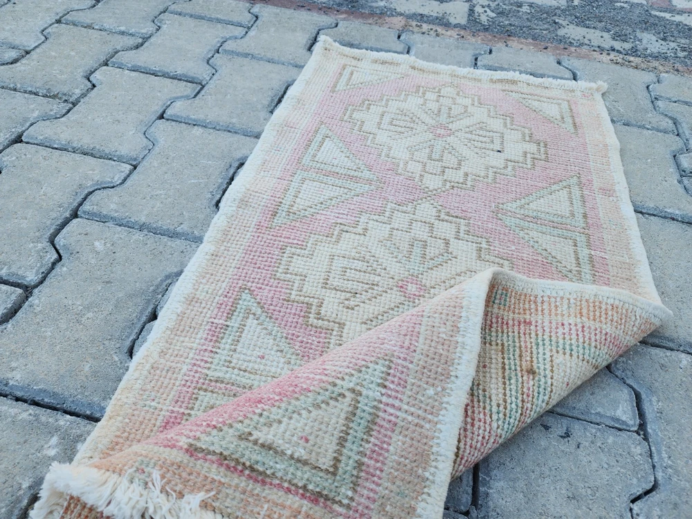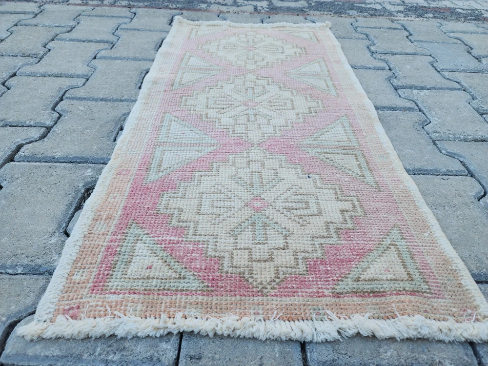 Mini Turkish Rug β 1.5x3.0 ft, Washed Beige & Blush, Geometric Diamond Pattern Handwoven Vintage Wool Rug β Soft and Subtle Accent for Entry or Corner Spaces This elegant vintage Turkish rug features a washed beige field accented with pale blush and green geometric diamonds. The soft tones and worn aesthetic create a peaceful ambiance ideal for bohemian, Scandinavian, or minimalist interiors. Hand-knotted using wool and natural vegetable dyes, this rug offers durability with charm, perfect for entryways, bedside accents, or cozy corners. Product Details: π Origin: Turkey π Material: 100% wool, vegetable-dyed π Weaving: Handwoven, vintage style π Pattern: Repeating diamond motifs with triangle accents π Colors: Beige, soft pink, pale green π Condition: Washed, faded vintage look π Size: 47 x 93 cm (1.5 x 3.0 ft) π Shipping: Free express worldwide shipping π Returns: 30-day return policy π¬ Feel free to message us with any questions!