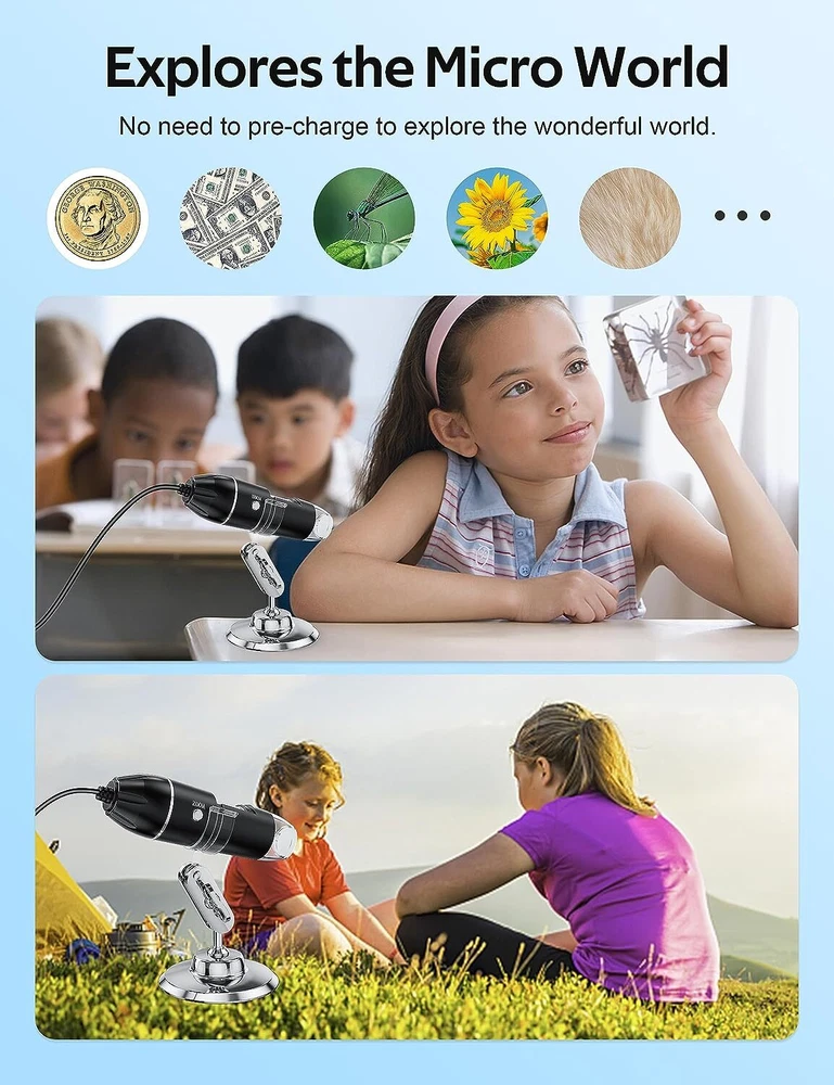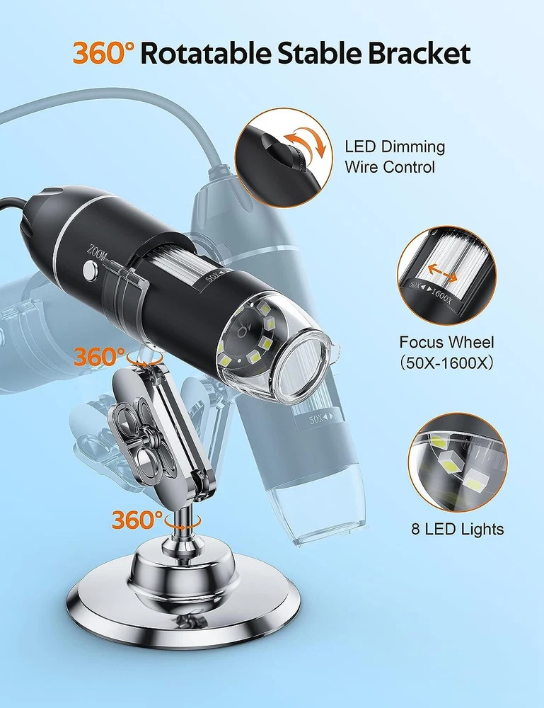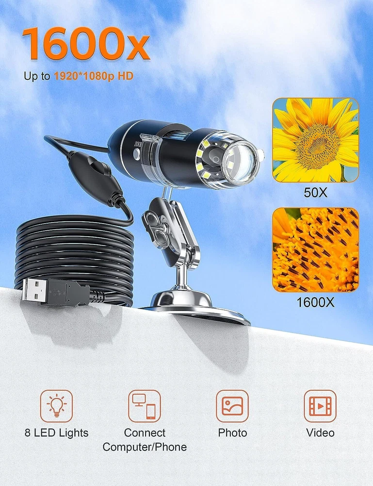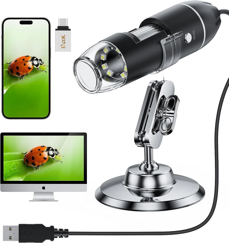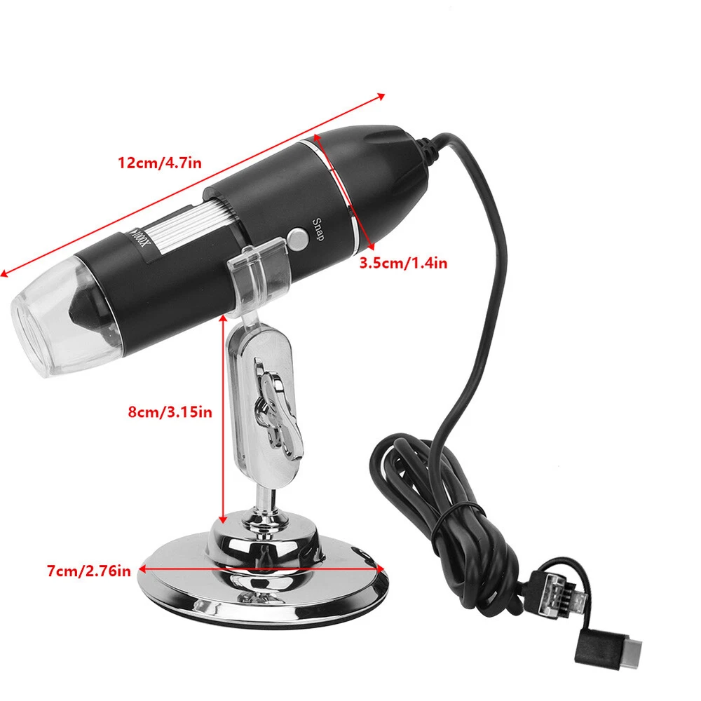 Features: Made of high-quality materials, it is and practical. With 8 integrated LED diodes, the lighting effect is good. Clear picture quality, low power consumption, high resolution, suitable for smaller objects. Photo and video production is the best choice for small object recognition. Good quality, can be used for plant inspection, skin examination, and also can inspect textile and jewelry, collections and piece inspection, print inspection. Specifications: Condition: Brand New Material: Plastic Image sensor: 0. high-definition CMOS sensor Resolution Photo: 2560 x 1920 Video resolution: 640x480 range: manual 15~44mm Frame rate: maximum 30f/s Magnification range: 500X/1000X/1600X Video format: AVI Snapshot format: JPG/BMP Adjustable lighting: 8 integrated LED diodes PC interface: USB2.0 Power: USB port (5 V DC) Operating system: Fit for WIN XP/VISTA/8 Applicable mobile phone system: Fit for (Scan QR code to download the corresponding application software) Weight: Approx. 239g / 8.4oz Size: As picture shown Package list: 1 x Electron Microscope 1 x Bracket 1 x Microscope Dedicated Micrometer 1 x Disc Note: Please note that the new type and old type of this product will be sent randomly, and make sure you will not mind before ordering. On Jul 4, 2024 at 13:32:21 PDT, seller added the following information: