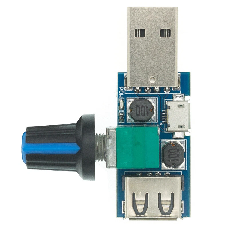 Mini USB Fan Governor Wind Speed Controller Air Volume Regulator Cooling Mute Multi Function Fan Speed Switch Module DC 5V Module Highlights: USB Fan Air Conditioner Strong winds and weak wind adjust freely Stepless Speed Regulation Fan Speed Regulation principle: The non-adjustable fan is a 5 v direct fan motor, while the two-stall fan is the interior has a step-up circuit board, when placed in the second gear, the boost plate will be USB 5 v up after the motor, the air volume is big! The stepless speed governor output voltage range of 2.5 v to 8.0 v between the smooth change, the amount of free air flow set! and a wider range! Clockwise twist knob can increase the air volume, counterclockwise twist will reduce the air volume, and knob with switch function! 1. Function Description: Suitable for the very common 5.0V USB fan on the market 2. How to use: Governor male Insert mobile phone charger, charge treasure, computer USB, fan Plug and then insert the Governor head can! Or use the Micro USB 5.0V power supply. 3. Power supply Range:DC 4~12V 4. Output Range:DC 2.5~ 8.0V 5. Rated Power:5W (Please do not overload use) 6. Attention matters: For two-shift fan, please place the fan in one gear, or you may not be able to adjust speed!