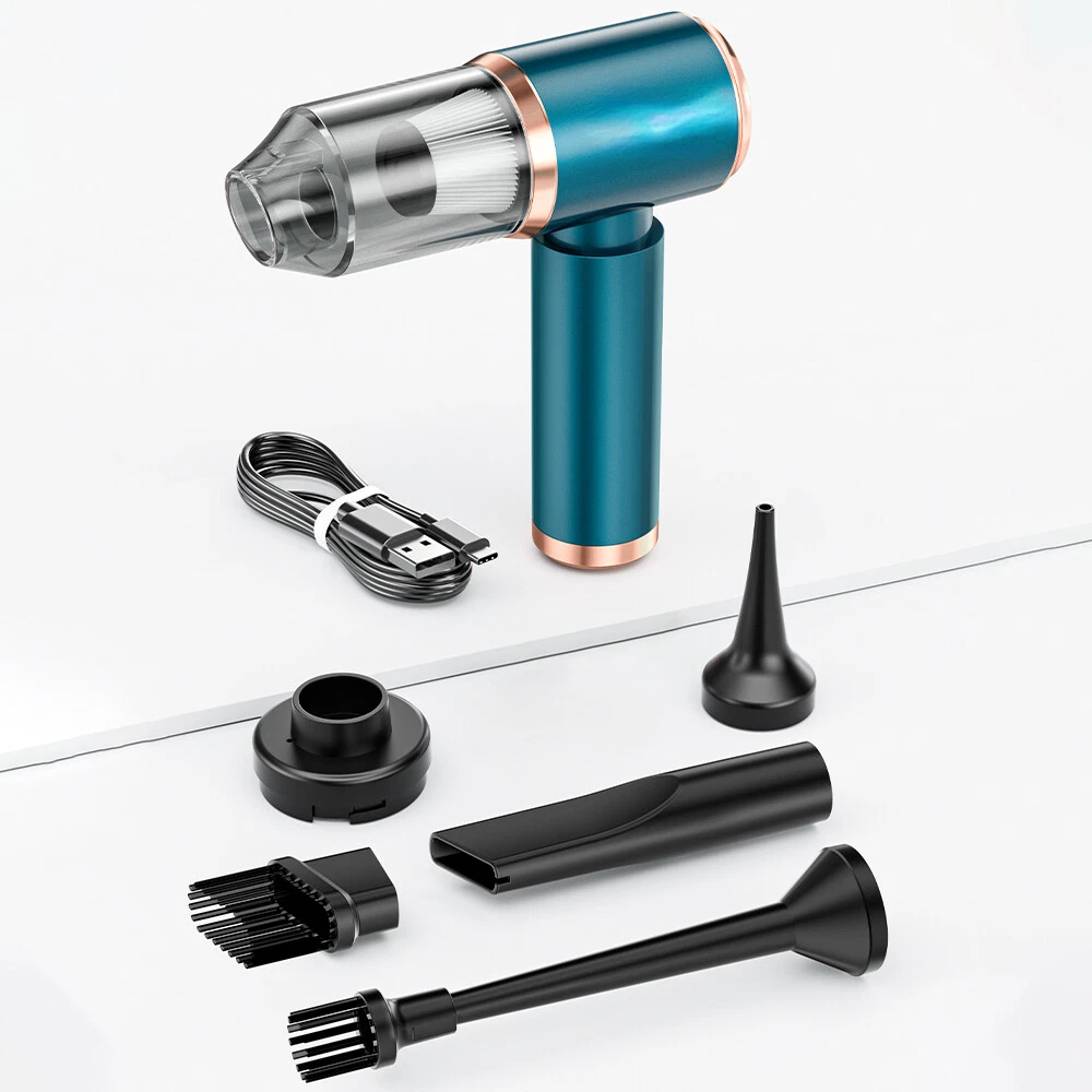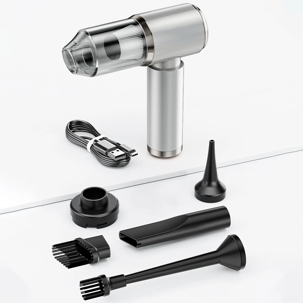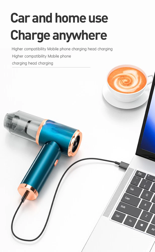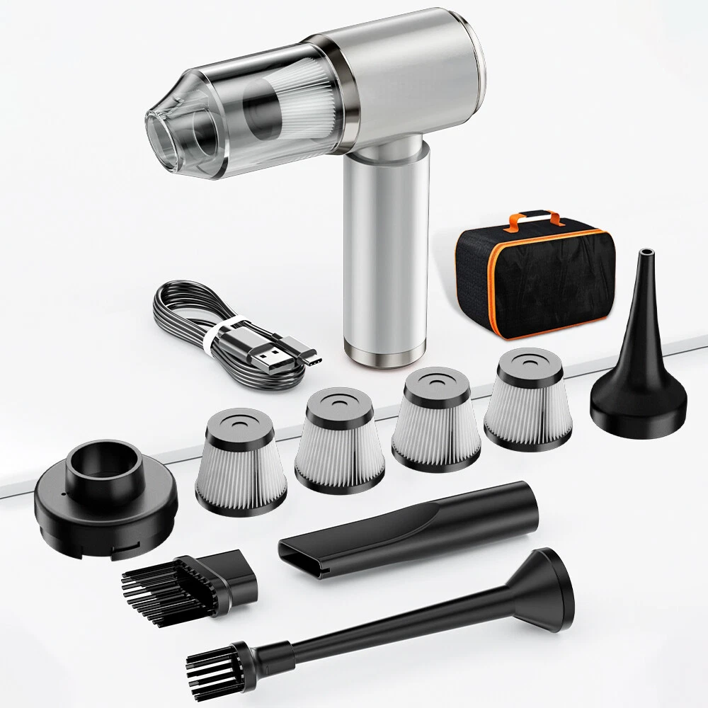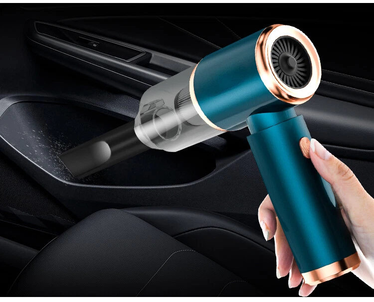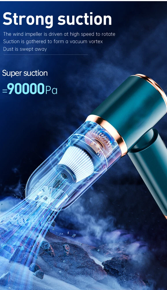Introduction [Product Name]: Handheld Vehicle Vacuum Cleaner [Product functions]:mainly cleaning cars, vacuuming, blowing dust, blowing balloons and so on Version introduction [Product material]: ABS [Color]: Blue /Sliver [Motor]: New upgrated Ordinary motor [Vacuum degree]: 90000PA [Rated speed]: 21500rpm [Capacity of lithium battery]: 2 * 2000mAh [Charging mode]: Type-C charging line [Noise]: ≤ 52dB [Operating temperature]: - 20 ℃~+50 ℃ [Package list]: vacuum cleaner X1 Accessories X 6 Charging line X1 User manualX1 [weight]:560g
