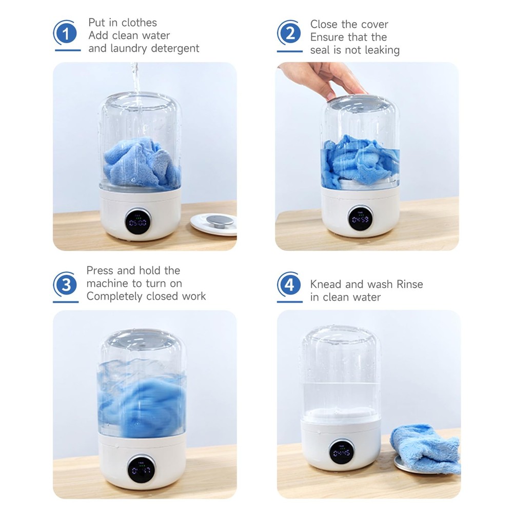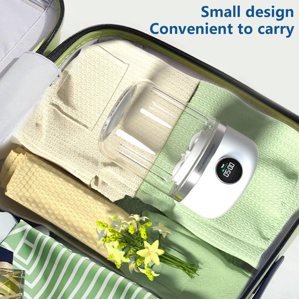 Mini portable washing machine, 1.2L small space setting, easy to carry. Dual cleaning mode enables separate cleaning of close-fitting clothes, built-in 4000mAh battery, charging for 2 hours and battery life of 20 times. It is plug-in and installation-free, solves the constraints of wires of traditional washing machines without considering drainage issues. It can be used for washing and care of underwear, socks, saliva towels, and is suitable for apartments, hotels, and travel. The mini washing machine has a size of: 5.1*5.6*8.3in, a compact design, a net weight of 1.1 pounds, which is easy to carry and can be used in apartments and traveling; The underwear washing machine can separate and clean the close-fitting clothes, say goodbye to the tedious hand washing, and saliva towels, baby clothes, underwear, and socks can all be washed separately; The manual washing machine supports two modes: soft and powerful mode, strong power deep cleaning, 360° fully enclosed and thoroughly cleaned; The travel washing machine has a built-in 4000mAh battery, which has a 2-hour battery life of 20 times. It takes the baby on a trip, works on a business trip, and travels in RVs to meet the freedom of washing; Wireless portable washing cups are free to plug and install, and solve the constraints of wires of traditional washing machines. There is no need to consider drainage issues. The washbasin, shower room, small balcony, and living room are freely placed.