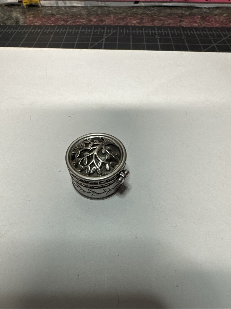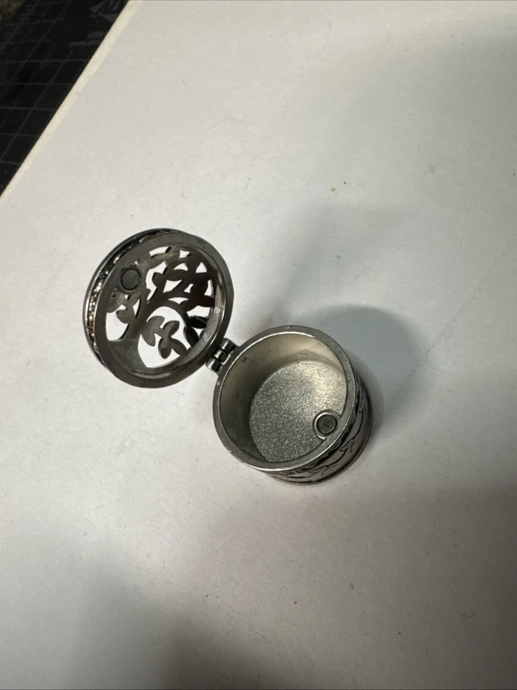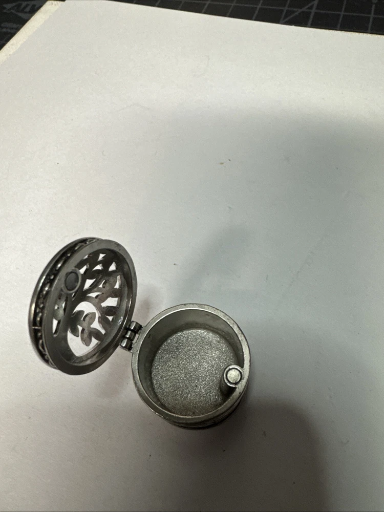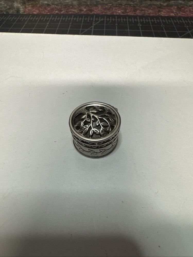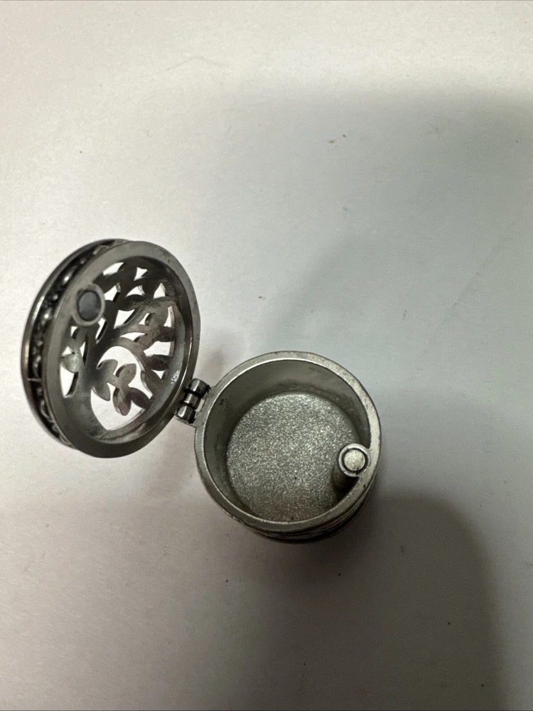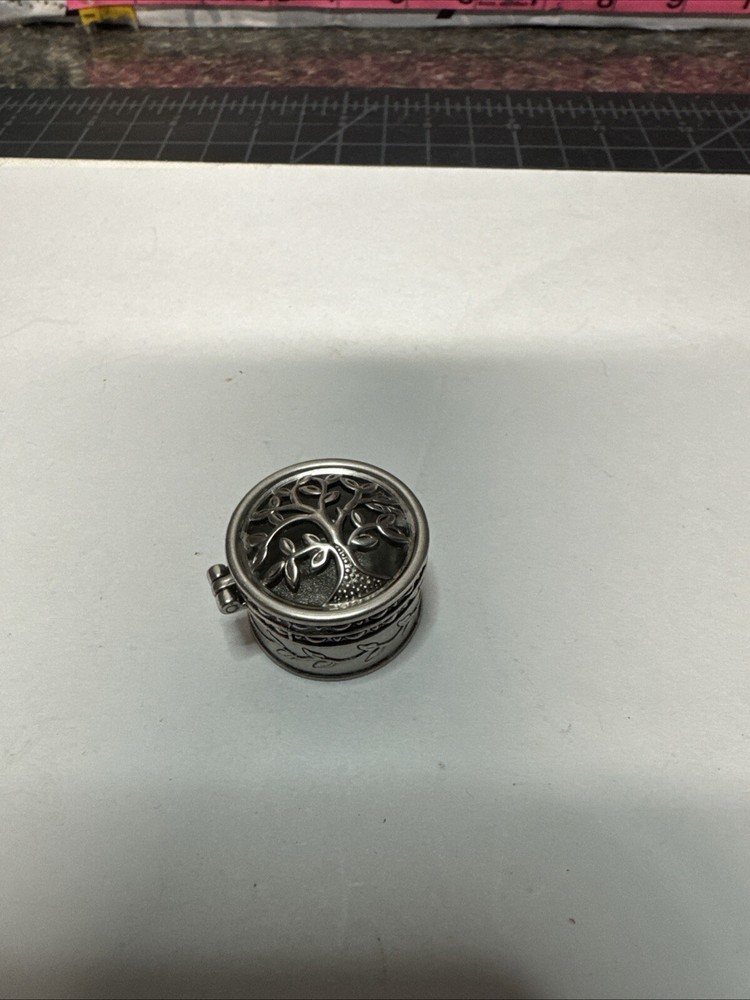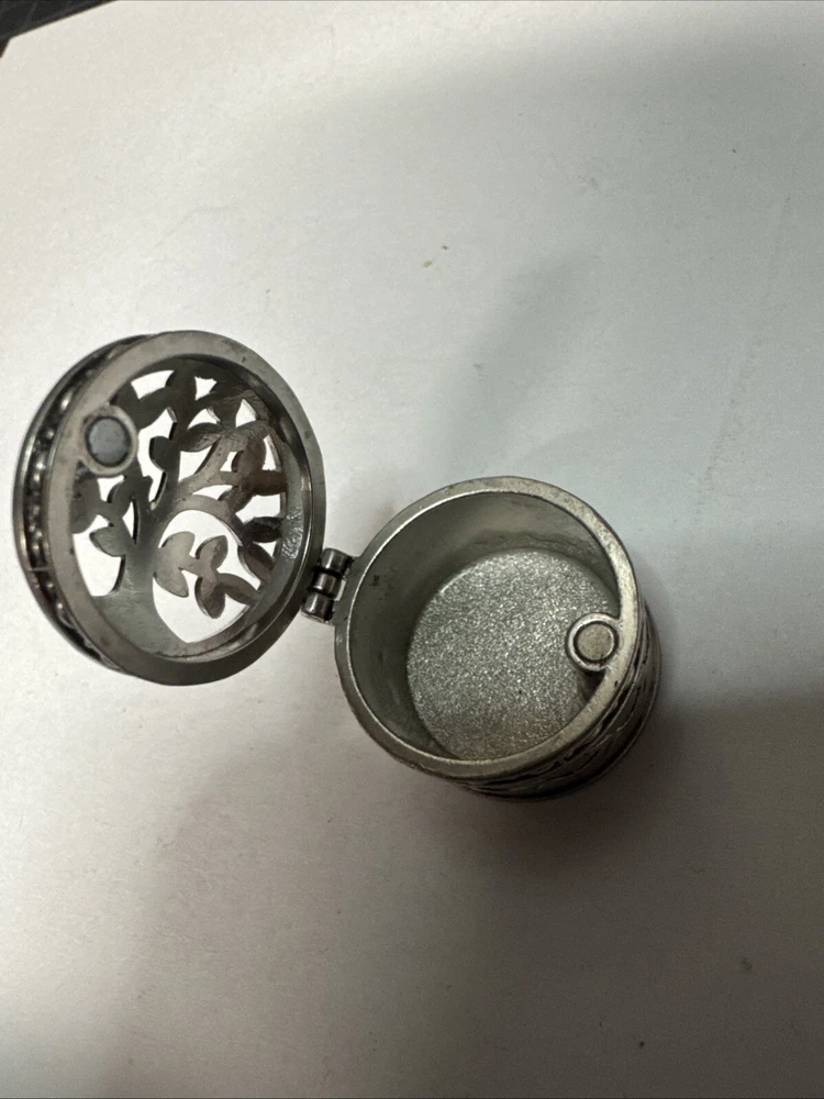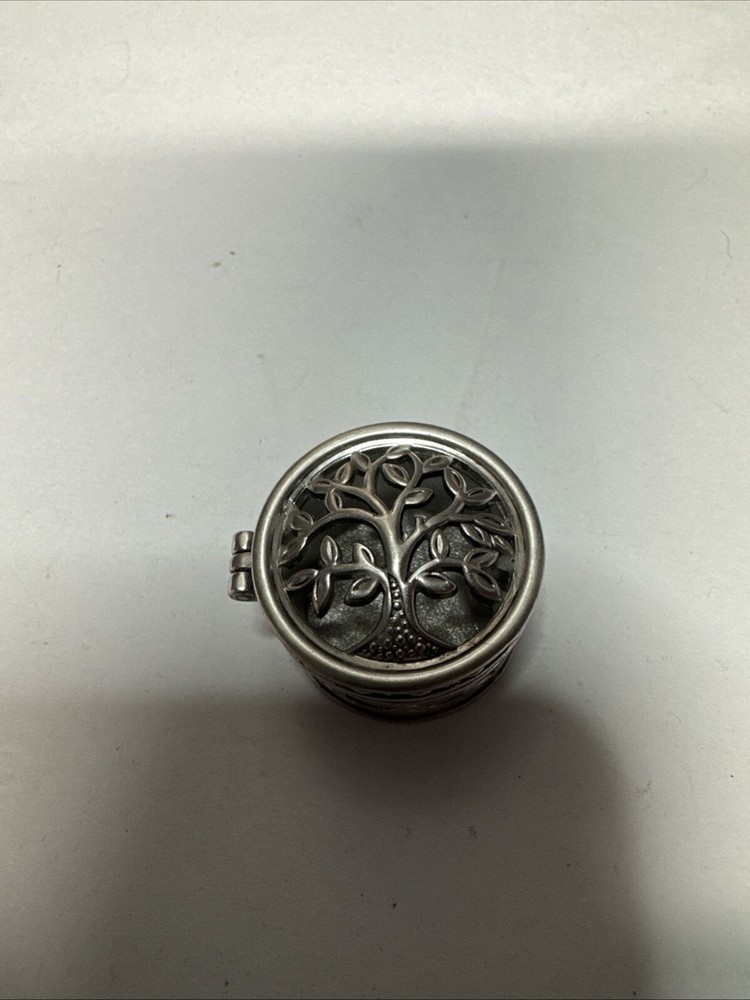 The Miniature Tree of Life keepsake box is a round, silver tone metal box featuring a tree pattern on its lid. It is designed as a miniature decorative piece with a magnetic closure, making it ideal for storing small trinkets or precious items. The silver finish adds a touch of elegance to the piece, making it a charming addition to any collection of keepsake boxes. Please see photos for condition. Please feel free to contact us with any questions before purchasing.