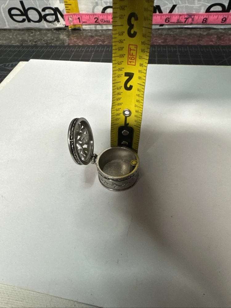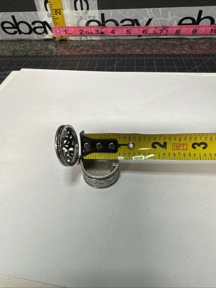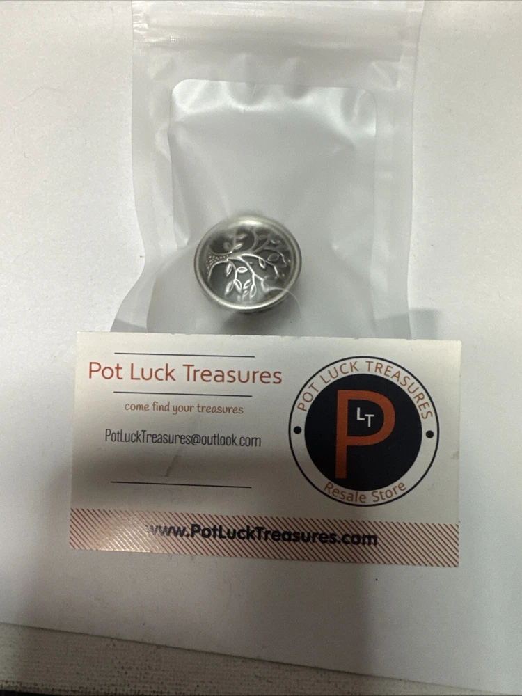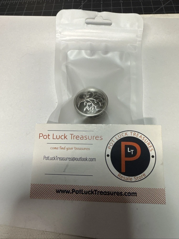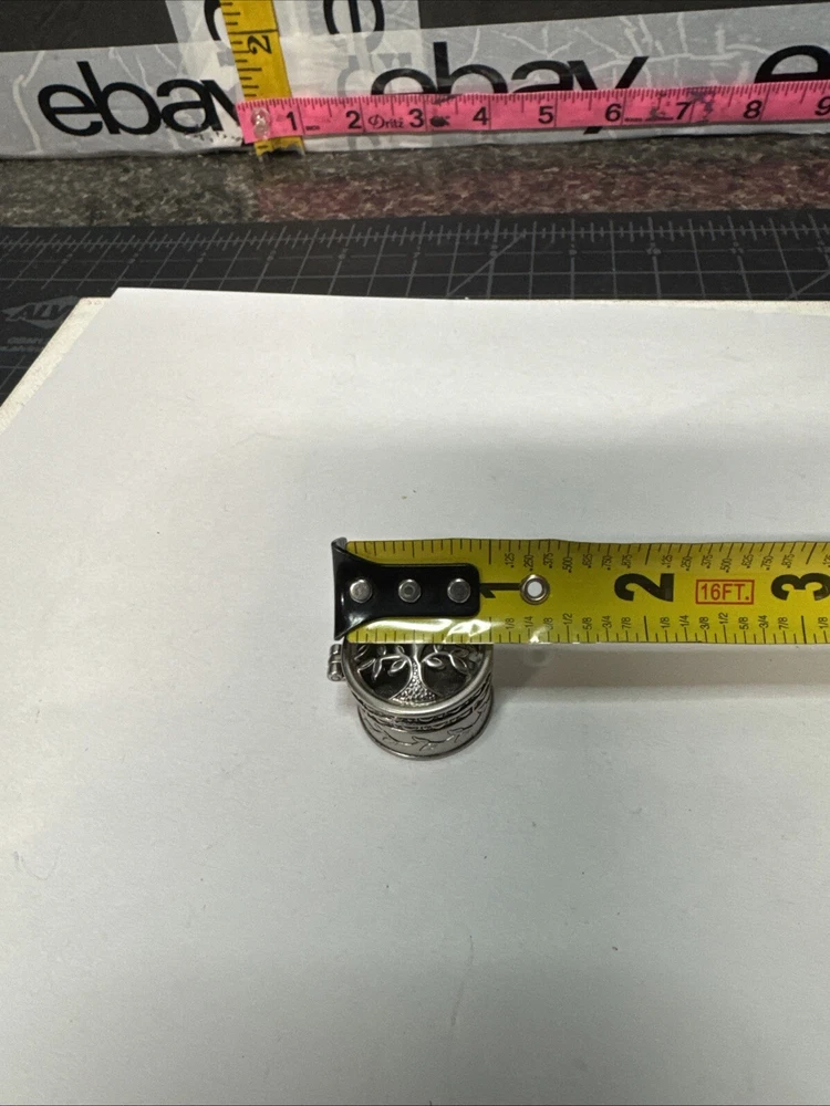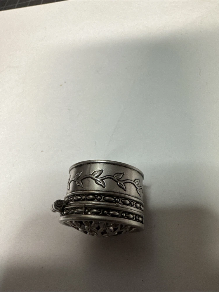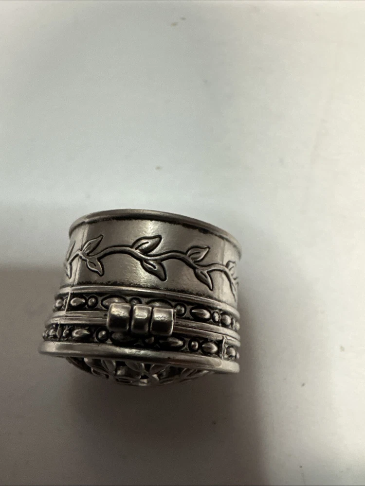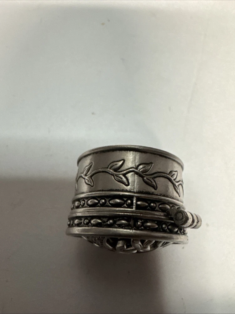 The Miniature Tree of Life keepsake box is a round, silver tone metal box featuring a tree pattern on its lid. It is designed as a miniature decorative piece with a magnetic closure, making it ideal for storing small trinkets or precious items. The silver finish adds a touch of elegance to the piece, making it a charming addition to any collection of keepsake boxes. Please see photos for condition. Please feel free to contact us with any questions before purchasing.