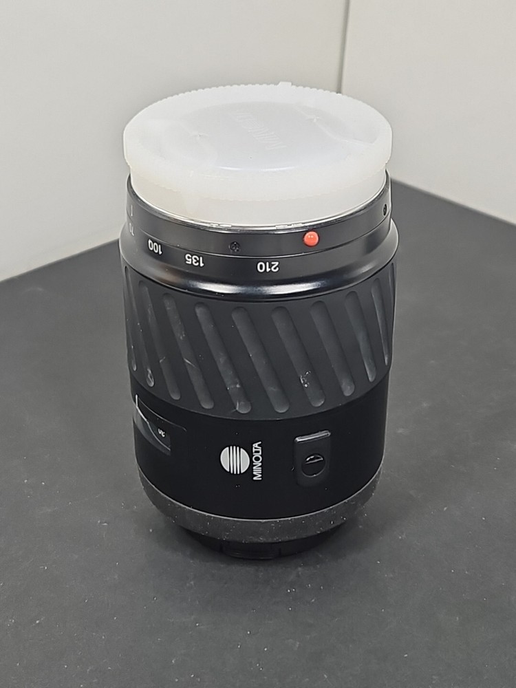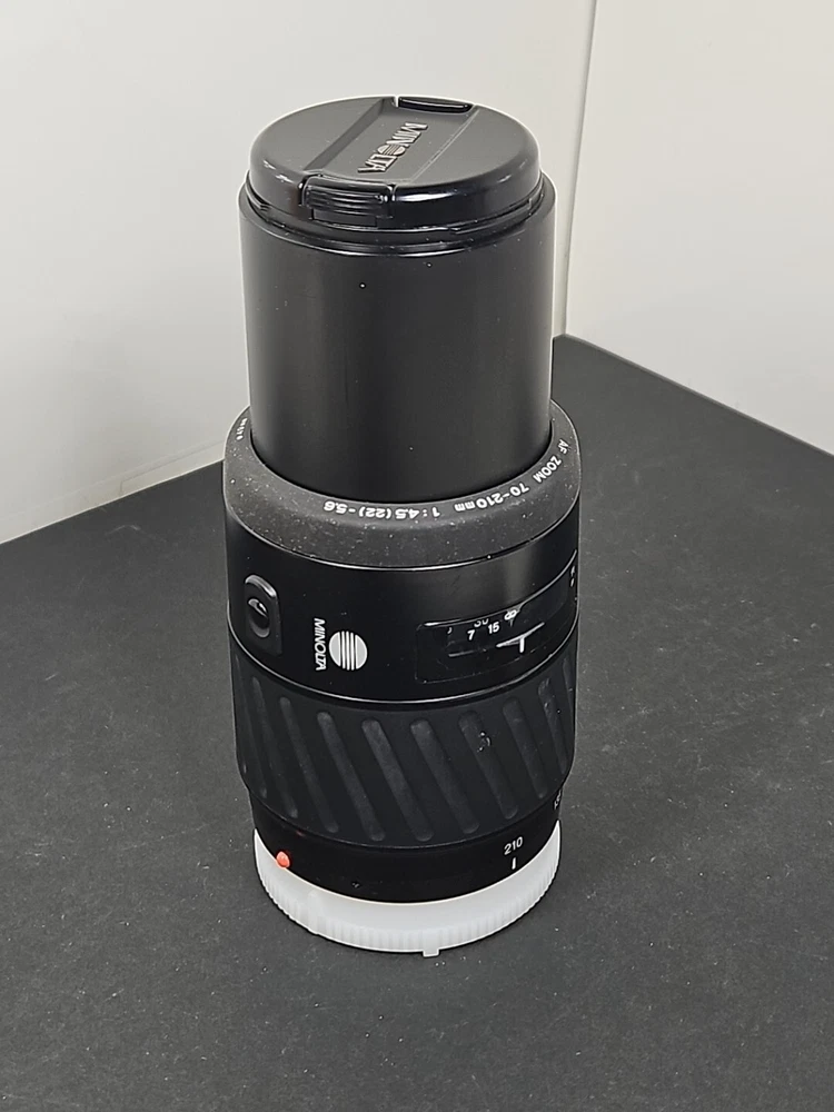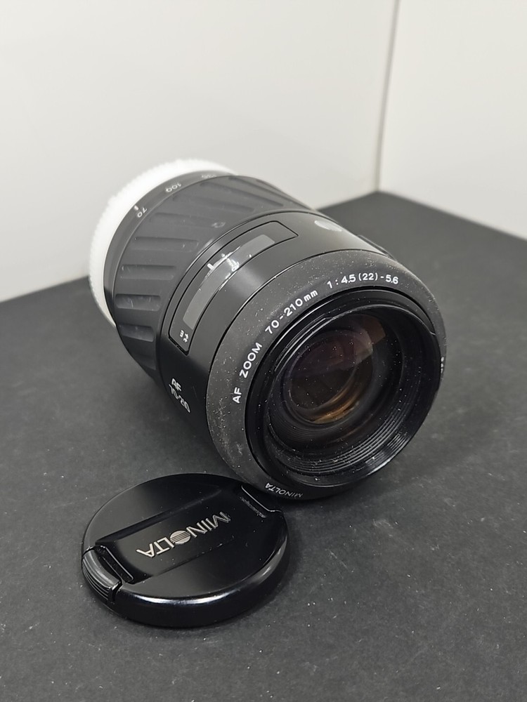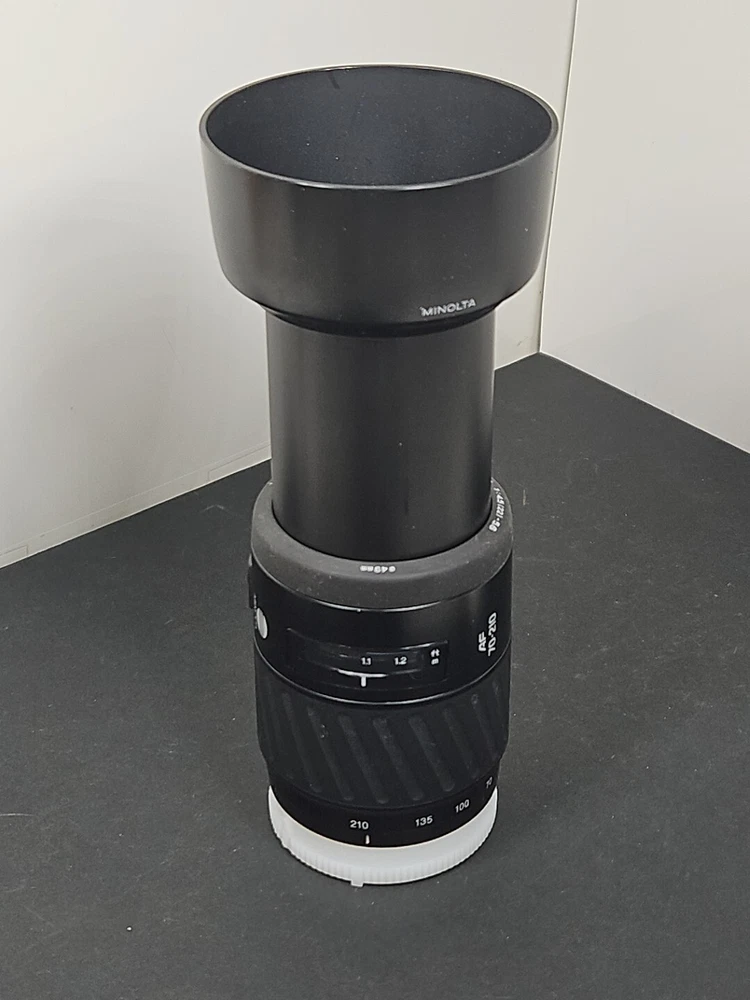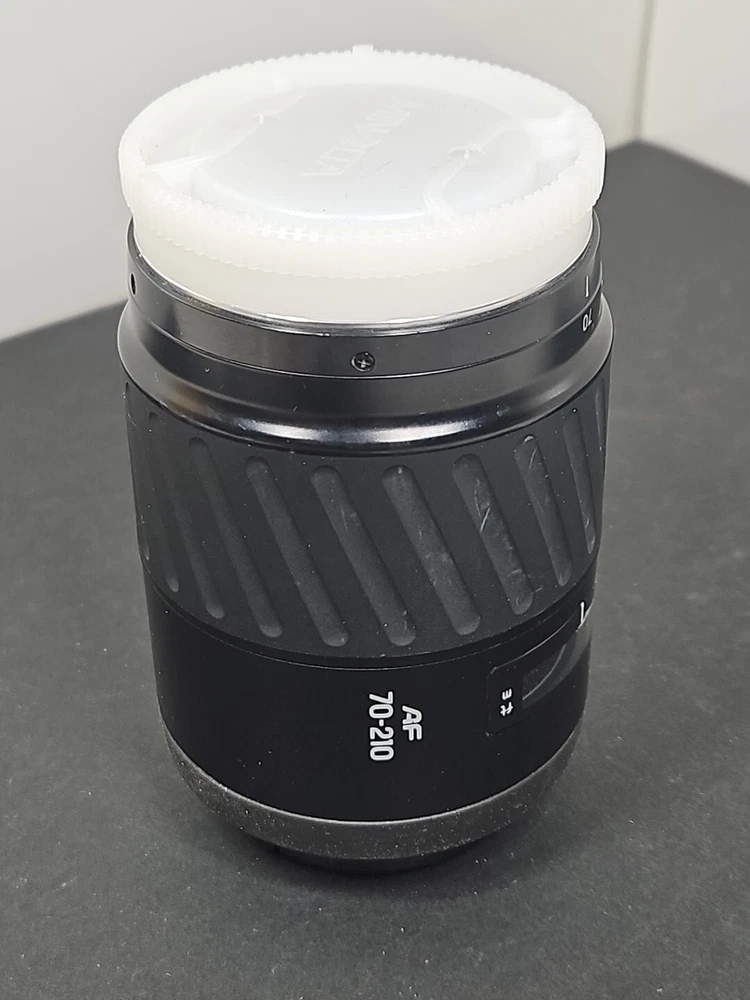 Minolta AF 70-210mm 1:4.5-5.6 Zoom Lens for Minolta Sony A Mount DSLR Hood Case Please see pictures to determine product quality. Padded cinch Case and Lens hood included. Marks from age and use. See pictures. Small fracture in dial window. Product will be shipped timely and packaged with care. Offers are encouraged. Please feel free to reach out with questions. Please see pictures. Thank you. Good used condition. Light wear from age and use. Markings from age and use. See pictures The Minolta AF 70-210mm f/4.5-5.6 Zoom Lens is designed for Minolta and Sony A-mount DSLR cameras. It features a telephoto focal length range of 70-210mm with both auto and manual focus capabilities. This versatile lens is ideal for capturing a wide range of subjects with its zoom functionality. E2