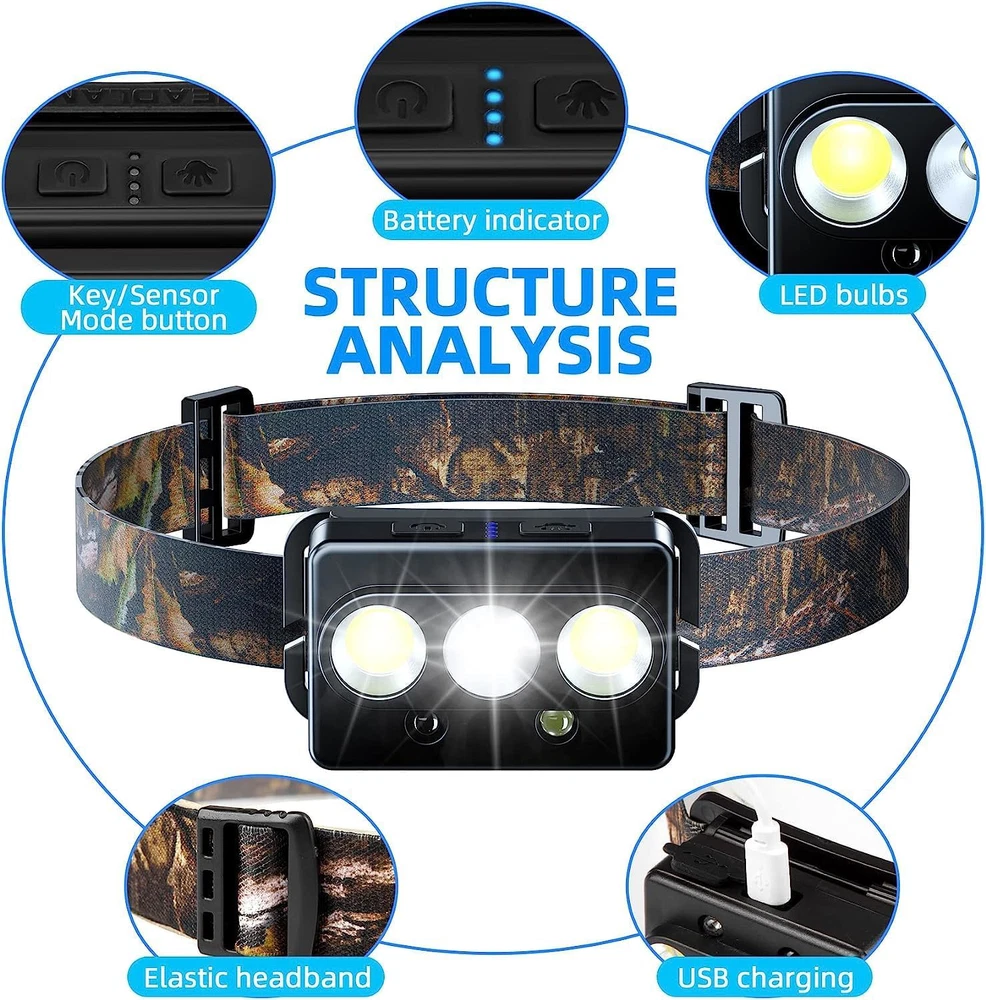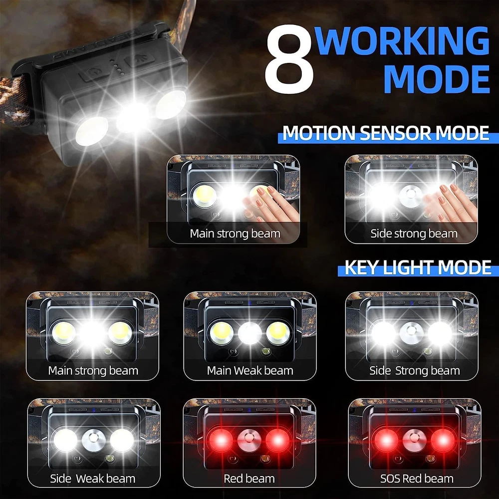 Minsk Rechargeable Headlamp, 2 Pack Headlamps for Adults, Head Lamps Outdoor LED High Brightness & 8 Lighting Modes: Minsk Led headlamp has 8 lighting modes. You will get the exact brightness (Xpg white light: high, low; Cob white light: high, low; Xpg+Cob all light, red light - constant red light, flashing; ) on the main light and sidelight. You can easily turn the lights On/Off by waving your hand, which is more convenient and avoids soiling the headlamp when your hands are dirty. Motion detection offers you the convenience you need for any use in the dark. Magnetic And Detachable Headlamp: Designed to solve lighting challenges from any angle, the bright headlamp body also easily detaches from the head strap and mounting bracket to become a versatile headlamp flashlight with a built-in magnetic base for attachment to metallic surfaces. This headlamp pro can be used as a camping light, tent light, car repair light, etc. Lightweight & Waterproof:Compact headlamps weigh only 1.8 ounce, you won't even notice it when wearing it. Made of premium ABS material, it's durable and longlasting. Fully sealed casing and silicon button cover can protect your led head lamp from water, sweat, splashing, dust etc. Great super bright headlamp for long time night running, walking, reading, camping, hiking, Fishing etc. Rechargeable And Adjustable: Rechargeable headlamp is compact and powerful. USB batteries provide 4-8 hours of operation. No need to replace batteries. The built-in battery is easy to charge with a Usb cable. Minsk offers 2 packs of headlamps for you to use in rotation. IPX6 waterproof rating makes it safe to use even when it rains. The waterproof headlamp uses an adjustable ergonomically designed elastic headband to ensure safety and comfort, making this light ideal for extended use. NO WORRY GUARANTEE ??? we are so confident you will love our headlamp that we offer money back guaranty with complete lifetime warranty. Click "ADD TO CART" button now and have your Minsk headlamp!
