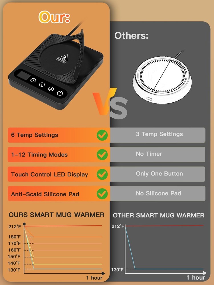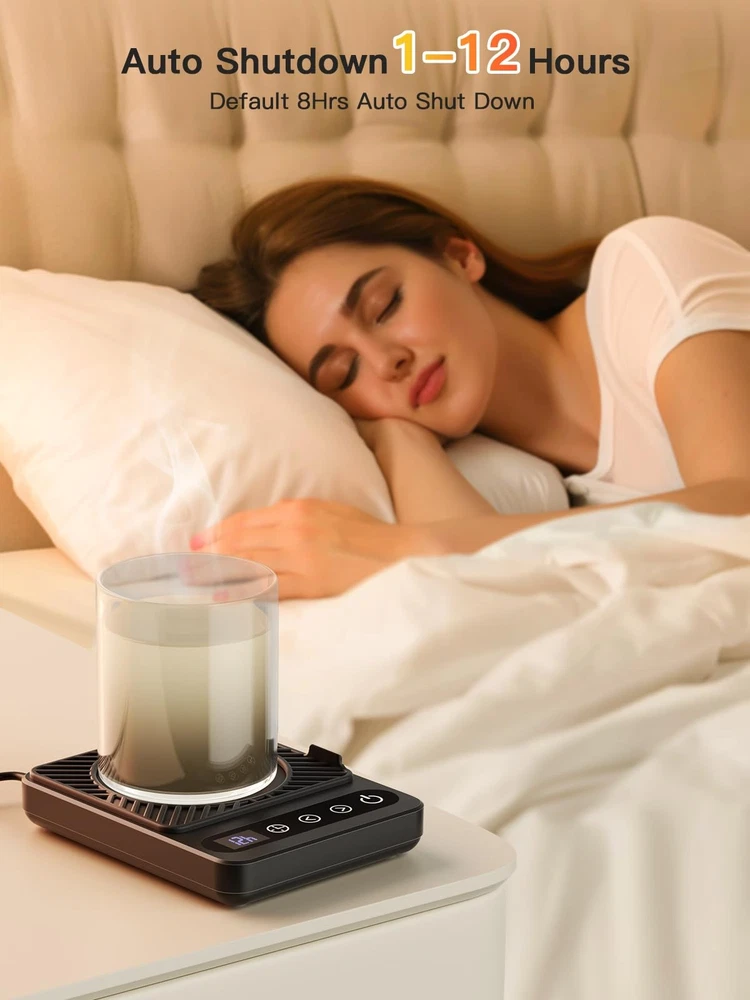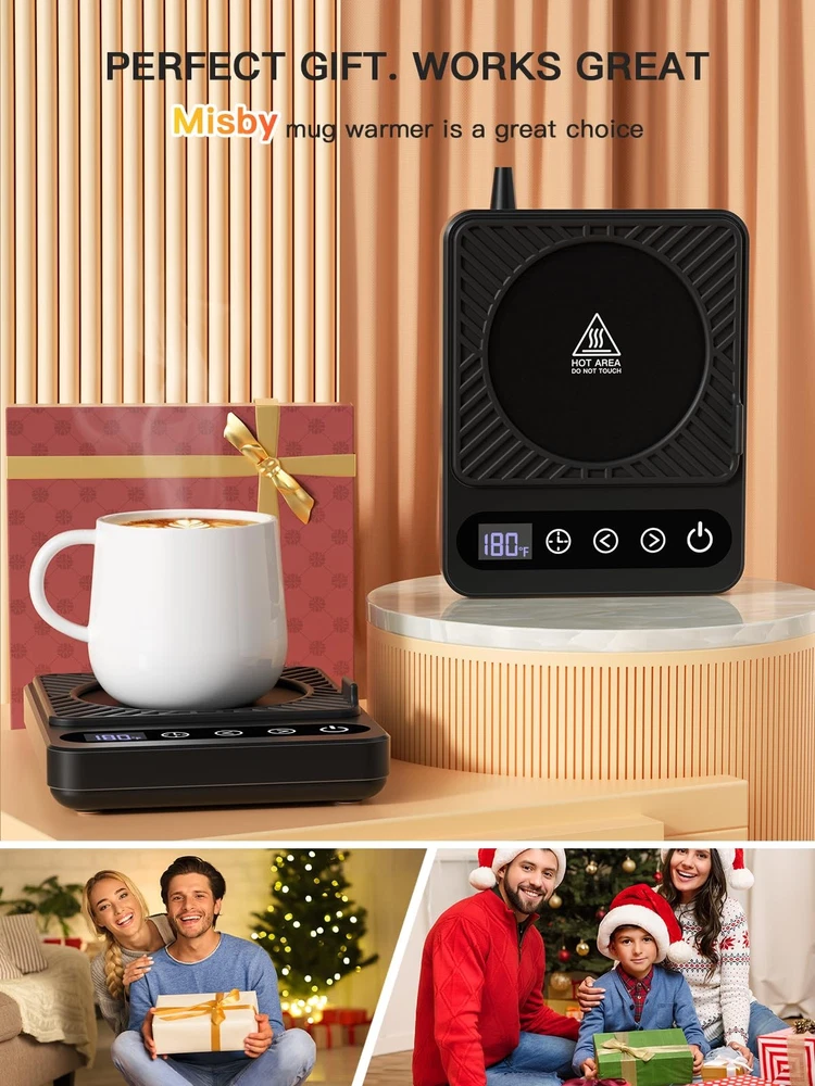 This coffee mug warmer was designed to keep your coffee warm continuously, save the heat and the taste. With its extended cord length to use at office and home Feature: 1. Auto Shut Off after 8 Hours 2. SixTemperature Settings:keep your coffee hot 3. Multifuction mug warmer-For coffee, tea, hot cocoa, etc. Suitable for many different mug styles and sizes. 4.Suitable for most of mugs,like tableware, stainless steel cup, ceramic mug, milk , glass cup and etc. 5.With its extended cord length to use almost anywhere. How To Use? 1.Put flat and thin bottom cups on the warmer 2. Choose between the different modes 3. The cup warmer will turn off automatically after 8 hours of continuous use 4. Timing shut down: in the heating state, directly touch the timing key to select the time 5. In the shutdown state, fill the cup with water, and put it in the heating area. Select the time, and the selected time isolates Tips: 1.We suggest flat and thin bottom mug for the best performance rather than a deep concave bottom 2.Please don't use vacuum sealed cup or insulated cup 3.Don't submerge the coffee mug warmer in water. 4. CAUTION HOT SURFACE! Please do not touch during or immediately after use and keep out of reach of children. 【Great 6-Temperature Design】The Misby Coffee Mug Warmer features six precise temperature settings ranging from 130°F to 180°F, allowing you to customize the heat for your favorite beverages. Whether it’s coffee, tea, or milk, this mug warmer ensures your drink stays at the perfect temperature. The digital panel is easily read and adjusted, and the warmer heats up almost instantly. Note: 180°F is very hot, so please unplug when children are nearby 【Durable and Safety】Designed for everyday use, the Misby Coffee Cup Warmer is built to last. It features a silicone protection pad that prevents cups from slipping and protects your hands from burns. The on/off button is easy to press and emits a sound when activated, so you’ll always know when it’s on. Plus, the long 55-inch cord offers flexibility in placement, whether at your desk, kitchen, or office 【1-12H Timed Auto Shutdown】Never worry about forgetting to turn off your mug warmer! The auto-shutdown timer allows you to set a shutdown time between 1 to 12 hours, with a default 8-hour safety cutoff. This feature ensures energy efficiency and safety, making it a perfect addition to your desk or kitchen 【Larger Base for Most Cups】With a 4.5-inch oversized base, the Misby Coffee Mug Warmer accommodates various cup sizes and styles, including stainless steel mugs, glass cups, and milk boxes. The non-slip feet keep it securely in place, while the sleek design complements any workspace 【Thoughtful Gift Choice】Looking for the perfect gift? The Misby Coffee Cup Warmer is a thoughtful and practical choice for coffee and tea lovers. Its elegant design and 6-temperature settings make it ideal for home, office, or kitchen use. Keep your coffee warmer and enjoy every sip—this mug warmer is a must-have for anyone who values a hot drink