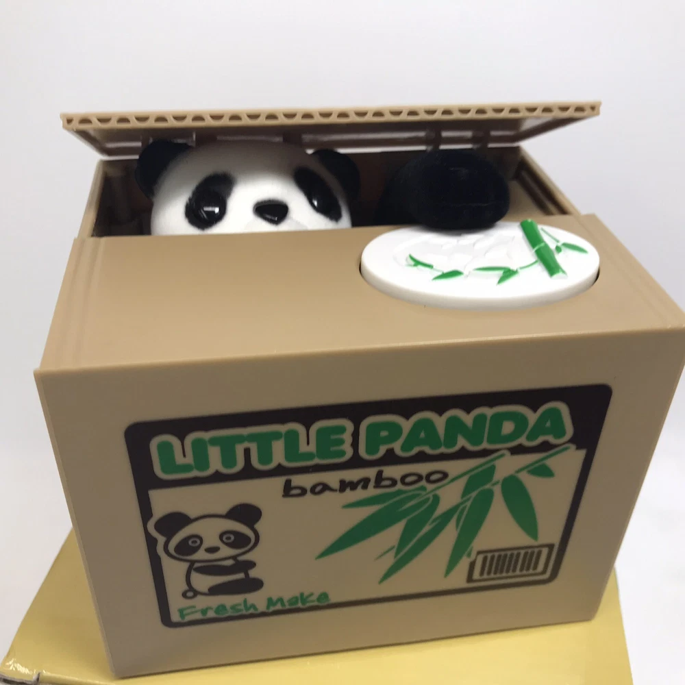 Mischief Panda Bear Automated Coin Stealing Savings Box Piggy Bank. Tested and working. Material: ABS plastic Electronic components. Color: Brown Box Dimension:Approx. 11.8cm x 10cm x 9cm Weight:Approx. 320g The largest capacity: Approx. 40 coins. Powered by: 2=AA batteries (not included) Ships via USPS Ground Advantage Mail