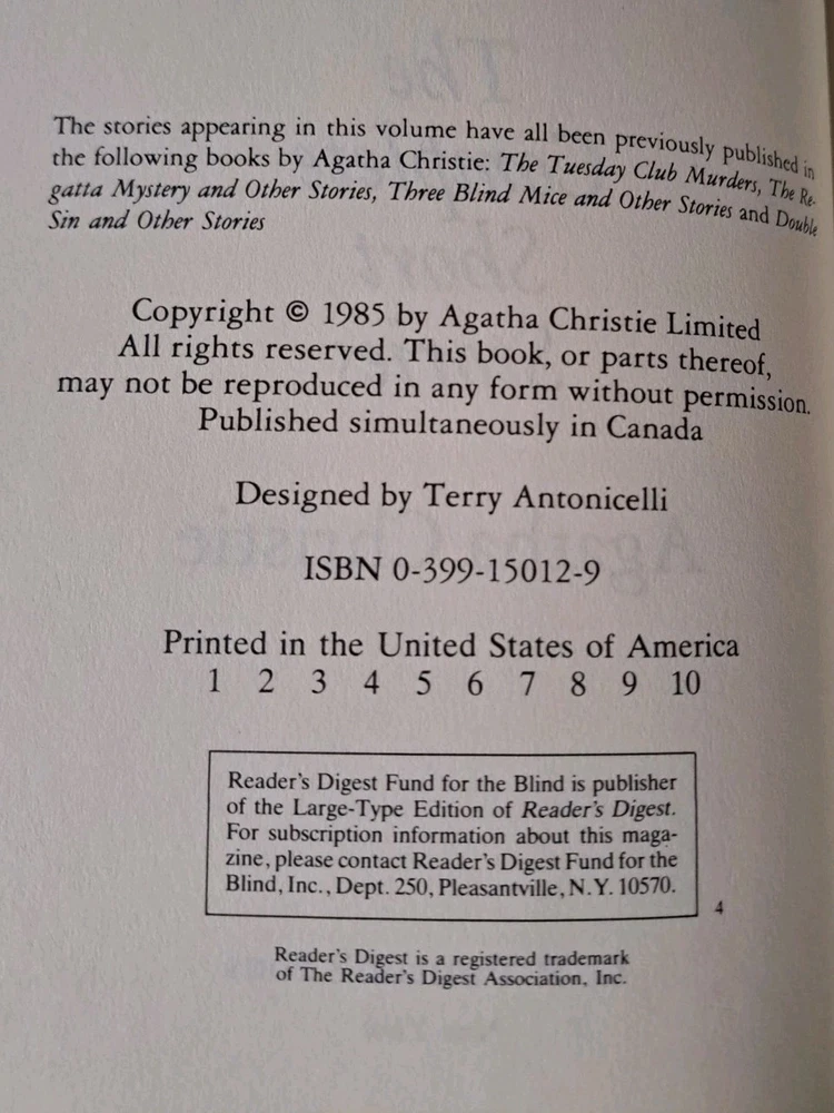 "Miss Marple the Complete Short Stories by Agatha Christie in Large Print is a hardcover book published in 1985 by G.P. Putnam's Sons. The book contains detective stories from the popular Miss Marple series written by the renowned author. Ideal for fans of crime and thriller genres, this edition is perfect for those who enjoy reading books in large print for improved readability. With a focus on mystery and suspense, this collection is a must-have for anyone interested in classic detective fiction."