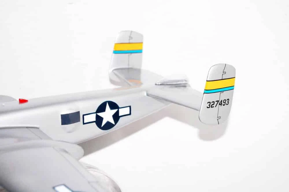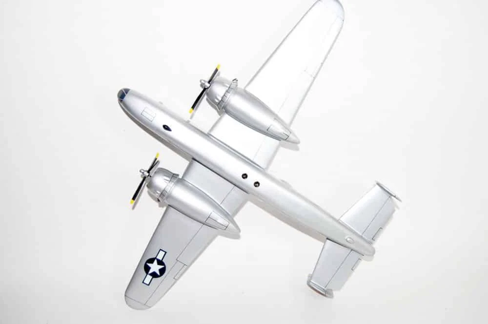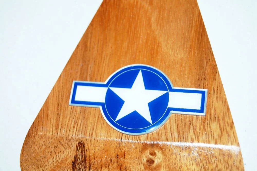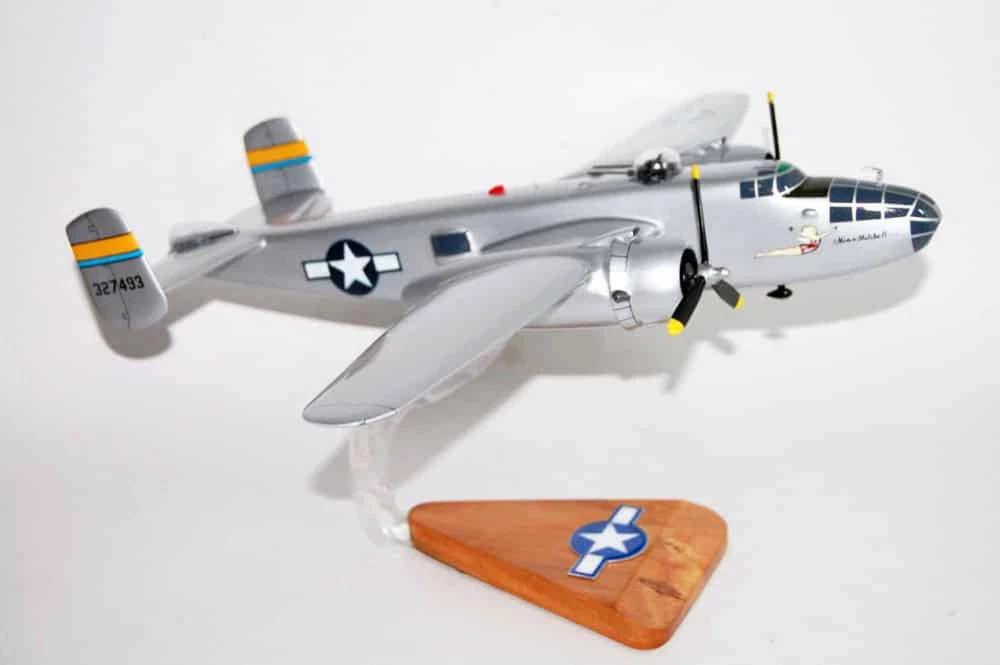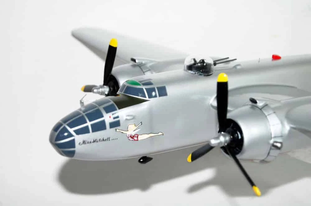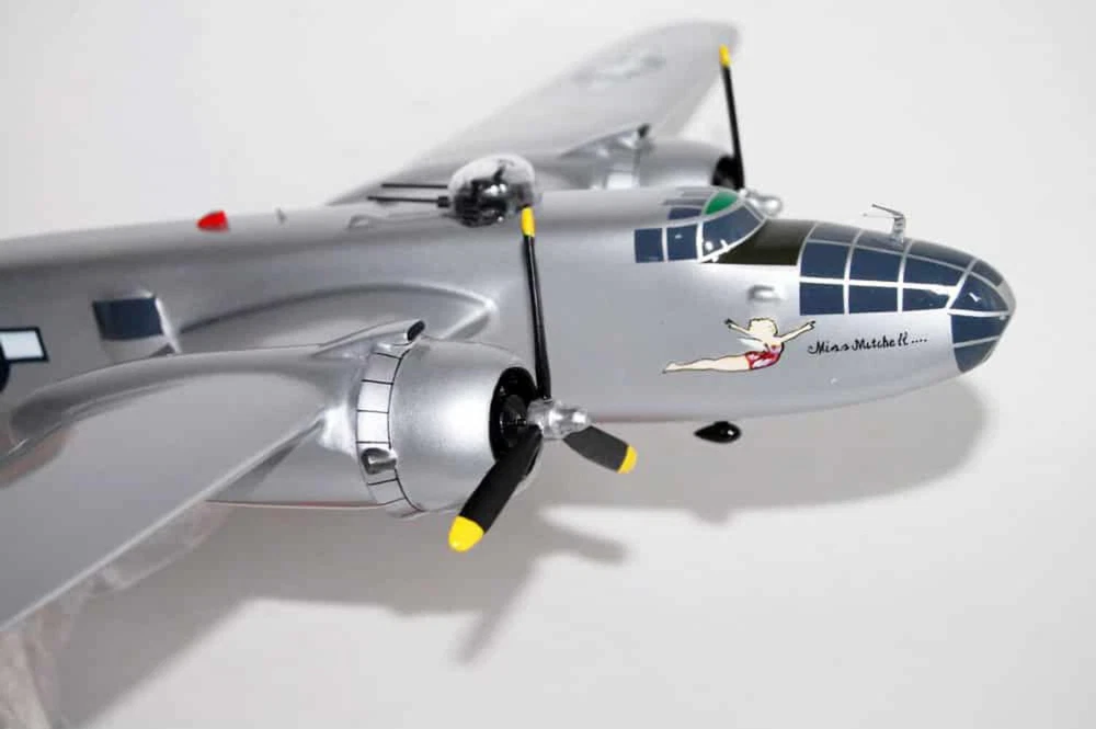 "Miss Mitchell" North American B-25 Mitchell A beautifully carved North American B-25 Mitchell model! Each piece is carefully carved and painted to provide a top quality piece. Length - 21 inches Wingspan - 16.5 inches The B-25J-20-NC SN 44-29869 now flying as "Miss Mitchell" was delivered on November 10, 1944. Her initial assignment was to Palm Springs, California and used for proficiency flying and crew training. She would remain here until the end of the war. After the war, many military bases were quickly closed, and she was flown to South Plains, Texas for storage. In May of 1946, she was recalled and assigned to Langley Field, Virginia to be used for administrative purposes by the base command. By June of 1947, she was back in storage at Pyote, Texas. Early in 1952, she was modified by Hughes and redesignated as a TB-25K. The TB-25K was used for training radar intercept crews in airborne radar systems. Her conversion included modifications to accept radar sets, electronics, and a nose cose for the E-1 fire control radar system as well as updated wiring and systems. She was then assigned to James Connally Air Force Base, Texas in September of 1952 and used to train radar and target intercept crewmen for the Air Defense Command. By December of 1957 she was flown to storage. The following summary of assignments are listed on her record card: Base Assignments Date Location Notes 11/13/1944 Palm Springs, CA 560 Base Unit 1/28/1946 South Plains AAF, TX 4168 Base Unit 5/29/1946 Langley Field, VA 304 Base Unit 8/21/1946 Langley Field, VA 75 Base Unit 6/11/1947 Pyote AAB, TX 4141 Base Unit, Storage 12/06/1950 Pyote AAB, TX 2753 Air Storage Sqdn 11/14/1951 Brookley AFB, AL Maintenance 02/03/1951 Culver, CA Maintenance to TB-25K 09/04/1952 Connally AFB, TX 3565 Training Wing 11/17/1954 Birmingham, AL Maintenance 02/21/1955 Connally AFB, TX 3565 Training Wing 12/1957 Davis Monthan AFB, AZ Storage 04/1958 Davis Monthan AFB, AZ Surplus In October of 1958, she was sold to Aviation Rental Service in St. Paul, Minnesota. Her civil registration was reserved of N3160G. She was sold in June of 1970 to Robert Kundel of Rice Lake, Wisconsin. By 1974, she was located in Anoka City, Wisconsin with an olive drab color scheme with yellow cowlings. In December of 1978 she was sold to the Commemorative Air Force (then Confederate Air Force) in Harlingen, Texas. She was assigned to the Minnesota Wing for restoration and brought to Flemming Field in South St. Paul, Minnesota in September of 1978. She was restored to honor a B-25J that served with the 310th Bomb Group, 380th Bomb Squadron during 1944-45 in the Mediterranean. During her restoration, her current nose art was painted by Ray Kowalic, who painted the same nose art on the original "Miss Mitchell". In May of 1991 her registration was changed to the current N27493. Her first flight after restoration was on April 18, 1992 - the 50th anniversary of the Doolittle Raid. In February of 1994, the turret and tail guns were re-installed.