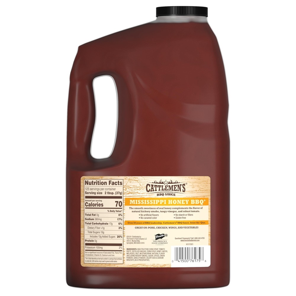 Formulated with the needs of food service professionals in mind, Mississippi Honey BBQ Sauce offers both taste and performance. This sauce blends flavors like sweet honey, tangy vinegar, rich tomato paste and hickory smoke to perfectly complement pork, chicken, beef and vegetable dishes. This honey barbecue sauce is highly versatile, so you can use it to bring signature flavor to a variety of recipes, from salads and dips to BBQ and beyond. Mississippi Honey BBQ Sauce does not include gluten, dairy, starches, fillers, caramel color or potential allergens like eggs, fish, soybeans, tree nuts or peanuts. As a kosher and vegetarian product, barbecue sauce is perfect for everyone to enjoy. When you use this honey barbecue sauce at your restaurant, you can benefit from its: - Convenience: Developing the perfect barbecue sauce takes time. Allow back-of-house staff to skip the trial and error by buying a sauce that comes ready to use right out of the bottle — no preparation necessary. - Affordability: Mississippi Honey BBQ Sauce has an affordable price, especially when you buy in bulk. Plus, each bottle is extendible up to 20 percent, which means you can restock less often. - Performance: This honey barbecue recipe uses tomato paste instead of tomato puree to give it a thicker consistency and increase its ability to cling to food. The lack of starch also prevents burning, whether you cook barbecue low and slow or over open flame. Cattlemen’s Mississippi Honey BBQ Sauce is shipped and stored at ambient temperatures and has a shelf life of 15 months. Protect the product from freezing and store with the lid tightly closed at room temperature to reduce the risk of contamination and maintain maximum product quality. Refrigeration after opening is recommended to preserve the product's flavor. SWEET AND TANGY TASTE: Cattlemen’s Mississippi Honey BBQ Sauce features an intricate blend of Grade A honey, tangy vinegar, natural hickory smoke, rich tomato paste and a hint of garlic for a complex, sweet flavor profile and smooth, dense consistency MADE FOR CHEFS: Built exclusively for food service, Cattlemen’s Mississippi Honey BBQ Sauce provides thick tomato paste for better coverage and cling and includes no starches and fillers to prevent burning no matter what barbecue cooking method you use FEEL GOOD BBQ SAUCE: Cattlemen’s Mississippi Honey BBQ Sauce is kosher, vegetarian, gluten-free and dairy-free, the sauce contains no starches, fillers, caramel color, eggs, fish, peanuts, tree nuts or soybeans CONVENIENT AND EASY TO USE: This sweet and tangy barbecue sauce is perfect for bulk buying and restaurant use; the 1-gallon jug is extendible by up to 20 percent for increased profits and saves valuable time and labor over preparing from scratch VERSATILE SAUCE: Versatile, full of flavor and providing exceptional cling and coverage, Cattlemen’s Mississippi Honey BBQ Sauce works great as a dip, as a salad dressing and when used in barbecue recipes for pork, beef, chicken and vegetables