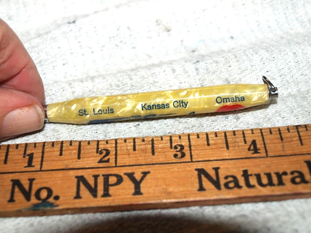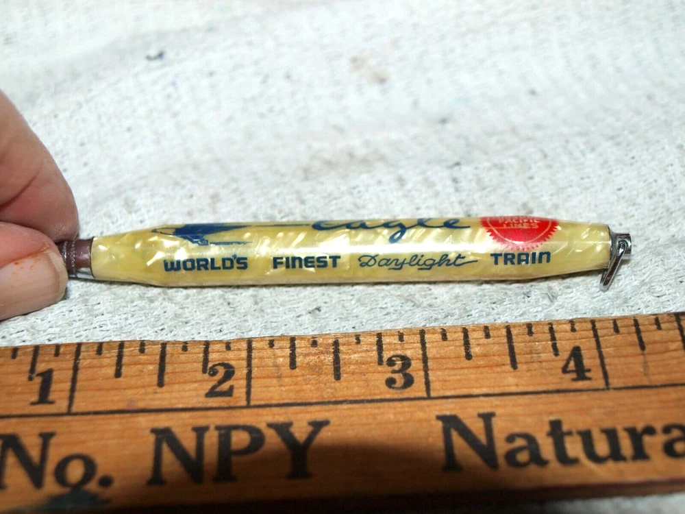 Missouri Pacific Lines Eagle on hex sided white pearl vest pocket pencil. Pencil is working with lead in the chamber. Plating is very nice. Light use or drawer wear on the plastic. Bright white pearl. Two color imprint of Eagle logo and the red Missouri Pacific Lines logo and World's Finest Daylight Train St. Louis Kansas City Omaha. Pencil is probably a Quickpoint brand. A well made pencil from the classic period. Writing sample taken by dip testing the nib . FOUNTAIN PENS ARE SOLD AS UNRESTORED. Pencils will be listed as either working with lead in the chamber on not propelling. B, C and M numbers are from 2024 picks. US buyer to pay shipping and handling as noted in the write up . Postal rates changed in July 2024 and recently with a holiday boost in prices. I will adjust accordingly. I will combine multiple purchases whenever possible . I no longer will ship to international addresses. Bidders from nations outside the US must have a US delivery address. By bidding on this auction, you signify that you have investigated Seller's feedback, trust all the agencies involved throughout this transaction, and accept all responsibility for receiving shipment from your postal service. Returns for full refund must be made within 20 days of arrival of package. I will combine shipping when possible.