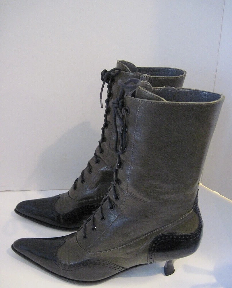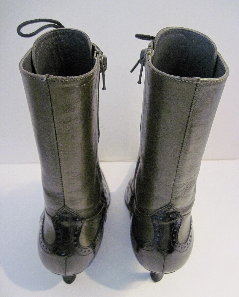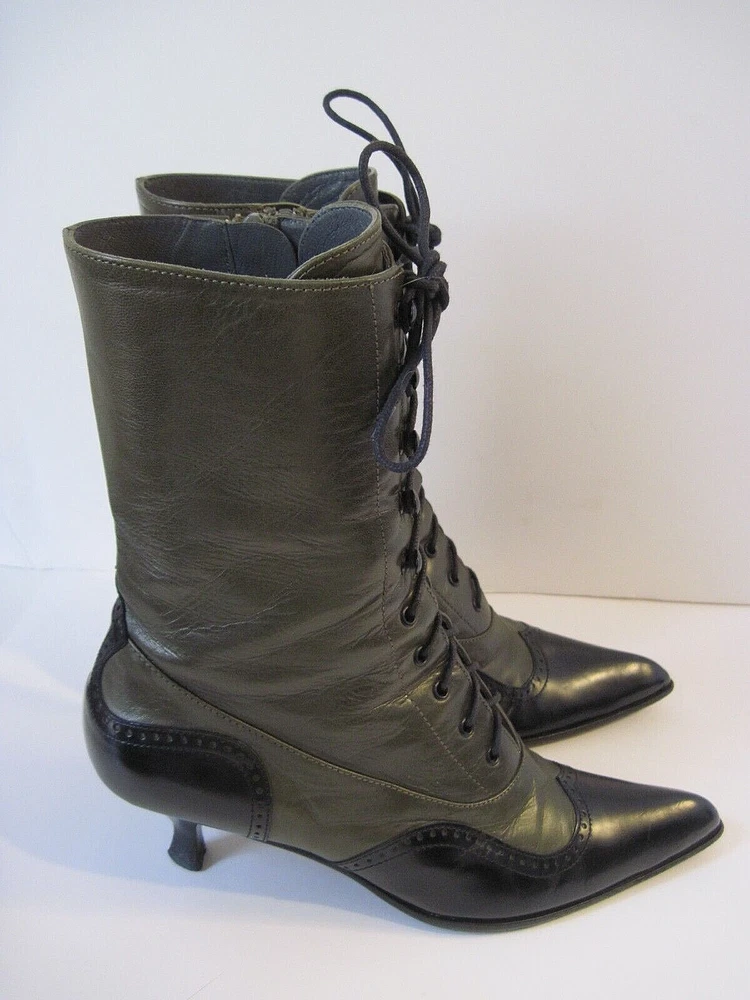 Elevate your shoe game with these vintage MIU MIU leather boots size 36 1/2. The wingtip design and pointed toe give these booties a classic and sophisticated look. The kitten heel is perfect for any occasion, whether it be casual or formal. The boots feature a zipper closure, making them easy to put on and take off. The green color and solid pattern make these boots a great addition to any winter, summer, fall, or spring wardrobe. The leather upper, insole, and outsole ensure durability and comfort. These mid-calf boots are perfect for women who want to add a touch of the 90s to their outfit. Gently used.