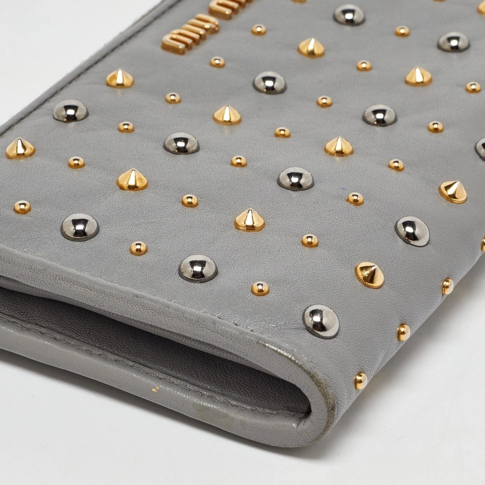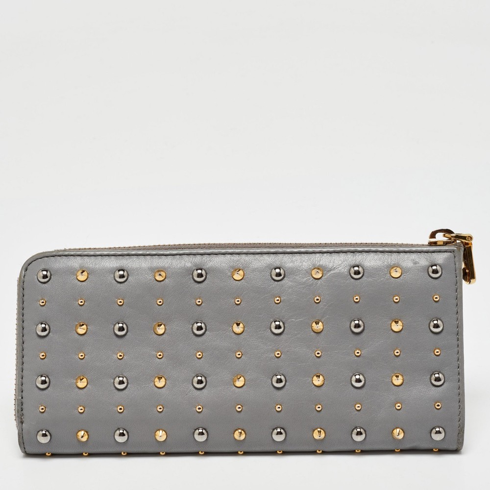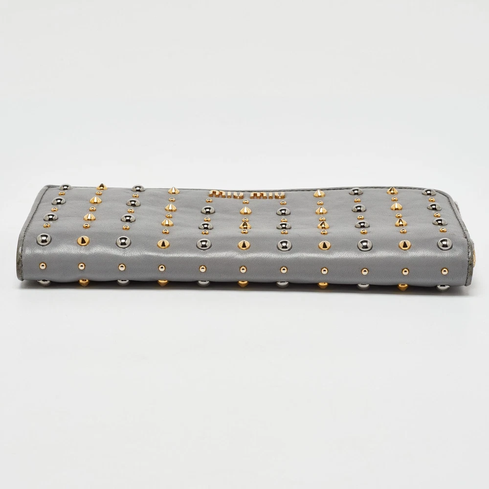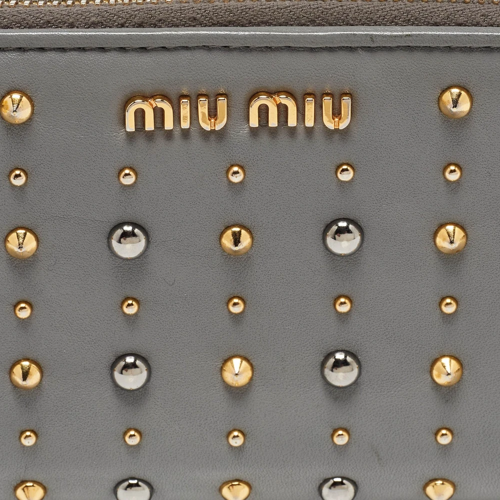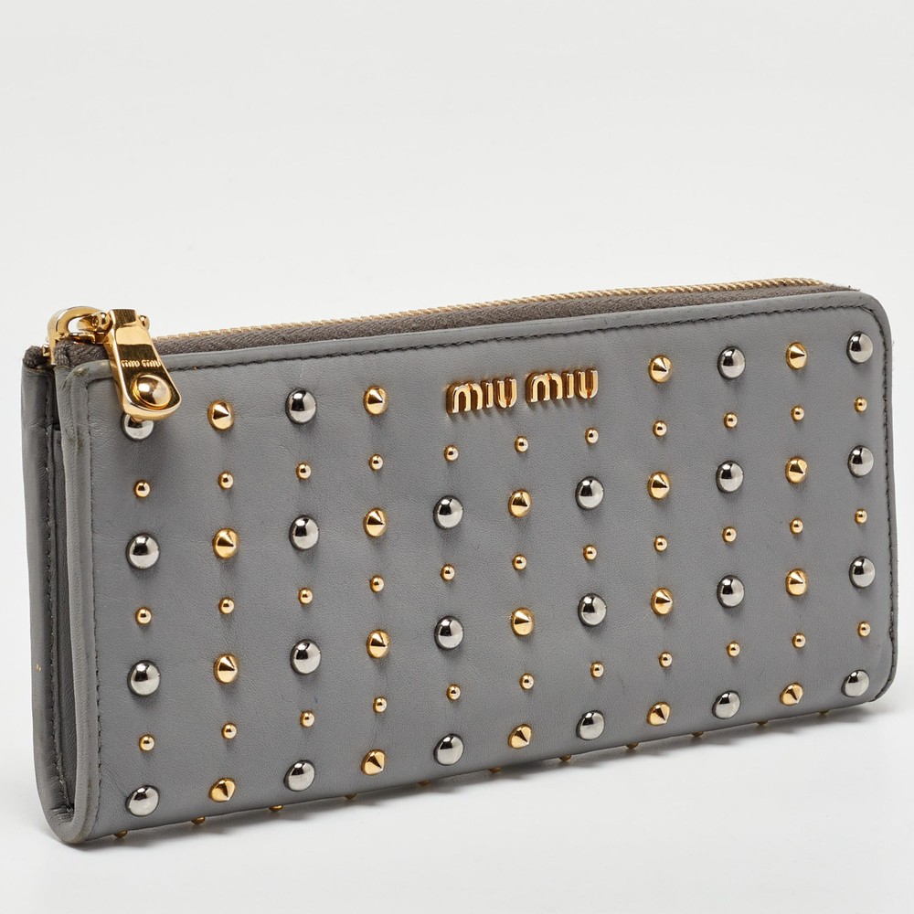 Give your monetary essentials a stylish home with this magnificent wallet from the house of Miu Miu. Durable and long lasting, this wallet is crafted from fine quality leather. A classic and catchy grey shade, as well as multiple stud details characterize this fine wallet.Certified by The Luxury Closet - This item has gone through a detailed authentication process overseen by our experts. We offer a lifetime guarantee of authenticity on all our items. Import duties, taxes and charges are not included in the item price. These charges are the buyers responsibility. Please check with your country’s customs office to determine what these additional cost will be prior to buying. Our eBay Store About Us Contact Us Add to Favorite Sellers Miu Miu Grey Leather Studded Zip Continental Wallet $134.2 Give your monetary essentials a stylish home with this magnificent wallet from the house of Miu Miu. Durable and long lasting, this wallet is crafted from fine quality leather. A classic and catchy grey shade, as well as multiple stud details characterize this fine wallet. Product Details Brand Color Grey Dimensions Height: 9 cm, Width: 2 cm, Length: 19.5 cm Material Leather Size Outsole Width Outsole Length Heel Height Includes The Luxury Closet Packaging Certified by The Luxury Closet This item has gone through a detailed authentication process overseen by our experts. We offer a lifetime guarantee of authenticity on all our items. How We Check The in-house team of experts at The Luxury Closet is highly trained to verify the authenticity and the condition of the luxury products. They ensure that only 100% authentic items are put on sale.The evaluation process is unique with its own mix of assessment criteria and differs according to the category. Each item is evaluated based on the following combination of hallmarks, hardware, stitching, symmetry, material, craftsmanship, stamping, codes, hologram stickers, and packaging. Our authenticators also check if the items have been modified or amended (e.g., aftermarket diamonds, replaced batteries, repaired bags, etc.) International Buyers Import duties, taxes and charges are not included in the item price. These charges are the buyers responsibility. Please check with your country’s customs office to determine what these additional cost will be prior to buying.