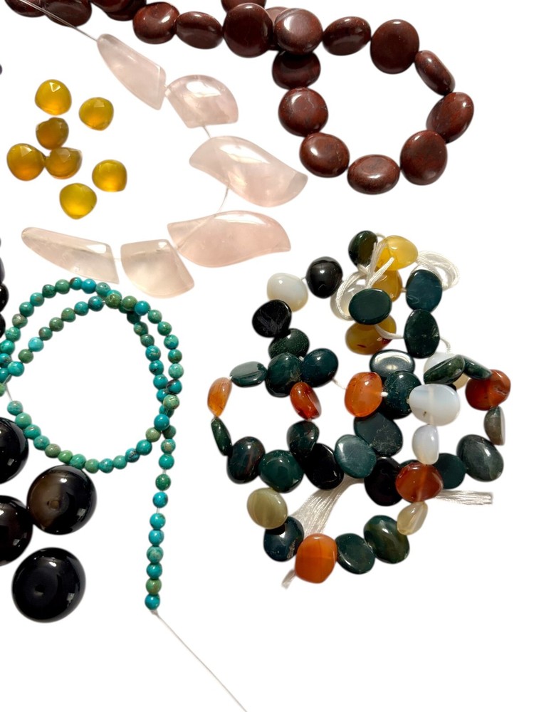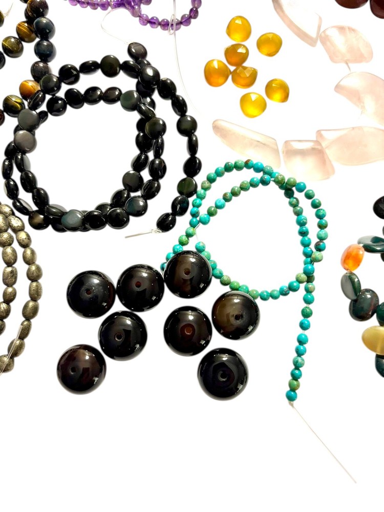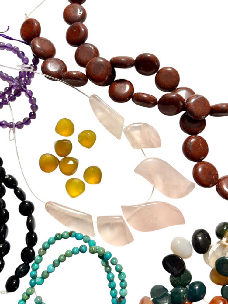 This product is a mixed lot of semi-precious gemstone beads, featuring a variety of vibrant colors. These beads, sourced from unused stock, offer a wide range of options for jewelry making. Suitable for creating unique and beautiful pieces of jewelry, this lot provides a versatile collection of gemstone beads for any creative project. Included in this lot are: Tigers eye Red Jasper Strand of mixed gemstone beads Rose Quartz Rainbow Obsidian Turquoise Amethyst Black Agate Chalcedony Pyrite