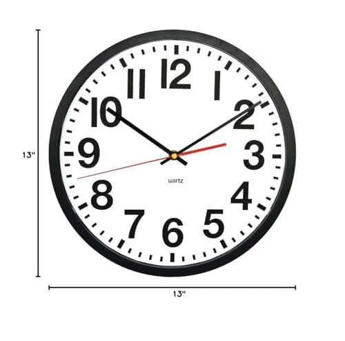This 13" commercial style clock is ideal for large rooms and work areas. It features a sturdy black plastic frame and the large, black numerals against the white dial make the clock easy to read, even from a distance. Includes a shatter-resistant flat lens which prevents the build-up of dust on the face. This clock uses AA battery, which is not included. A MODERN CLOCK FOR ANY SPACE: This black wall clock is a stylish and functional addition to any room LARGE WALL CLOCK FOR EASY READABILITY: The bold hands and numbering make for an easy read at any distance, perfect as office or classroom decor BATTERY OPERATED WALL CLOCK: This clock is battery operated, making it easy to install and maintain. Requires 1 AA battery - not included BLACK, SILENT WALL CLOCK: It's smooth and silent hands make for a non-distracting wall feature, allowing you to focus on your work DURABLE CONSTRUCTION: Frame is over 1 inch thick and includes shatter-resistant raised lens