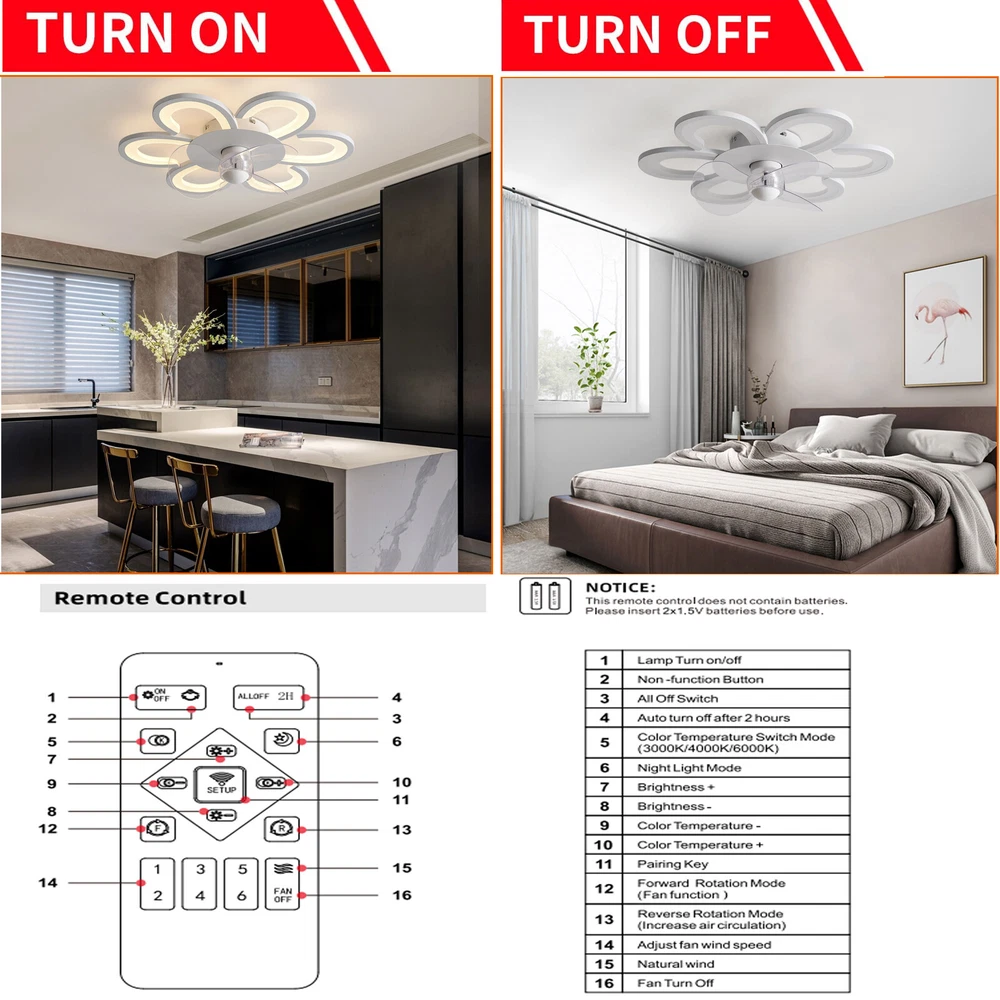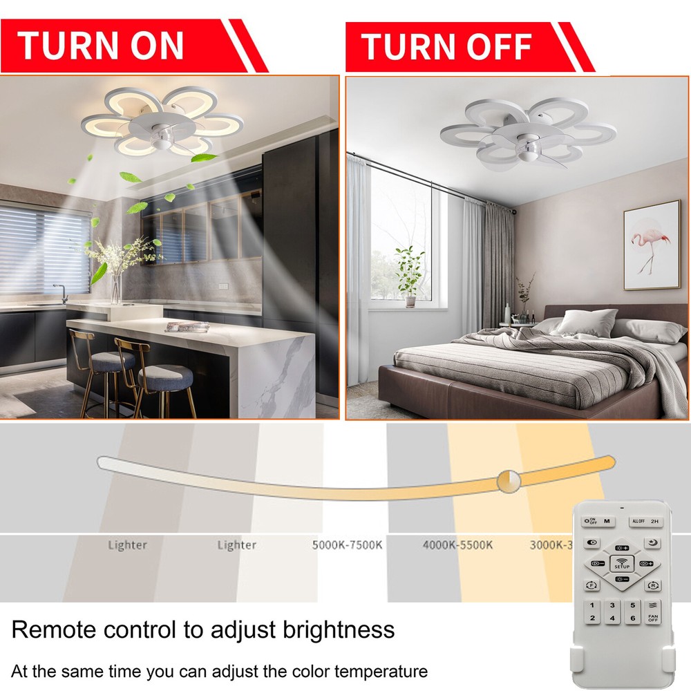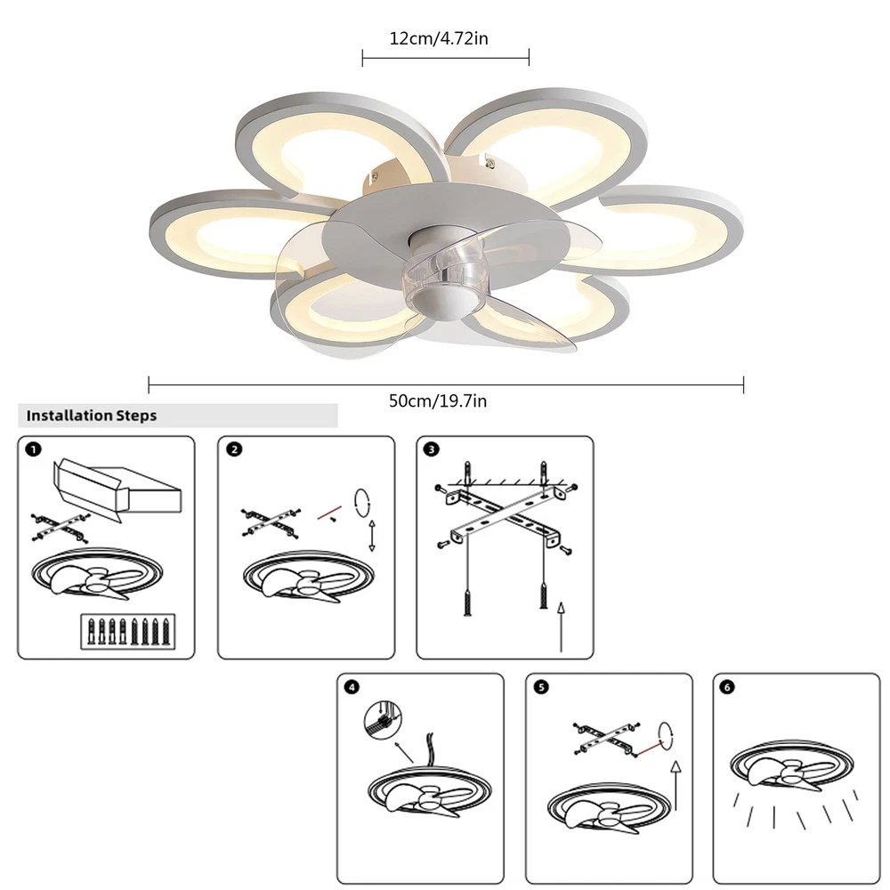 Modern Flush Mount Ceiling Fan Light 19.7” Dimmable LED Lamp 6 Speed w/ Remote Description This 2-in-1 ceiling fan light allows you to feel the bright light and enjoy the coolness at the same time. It has six gears of wind speeds with a timing&memory function to meet your daily usage needs. It can be integrated with different decoration styles and is ideal to create an excellent life and sleep environment to accompany you in all seasons. Key Features Elegant&Stylish Exterior: The six curved light strips and white color complement each other, making this product look like a blooming flower. It is elegant and luxurious to be a good decorative piece, which can blend in with different decor styles and add color to your room. Great Durability : The aluminum frame and iron chassis can resist heat, corrosion, shock, and deformation. The ABS fan blades and acrylic lampshade with high strength, good toughness, and good formability make its life be extended. Excellent Performance: The 3 fan blades and a pure copper motor can provide strong wind, which can not only improve the air circulation to keep the air fresh, but can also be used with air conditioners to balance the indoor temperature. Meanwhile, the reverse function can promote heat circulation in cold winters. 2-in-1 Function: The function of fanning and lighting can not only illuminate you but also reduce heat, which can save you a lot of space without extra installation. Low Brightness Mode: This function makes the light brightness about 10% of the total brightness, which can create warm and soft light to promote sleep quality. Timing&Memory Function: You can control its working hours in advance (2 hours). And when the fan light is turned on, it will restore the light color and brightness before the last time it was turned off without frequent settings. Adjustable Speed & Light: Its light color (white/neutral/warm) and brightness (from 10% to 100%) can be adjusted to meet different light requirements. With 6-speed wind speed, you can choose to enjoy comfortable breeze at low speed or fast cooling at high speed. LED Light Source: 6 eye-friendly LED light strips with a Ra of more than 80 and high brightness can create more natural and bright illumination without dazzling or flashing. Excellent Gift: The beautiful appearance and good practicality make it a great gift for parents, friends, and lovers on birthdays and holidays. Guaranteed Customer Service: We aim to provide quality products and services. If you have problems, please feel free to contact us. We will reply and solve the problem for you as soon as possible. Details Remote Control: It allows you to remotely control the timing, wind speed, etc, saving you lots of effort. Pure Copper Motor: It has stable performance, low-temperature rise, and low noise, bringing a better using experience. Application It is suitable for the living room, dining room, study bedroom, small bedroom, conference room, and other places of 10-15㎡/107-161ft². Specifications Model: MD1940 Color: White Material: Aluminium, Iron, Acrylic, ABS Style: Modern Motor Type: Pure Copper&Reversible Motor Number of Fan Blades: 3 Mounting Type: Ceiling Mount Rated Voltage: 85-265V Rated Power: 40+13W Type: US Standard Light Source Type: LED (Included) Number of LED Light Strips: 6 Light Color: White, Neutral, Warm Light Color Teperature: 3000K-4500K-6000K Ra: >80 Timing: 2h Efficiency: F Luminous Flux: About 2600-2800 Lumen Brightness: From 10% to 100% (Stepless Adjustment) Battery Type: 2* AAA Batteries (Not Included) Wind Speed Gears: 6 Suitable Area: 10-15㎡/107-161ft² Electric Fan Design: Ceiling Fan Room Type: Bedroom, Living Room, Dining Room Controller Type: Frequency Conversion Remote Control Product Length: 50cm/19.7inch Ceiling Cover Diameter: 12cm/4.72inch Package Included 1 * Ceiling Fan Light 1* Remote Control Other Accessories for Assembly Notes Please cut off the power supply when cleaning. Please note that the wall switch can only control the light. The light and fan can be turned off together when turning off the wall switch. The remote control doesn't include batteries. Please prepare two AAA batteries in advance. Please allow the slight color difference caused by the shooting light and 1-3cm error due to manual measurement, and make sure you do not mind before you order. Payment Delivery details Terms of sales About us Contact us Payment We accept ebay payment 。 Fees such as import duties, taxes are not included in the item price or shipping costs. These charges are the buyer's responsibility. Delivery details Shipping: 2-9 working days to: USA Terms of sales We maintain high standards of excellence and strive for hundred percent customer satisfaction. Feedback is very important to us. We hope that you contact us immediately before you give neutral or negative feedback, so that we can address your concerns. It is impossible to address issues if we do not know about them! About us Your satis faction is our ultimate goal. We work hard to earn your trust and future business. Our certified technicians have tested each item before shipping. The unit comes with 1 year limited warranty on all manufacturing defects. a) If you receive a defective item, you may return it or ask for a discount. Please contact us within 14 days after you receive the package. b) What you returned must be intact and in its original packaging as re? u. Customer is responsible for shipping costs of the returned item. c) We will cover the cost of shipping back t with the shipping rate indicated in the registration page. We will send you a new unit or refund the full payment you paid. Thank you. Contact us Business Hour Business Hour: Monday To Friday: 8:30 AM to 5:00 PM (Beijing China time) Due to time zones, our reply to your questions may not be immediately. But within above working time, we will reply your email within 24 hours. If it's non-workdays, please kindly be patient and wait till Monday. Please contact us with ebay 