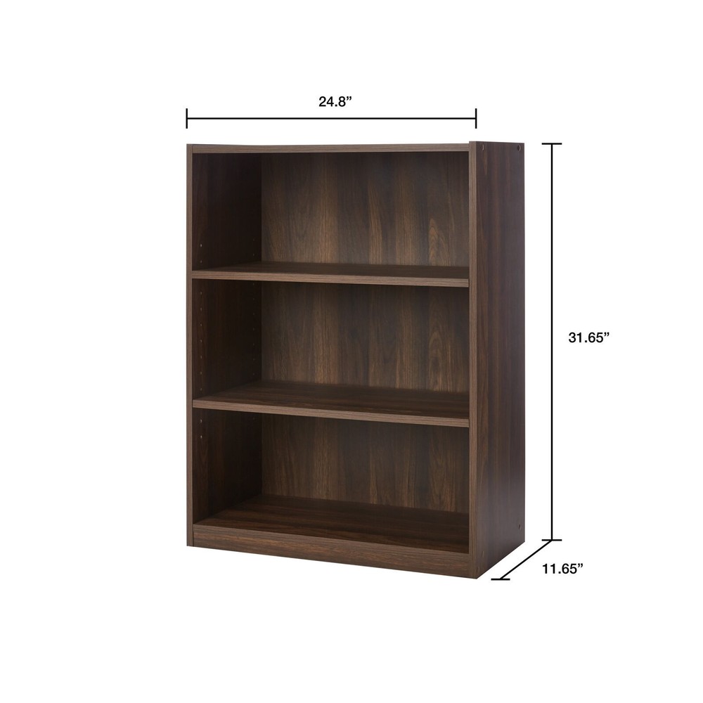 Add the sleek Mainstays 3-Shelf Bookcase to almost any room for a functional and stylish look. This sturdy storage unit has a closed-back design with one fixed shelf that holds up to 50 pounds, and two adjustable shelves that can support up to 35 pounds each. Easily and quickly assembled, this attractive bookshelf can provide a useful storage option for any office, living room, family room, den, or almost anywhere else. The Mainstays 3-Shelf Bookcase stands just over 31 inches tall and is perfect for small and medium rooms where smart, efficient storage is needed. The two adjustable shelves can accommodate everything from paperbacks to large folios to deliver a functional bookcase perfect for small libraries and collections. Sturdy bookcase with 2 adjustable shelves and 1 fixed shelf Sleek closed back design creates a gorgeous look and flexible storage for small spaces Rich Canyon Walnut Finish Top panel and adjustable shelves each support up to 35 lbs; bottom shelf supports up to 50 lbs Perfect for books, important papers and files, photography, small artwork, collectibles and more Materials: particle board, MDF, paperboard Easy to assemble with included instructions (hammer required) Assembled dimensions: 24.8" W x 1 1.65" D x 31.65" H On Dec 1, 2024 at 22:15:17 PST, seller added the following information: