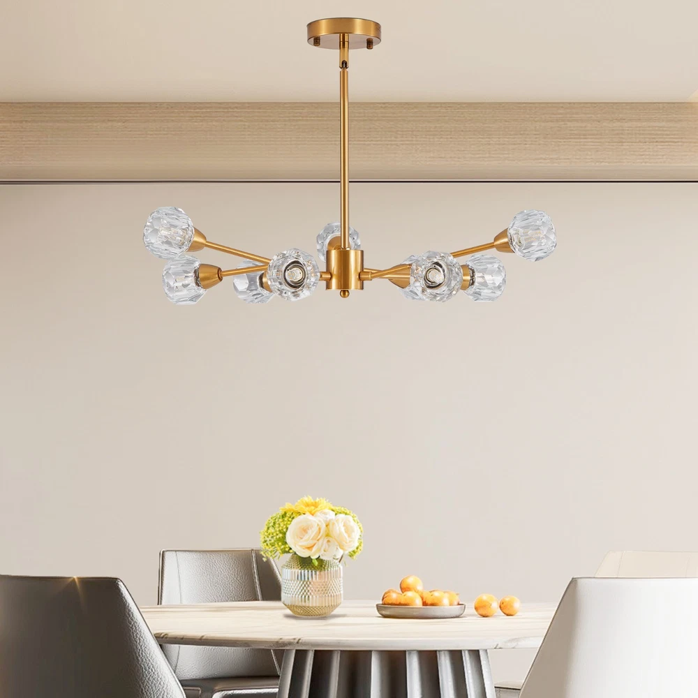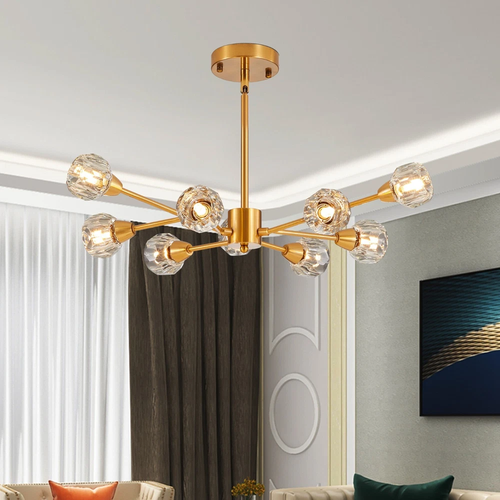 Specification Product Information Item Code: W1340P189548 Product Type: General Item Product Name: Modern Crystal Chandeliers, 9 Lights Golden Chandelier for Living Room Bedroom, Dining Room Chandelier Over Table, Kitchen Light Fixtures(Bulbs Not Included) Place of Origin: China Main Color: Golden Main Material: Iron Filler: Crystal Power Supply Mode: Hard-Wired Voltage: 120V Product Dimensions Assembled Length (in.): 27.60 Assembled Width (in.): 27.60 Assembled Height (in.): 5.90 Weight (lbs.): 9.60 Package Size Length (in.): 16.10 Width (in.): 13.40 Height (in.): 7.10 Weight (lbs.): 11.30 Product Features This light fixture is designed in globe crystal diamond shape with chrome lamp body; When you turn on the light, the lighting will reflect through the crystal, adding a romantic, fancy and shining atmosphere to your room. This modern chandelier combines modern style,recommended for dining room chandeliers over table,also this crystal chandeliers can be used for living room, bedroom,kitchen island,entryway bar and etc. This modern chandeliers cmpatible incandescent and halogen bulbs with G9 sockets(40W Max). Please note the bulb is not included. All the socket and wire of the crystal chandeliers are UL listed; All the accessories are included in the package, and we have detail installation instruction, please follow it to install. Description Modern Crystal Chandeliers, 9 Lights Golden Chandelier (Bulbs Not Included) This contemporary chandelier is constructed with a premium iron metal frame and carefully selected crystals, ensuring both durability and an opulent appearance that will elevate your home decor taste. While this chandelier does not come with bulbs included, it is compatible with various lamp types such as LED bulbs, incandescent bulbs, and energy-saving bulbs. This allows you the freedom to choose the most suitable light source for your needs. With detailed installation instructions and all necessary hardware provided, you can effortlessly complete the installation without requiring professional skills or assistance. This saves both time and money. Although this product does not contain light bulbs, it is recommended to match energy-efficient LED lamps to reduce electricity bills and reduce carbon emissions.