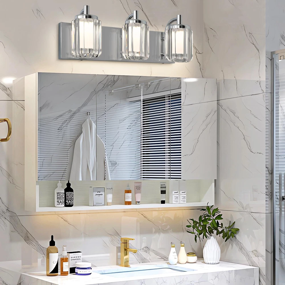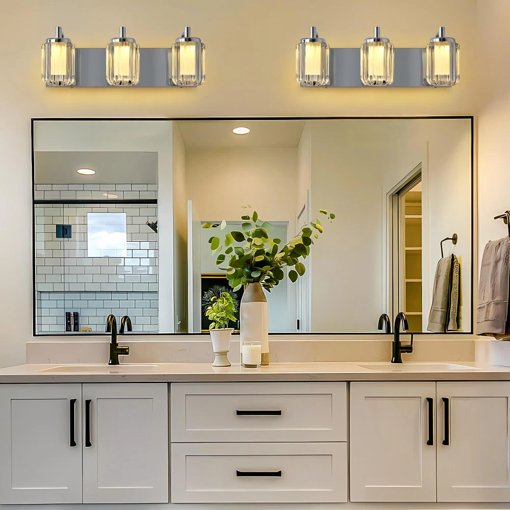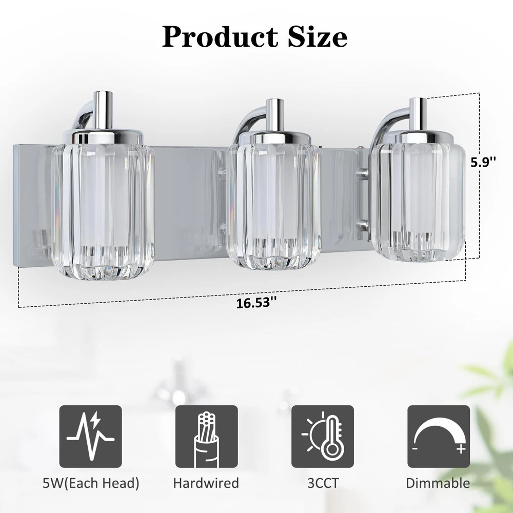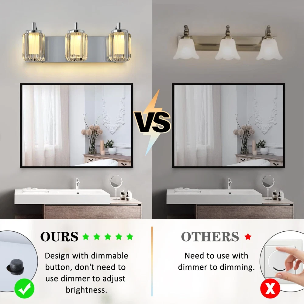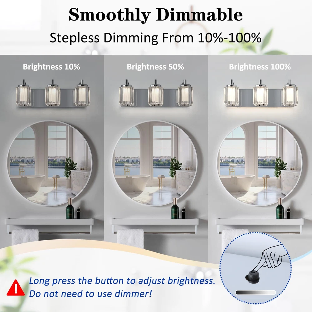 Three Color Changeable: Our bathroom light fixtures is with three colors temperature according to your need, there is a shift key on the top of the vanity lights, and freely choose warm white/cool white/day light temperature to meet your mood Unique Dimmable Design: Our this vanity light has a unique design that you can directly adjustable brightness through the button on the light fixture, long press the button to dimmable, don't need to use a dimmer or a dimmable switch, which is more convenient Energy Saving & Durable: Bathroom light over mirror designed with integrated LED light source, no bulb needed, color rendering index 80+, energy saving up to 90%. Reducing the hassle of frequent bulb replacements. Each light head can provides 400 lm brightness High-Quality Materiel: Led bathroom vanity light is made of high quality metal material and acrylic cover, the light is elegant and beautiful, through the shade can make the light is not harsh Up & Down Reversible Mounting: This bathroon light fixture can be installed facing upwards or downwards, perfect for you indoor bathroom fixtures as vanity lights for mirror, dressing table mirror lights for makeup, led lights for bathroom cabinet, restroom lights for vanity mirror, powder room wall light fixture, etc