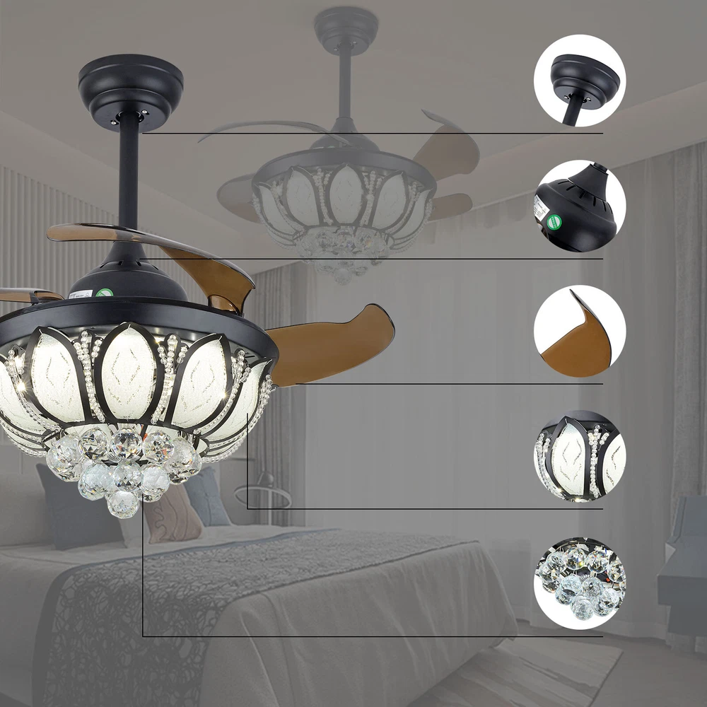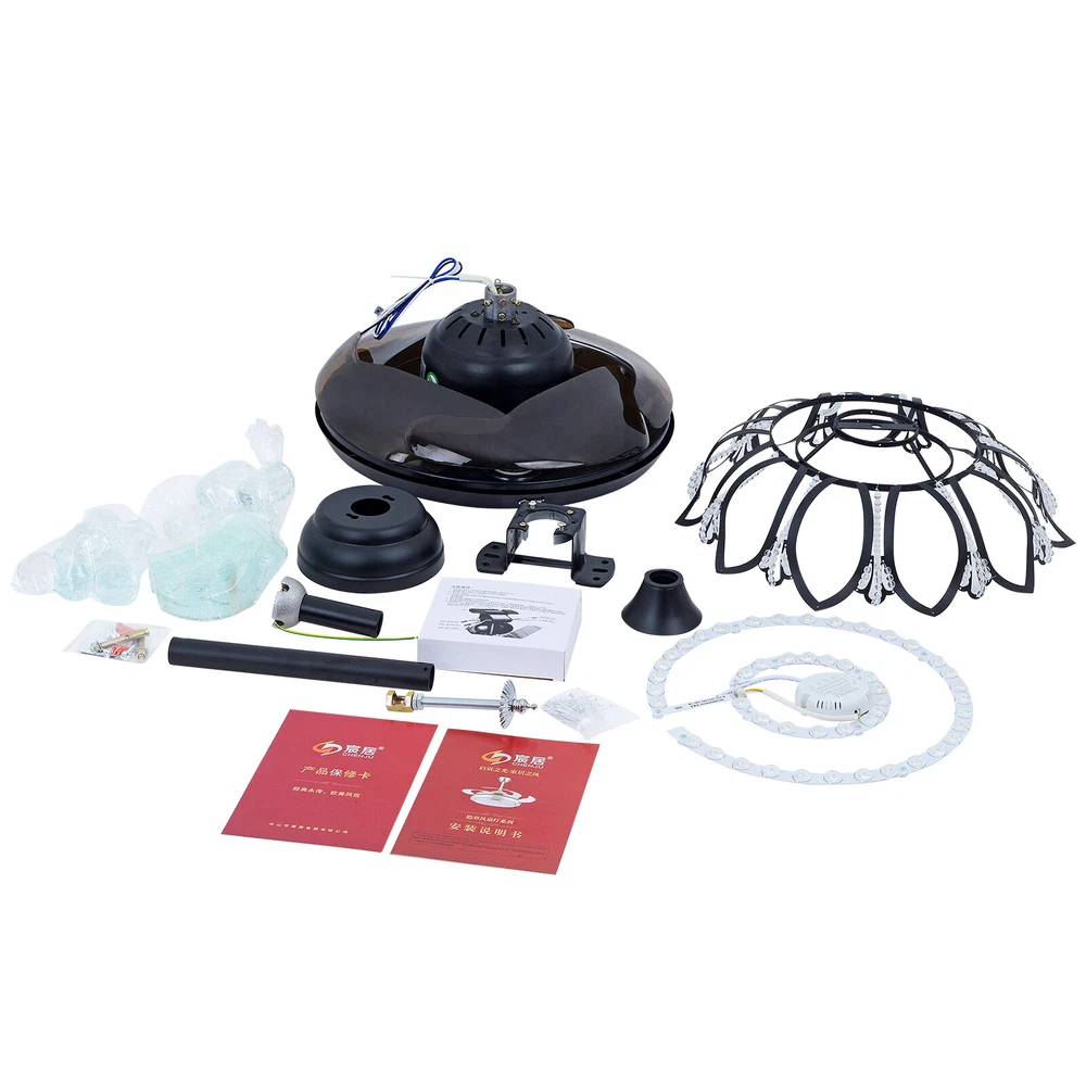 Package Included 1 * Ceiling Fan Light 2 * Suspension Rods 1 * Chinese Manual Other Accessories for Assembly Modern Invisible Ceiling Fan Light Dimmable Lamp W/Remote LED Crystal Chandelier Description Do you want to add a touch of vitality to your home? Explore our fan pendant light - a work of art that combines lighting, decoration, and practical functions. The remote control allows you to adjust brightness, light color, and wind speed, creating a warm atmosphere or enjoying a cool breeze, all under control. Exquisite crystal embellishment, showcasing extraordinary taste with the flow of light and shadow. Instantly ignite life inspiration! Key Features Good Materials: The product is made of acrylic, K9 crystal, and iron, which have been baking painted and polished to prevent fading, cracking, or rusting, and have a long service life. Excellent Lighting: The high transmittance lampshade, energy-saving LED light source(2200 lm), and warm, neutral, and cold light colors can provide soft and variable illumination modes, which take great care of your eyes and mood. Smart Control: You can set the timing function(1/2/4H) to have a comfortable sleeping environment and the 6-speed wind speed to experience the refreshing breeze or strong coolness through the convenient remote control, simplifying your daily routine and enhancing your overall living experience. Reversible Function: In addition to enjoying a cool environment in summer, you can also reverse the direction of the fan in winter, blowing hot air into the room from the top and increasing the room temperature. Low Noise: The pure copper motor makes the product operate at a noise level of less than 33dB, which is as quiet as a soft-speaking voice. This allows you to enjoy a peaceful and quiet environment. Thoughtful Design: When the fan function is turned on or off, the fan blades can automatically fold or open, which can avoid dust accumulation when the fan blades are not in use. High Adaptability: You can choose to install any of the 2 equipped lamp poles of 3.94" and 9.84" in height according to your needs and ceiling heights. Generous Outlook : It was crafted with clean and elegant lines and designed to be with simple black and white colors, and brilliant crystal balls that can fit most of the decoration styles in modern life. Details Stable Chassis: The 5.9" thickened and enlarged chassis ensures stronger load-bearing capacity and stability. Round Corners: The smooth and rounded corners along with the absence of sharp edges make installation and cleaning of this product a gentle and comfortable experience for your skin. Additionally, they also add to the overall aesthetic appeal of the product. Application This ceiling fan can be installed in various places that have a height of 8.53-10.17ft and require an illumination area within 129.17 ft² and air circulation, such as the living room, bedroom, kitchen, study, and hallway. Specification Material: Acrylic, K9 Crystal, Iron Process: Baking Paint, Polishing Color: Black+White Style: Modern Control Mode: Remote Control(Included) Motor Type: Pure Copper Motor Light Colors: Cold, Neutral, Warm Assembly Required: Yes Mount Type: Ceiling Mount Light Source Type: LED Battery Type: 2 * AAA Batteries (Not Included) Speed Gears: 6 Voltage: 110-120V Motor Power: 36-48W Light Power: 24W Efficiency: E Noise: ≤33dB Color Temperature: 3000-4500-6000K Lumen: 2200lm Brightness Adjustment Range: 5-100% Timing Range: 1/2/4h Memory Function: About 10s Remote Control Distance: Within 5m/16.4ft Lighting Area: Within 12m ²/129.17ft ² Applicable Room Height 2.6-3.1m/8.53-10.17ft Suspension Rods Length: 10cm/3.94in, 25cm/9.84in Base Diameter: 15cm/5.9in Fan Diameter (Unfolded): 92cm/36in Lampshade Size (D*H): 35*20cm/13.78*7.87in Overall Height: 45cm/17.72in, 56cm/22.05in Package Size: 55*55*39cm/21.65*21.65*15.35in Gross Weight: 11kg/24.25lbs Net Weight: 10kg/22.05lbs Package Included 1 * Ceiling Fan Light 2 * Suspension Rods 1 * Chinese Manual Other Accessories for Assembly Notes Please make sure that the size of the ceiling fan matches your room and carefully make a choice. Please make sure the power is cut off before installation and when you clean the light. The surface of the product and the electric wire should avoid scratching when mounting, and electric insulation gloves(not included) must be worn when installing. To ensure your safety, professional ones with an electric license are recommended to carry out the installation if possible. This product is suitable for flat-top concrete ceiling houses. If you want to install it on gypsum boards and wooden ceilings, you need to bring your own modified brackets. Please allow the slight color difference caused by the shooting light and 1-3cm error due to manual measurement, and make sure you do not mind before ordering. Payment Delivery details Terms of sales About us Contact us Payment We accept ebay payment 。 Fees such as import duties, taxes are not included in the item price or shipping costs. These charges are the buyer's responsibility. Delivery details Shipping: 2-9 working days to: USA Terms of sales We maintain high standards of excellence and strive for hundred percent customer satisfaction. Feedback is very important to us. We hope that you contact us immediately before you give neutral or negative feedback, so that we can address your concerns. It is impossible to address issues if we do not know about them! About us Your satis faction is our ultimate goal. We work hard to earn your trust and future business. Our certified technicians have tested each item before shipping. The unit comes with 1 year limited warranty on all manufacturing defects. a) If you receive a defective item, you may return it or ask for a discount. Please contact us within 14 days after you receive the package. b) What you returned must be intact and in its original packaging as re? u. Customer is responsible for shipping costs of the returned item. c) We will cover