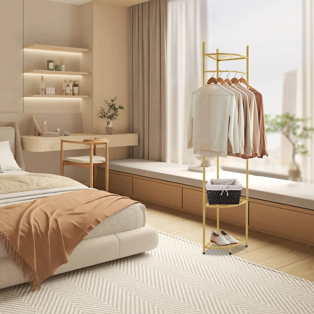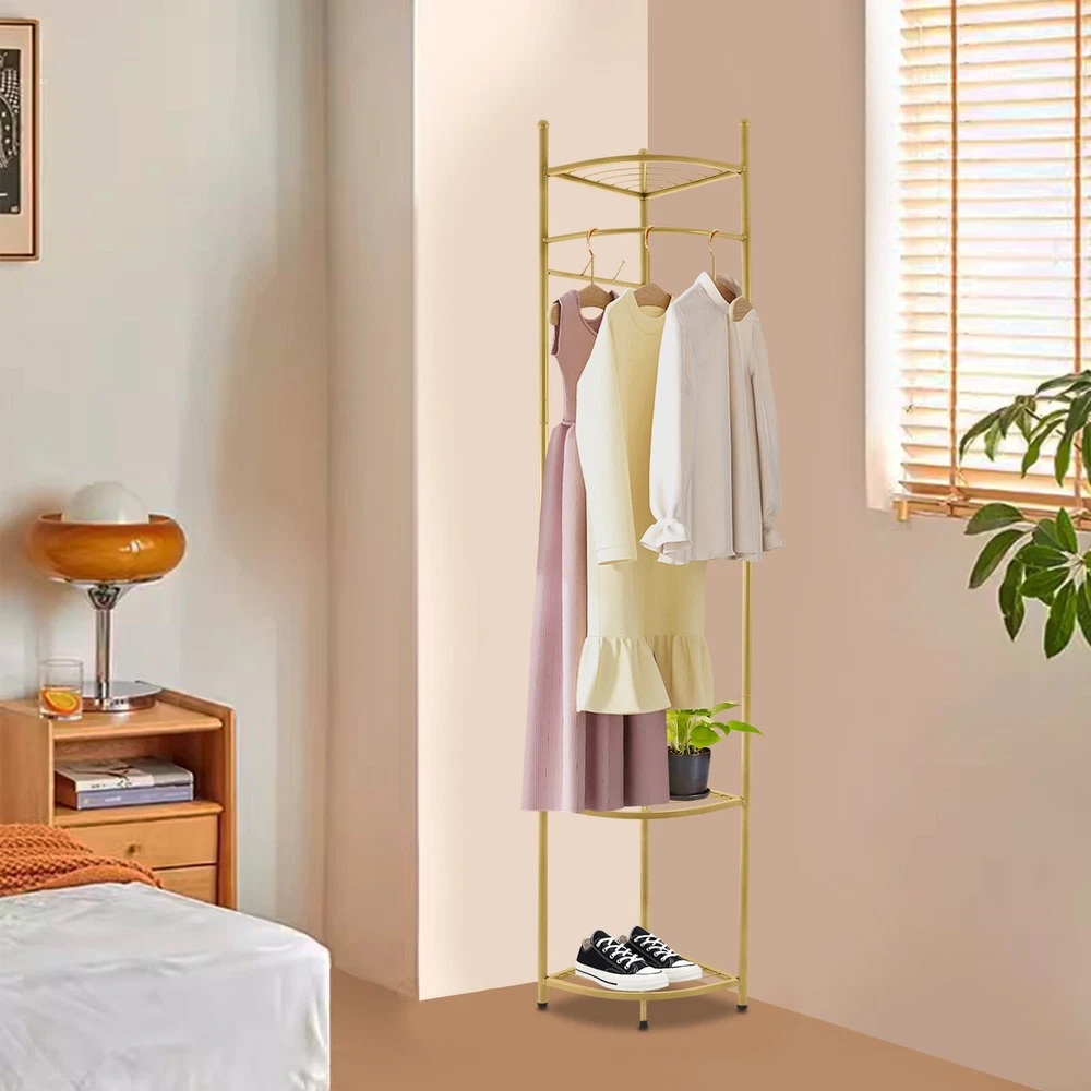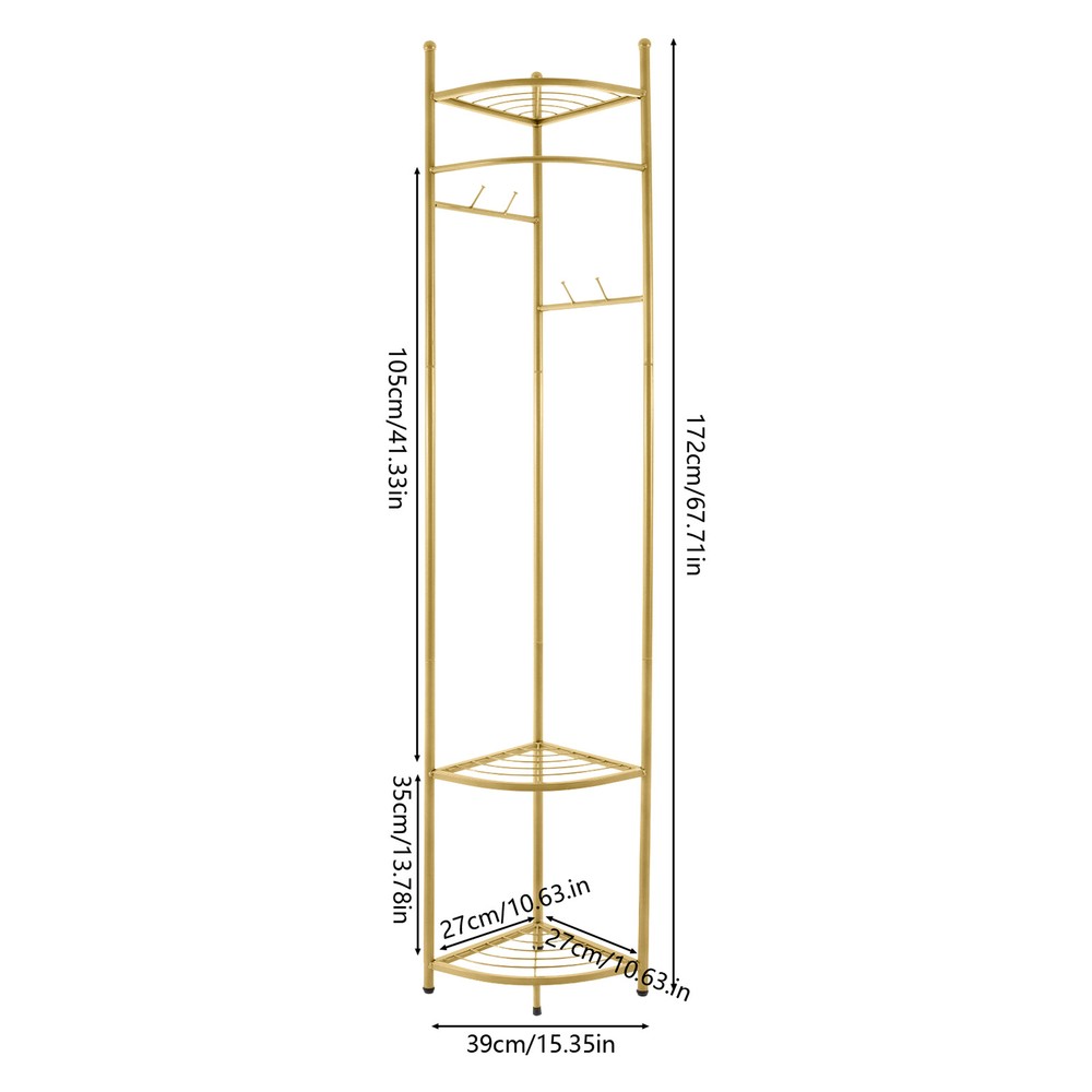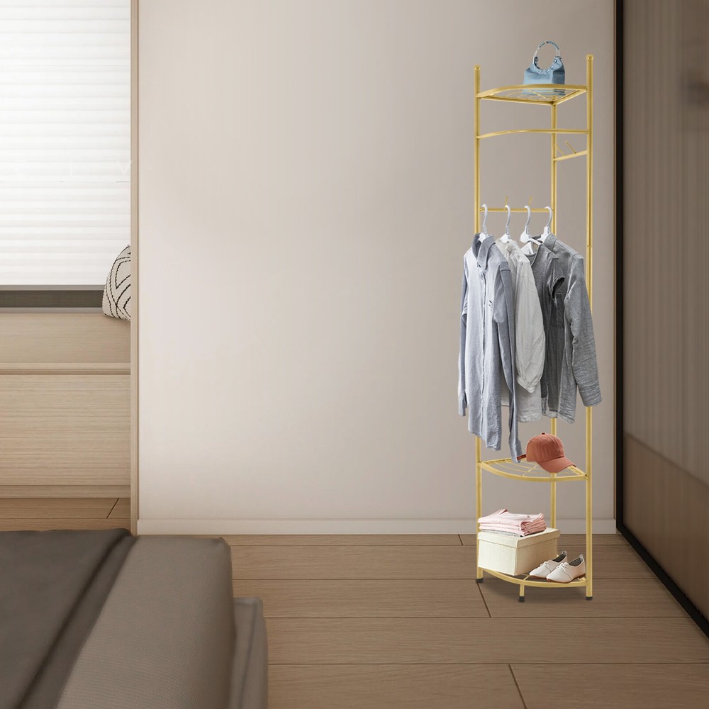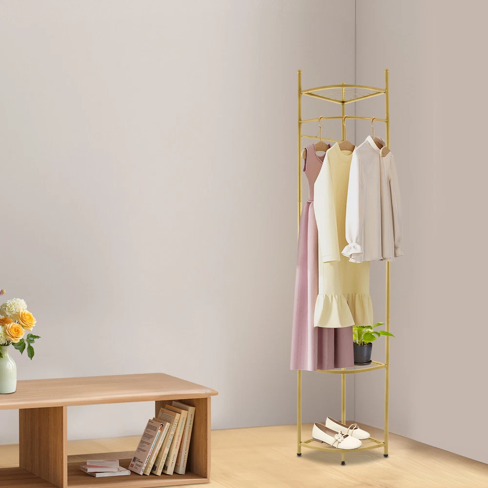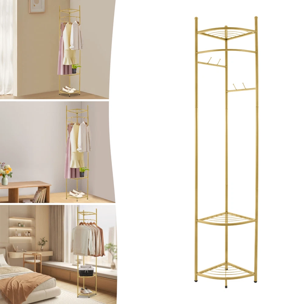 WELCOME Description Are you still struggling with the clutter of clothing organization? Our corner coat rack can solve this problem well. The combination of high-quality material and exquisite craftsmanship makes it sturdy and durable. With its generous appearance, it can easily blend into various places. It can not only be used to hang clothes but also to store items. Take this practical product home quickly! Key Features Build to Last: Made of carbon steel with a baking paint process, this product is impact-resistant , wear-resistant , and corrosion-resistant , ensuring your long-term use. Strong Load-bearing Capacity: High-quality material and sturdy structure make this product capable of bearing up to 22.05 lbs , allowing you to use it with confidence. Storage Assistant: The top fan-shaped shelf and two fan-shaped shelves at the bottom allow you to place shoes, storage boxes (all are not included), and other items. The hanging rod can be used to hang clothes. Four hooks can be used to hang clothes, bags, scarves (all are not included), etc. Space-saving: The fan-shaped structure can be tightly attached to the wall, allowing it to be placed in the corner without taking up too much space. Thoughtful Design: The reasonable hanging height ( 41.34 in ches) allows you to hang long and short clothes. Vertical hooks can prevent hanging objects from falling off. Simple Installation : The simple structure and complete accessories allow you to quickly assemble this product and enjoy the pleasure of installation. Easy to Clean: It has a smooth surface and a simple structure, so you only need to wipe the dust with a towel (not included) regularly. Ideal Gift: This practical product can be used as an ideal housewarming, birthday, and holiday gift for parents, friends, and loved ones. Customer Service: We stand behind all our guests and look forward to assisting you with your purchase. It is our pleasure to answer your confusion and questions. The end of the story between us is definitely not "we sell and you buy". Details Protective Foot Pads: 4 protective foot pads can reduce bottom wear and prevent scratching the floor. Open Structure: It allows you to easily hang clothes and retrieve items. Application It is suitable for corridors, entrances, bedrooms, living rooms, offices, etc. It can be used to store clothes, shoes, bags, etc. Specification Color: Golden Style: Modern Material: Carbon Steel Process: Baking Paint Number of Fan-shaped Shelves: 3 Number of Hooks: 4 Load-bearing Capacity: 10kg/22.05lbs Assembly Required: Yes Mounting Type: Free Standing Product Size: 39*172cm/ 15.35*67.71in Hanging Area Height: 105cm/41.34in Package Size: 62*32*32cm/ 24.41*12.6*12.6in Gross Weight: 3.5kg/ 7.72lbs Net Weight: 3kg/ 6.61lbs Package Included 1* Corner Coat Rack All Accessories for Assembly Notes Please pay attention to placing heavier items at the bottom as much as possible to ensure that many clothes are hung. Please note that this product does not include clothing, shoes, bags, etc. Please allow the slight color difference caused by the shooting light and 1-3 cm error due to manual measurement, and make sure you do not mind before ordering. Payment Delivery details Terms of sales About us Contact us Payment We accept ebay payment 。 Fees such as import duties, taxes are not included in the item price or shipping costs. These charges are the buyer's responsibility. Delivery details Shipping: 2-9 working days to: USA Terms of sales We maintain high standards of excellence and strive for hundred percent customer satisfaction. Feedback is very important to us. We hope that you contact us immediately before you give neutral or negative feedback, so that we can address your concerns. It is impossible to address issues if we do not know about them! About us Your satis faction is our ultimate goal. We work hard to earn your trust and future business. Our certified technicians have tested each item before shipping. The unit comes with 1 year limited warranty on all manufacturing defects. a) If you receive a defective item, you may return it or ask for a discount. Please contact us within 14 days after you receive the package. b) What you returned must be intact and in its original packaging as re? u. Customer is responsible for shipping costs of the returned item. c) We will cover the cost of shipping back t with the shipping rate indicated in the registration page. We will send you a new unit or refund the full payment you paid. Thank you. Contact us Business Hour Business Hour: Monday To Friday: 8:30 AM to 5:00 PM (Beijing China time) Due to time zones, our reply to your questions may not be immediately. But within above working time, we will reply your email within 24 hours. If it's non-workdays, please kindly be patient and wait till Monday. Please contact us with ebay message. Please feel free to contact us if you have any questions. Monday To Friday: 8:30 AM to 5:00 PM (Beijing China time) Due to time zones, our reply to your questions may not be immediately. But within above working time, we will reply your email within 24 hours. If it's non-workdays, please kindly be patient and wait till Monday. Please contact us with ebay message. Please feel free to contact us if you have any questions.