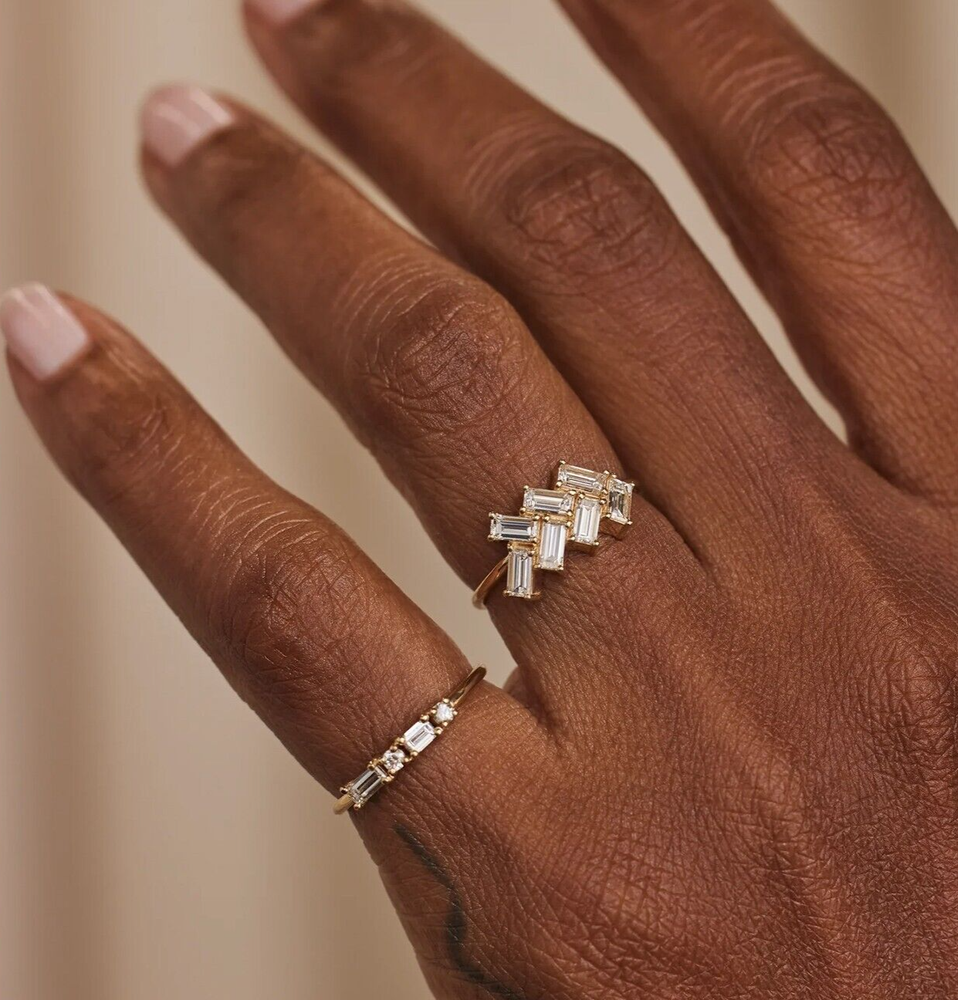Stunning and contemporary baguette moissanite ring featuring a unique geometric design. This eye-cast and set in a 925 sliver band. The modern design creates a striking visual impact, perfect for those who appreciate distinctive jewelry ELEGANT LOOK! GREAT SHINE! Metal : stamped 925 sterling silver Finish :yellow gold Band Width : 2mm Weight : Approx. 2.5 gms Ring Size: US-7 This ring is handcrafted with utmost care. Would make an ideal gift for someone special. The stone has excellent cut and luster. Comes in attractive packaging. CERTIFICATE OF AUTHENTICITY PROVIDED Shipping : Shipping is by UPS/SPEEDPOST/FEDEX or similar shipping agencies to reach you in 9-12 business days after processing the order. Tracking is provided. Please note: Jewelry items can take up to 10-12 business days to process to take care of ring sizing if any, polishing, finishing, packing and handling, certification, documentation etc. Shipping Charges include eBay fees on Shipping, packaging, certification costs, manpower costs, overheads, taxes etc. in addition to actual courier/postal expenses which have increased substantially as a result of pandemic & global economic conditions. We do not artificially increase the price of the products to include shipping charges but only charge what shipping actually costs us. Combined Shipping: Combined shipping discount is available up to 5 (Five)items in an order to be purchased within 5 days. You can continue to buy- Any additional items above 5 in quantity will be considered a new order. This is to avoid pilferage en-route as well as to ensure that you are happy with the merchandise. Once you have received their items you may buy additional items again. This limit may be revised for repeat and regular customers. Payment: Buyers are requested to pay within 3 (Three) days of purchases. eBay will automatically open unpaid item cases in case payment is not received within this period. The item will also be available for purchase to other buyers till such time that the payment is received. Customs and Taxes: Any customs duties, charges and local taxes are subject to local laws and vary from country to country and hence the payment of any eventual custom duties, charges, levies and taxes etc will be at the buyer's expense. We do not have any control on the same. Returns & Refunds: You can return the item within 14 days of receiving the parcel. - Please return in original packing. Buyers are required to check and ensure that the item/s are in good condition and as per item listing on eBay as no claims for returns and refunds will be entertained thereafter. The returned item should be unused and in original and undamaged condition. Buyer will be required to ensure that the item is sent by trackable shipper. Shipping charges are non-refundable. Refunds are made by PayPal and may take up to 5-7days after receiving back the product/s. Disputes: We aim to settle all disputes amicably. Please do not open any dispute on eBay for dis-satisfaction or for non-receipt or to return an item. We are available through ebay messages system and most messages are replied in a few hours. Personalized satisfaction is of utmost importance to us. Feedback: We always provide excellent feedback to our buyers and expect the same in return with 5-star ratings. In case of any dissatisfaction or any other reason please do contact us before leaving any neutral or negative feedback - we will strive our best to resolve all issues to your satisfaction. Metal: silver is 925 Streling Silver with Nickel Free Rhodium Plating. Please refrain from buying if you have allergic reaction to metals. We will not be responsible for any health problems in this regard. Legal Disclaimer: Refund or any claim liability for the buyer is only limited to the value of the item purchased. No additional claims will be entertained for any other reason whatsoever. Please note that since various labs may have different testing methods and the interpretation of all our Diamonds and Stones may differ from one lab to another as well as from one Gemologist, appraiser and Jeweler to another, we will be unable to accept another Lab Certificate or the judgement of any other third party including any Gemologist, appraiser, Lab, Jeweler etc. By consenting to buy our items it is understood that you have read, understood and agree to the terms and conditions as well as the FAQ for the Diamonds and Jewelry being sold buys. What Guarantee do you offer? We offer full100% Money Back Guaranteed in case of any manufacturing defect. Please also refer to the Refund Policy as mentioned our item listing.