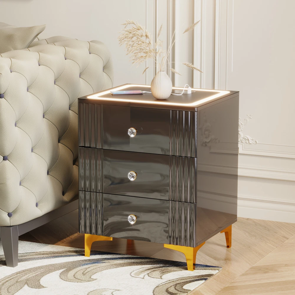 This nightstand is a game-changer for my bedroom! The built-in charging station keeps all my devices powered up—phone, watch, and earbuds charge effortlessly with USB, Type-C, and wireless options. The LED lights are super handy, turning on automatically when I approach and shutting off when I leave. The sleek high-gloss finish and glass top add a modern touch, while the three spacious drawers keep my essentials neatly organized. The crystal handles are a stylish bonus. Perfect blend of function and style—love it!
